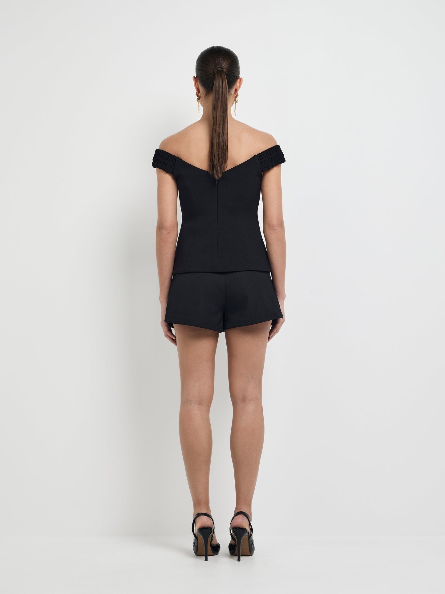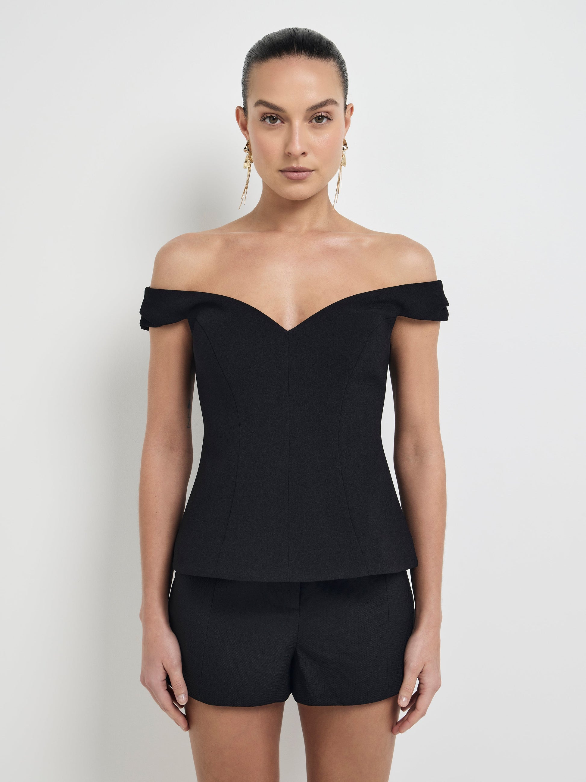 Turn heads in the Noelle Top, a glamorous off-shoulder design crafted from luxe bonded fabric with a hint of stretch for a sculpted, flattering fit. With its elegant neckline, fitted bodice, and subtle detailing, it's the perfect statement piece for evening events, cocktail parties, or any special occasion.