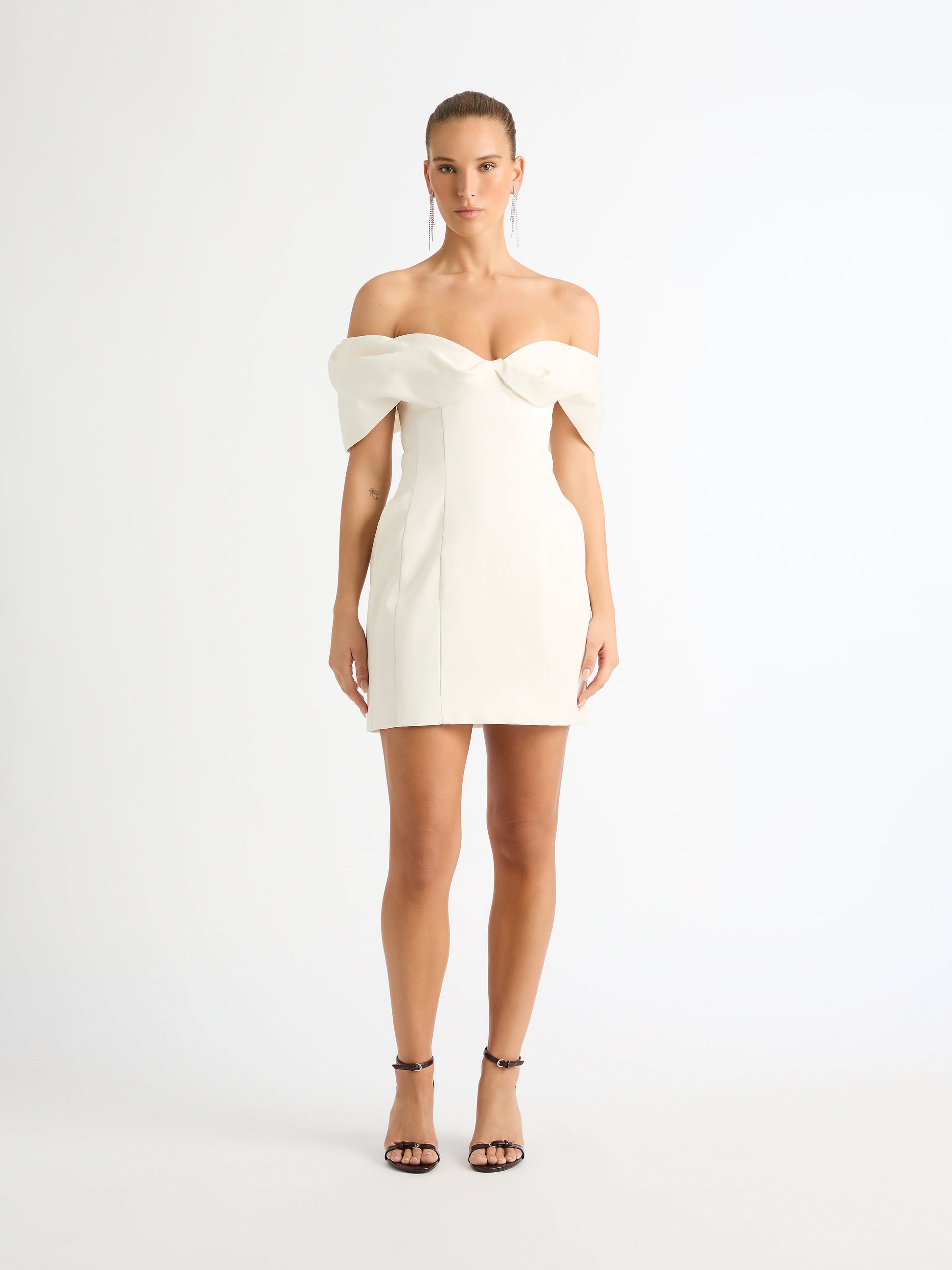 Instilled with elements of exaggerated silhouettes and structured shapes, the Nour Mini Dress is a power piece designed to stand the test of time. Showcasing a white woven fabrication, fitted styling, off the shoulder straps with pleating at the bust, side seam pockets and a mini skirt length this little white dress is destined for every wardrobe. Pair with the Dina Diamante Earrings to complete the look!