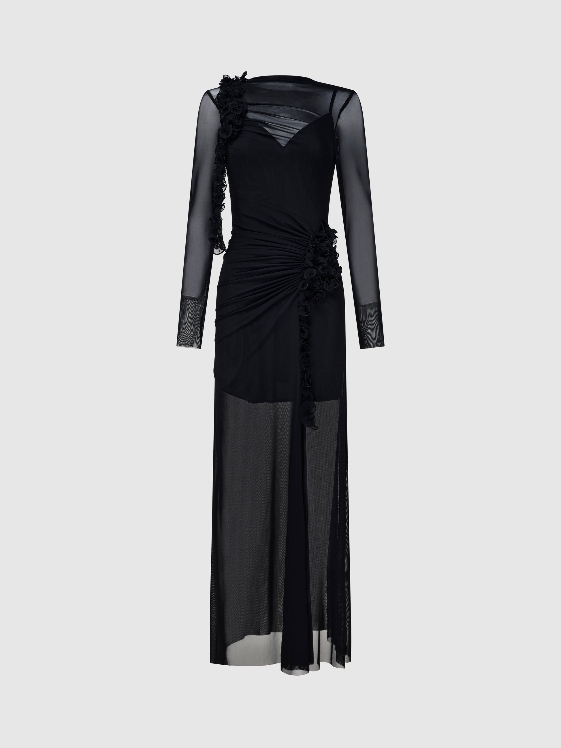 Elegant and effortlessly striking, the Odesse Dress is a black maxi designed to captivate from every angle. Crafted from stretch mesh with a fit-and-flare silhouette, it features a dramatic high cowl neckline, waterfall draping at the waist, and statement circular flounce trims. Pair with the Quinn Bag and Francesca Earrings to complete the look.