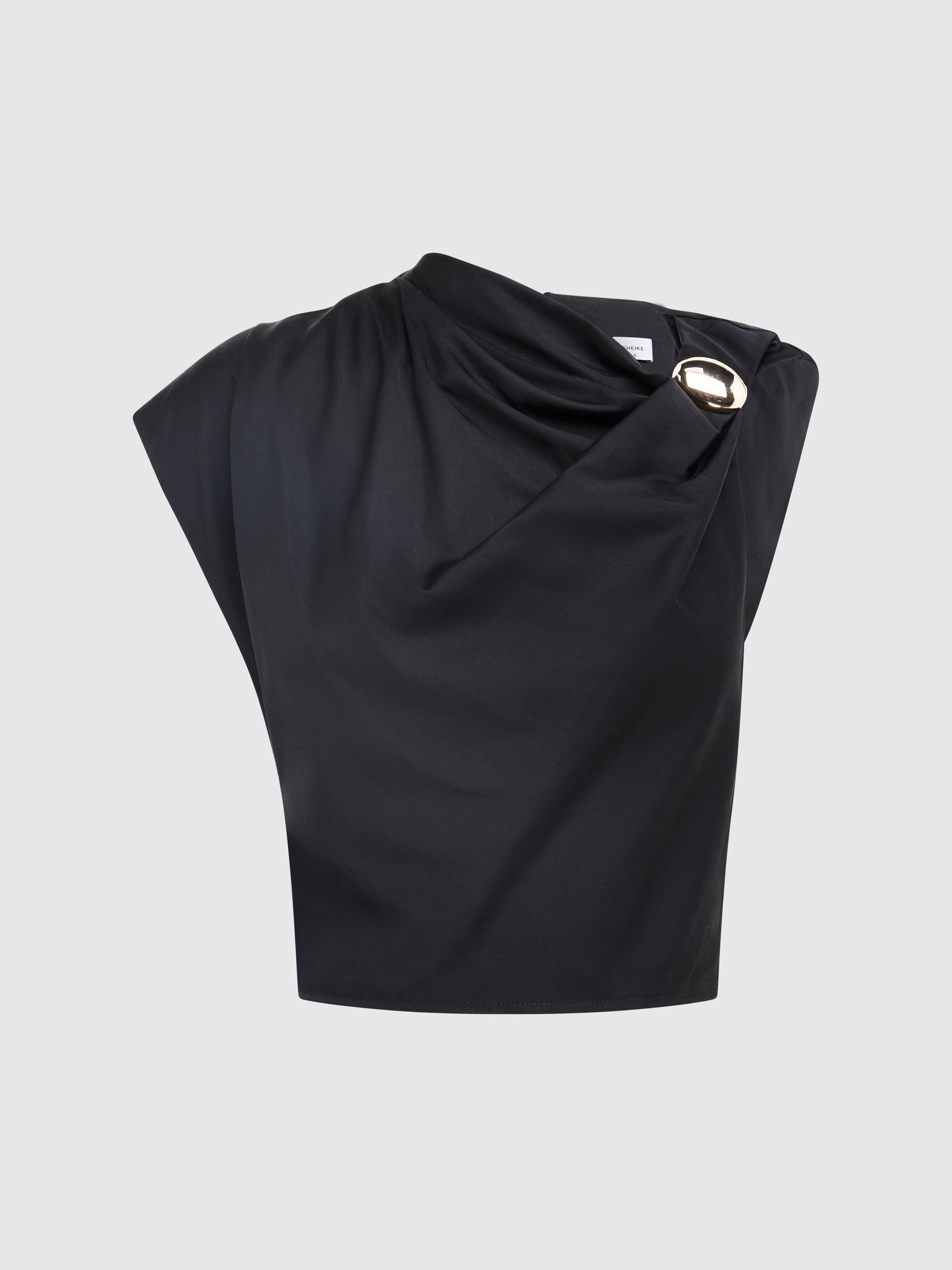 Effortlessly elevate your wardrobe with monochrome tones. Introducing our Olivia Top - showcasing a Cotton Spandex blend fabrication, fitted crop style, asymmetrical neckline with gold hardware detail, one shoulder has cap sleeve and invisible side seam zip at hem. Pair with our matching Olivia Skirt to complete the look.