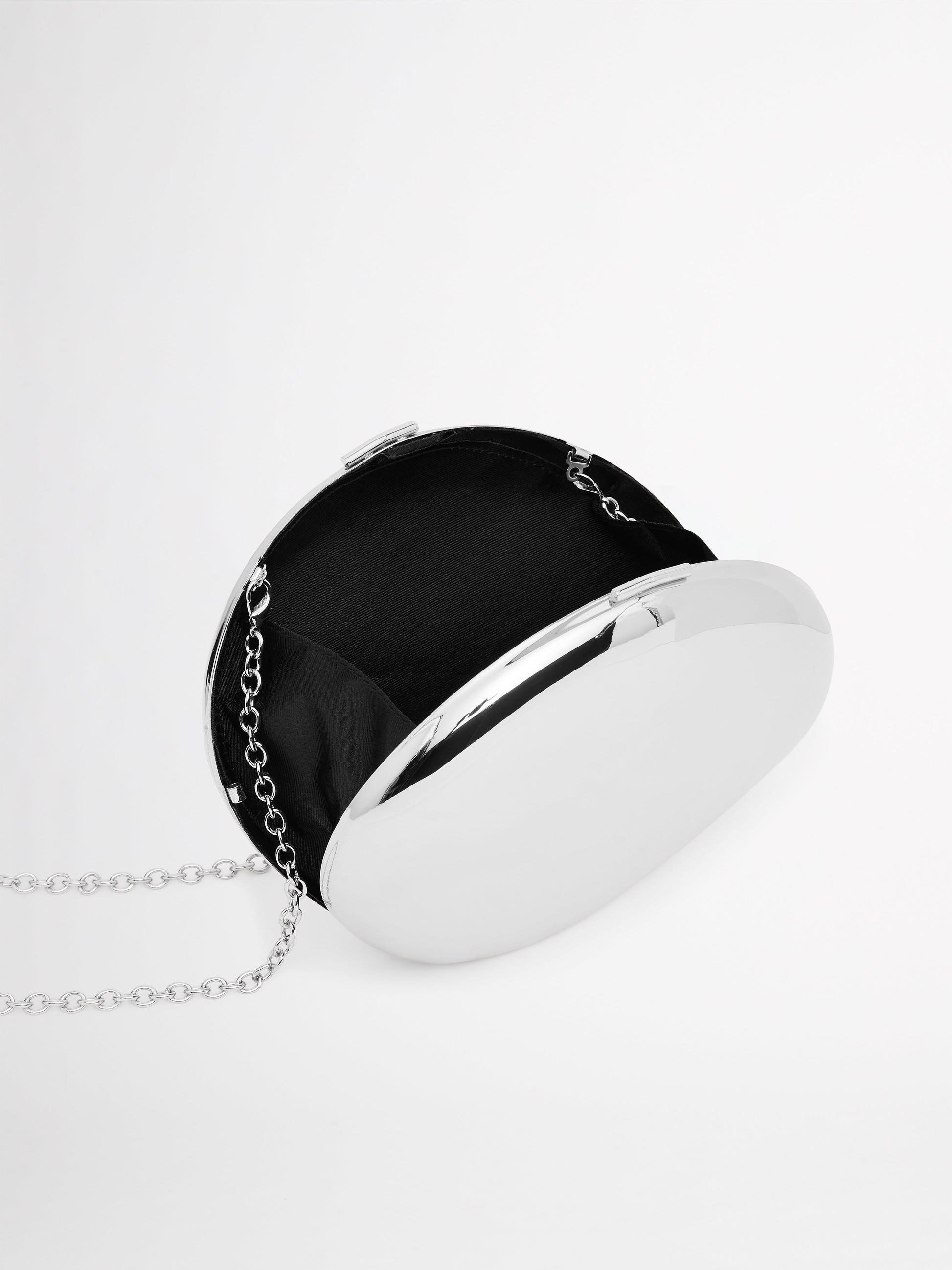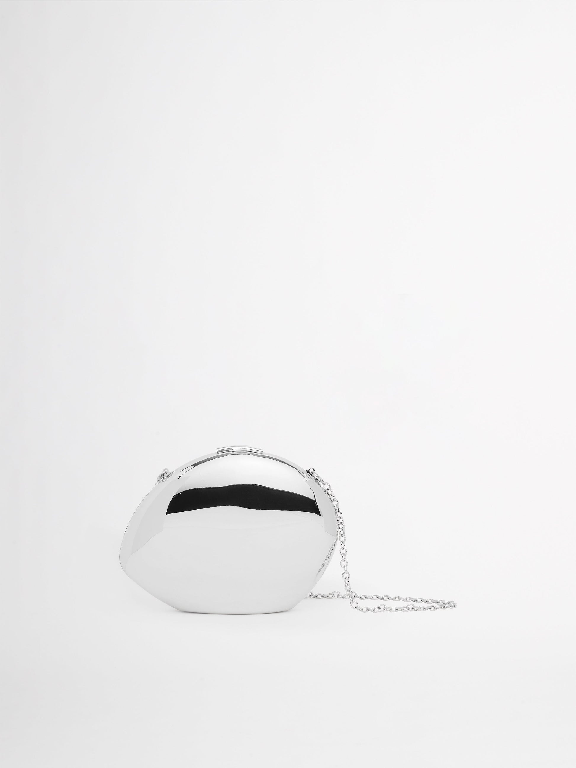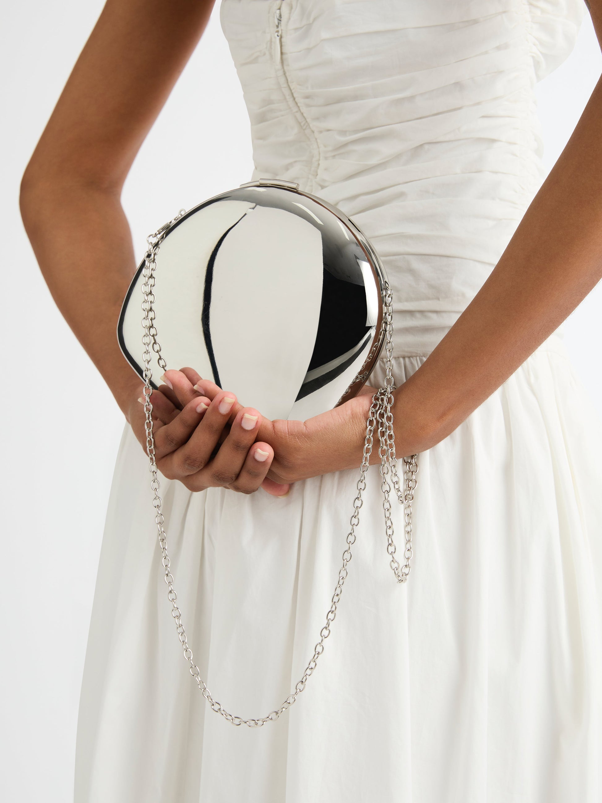 Elevate your look and add a touch of silver to your outfit with the Oracle Clutch. Featuring a mirrored finish and detachable chain strap.