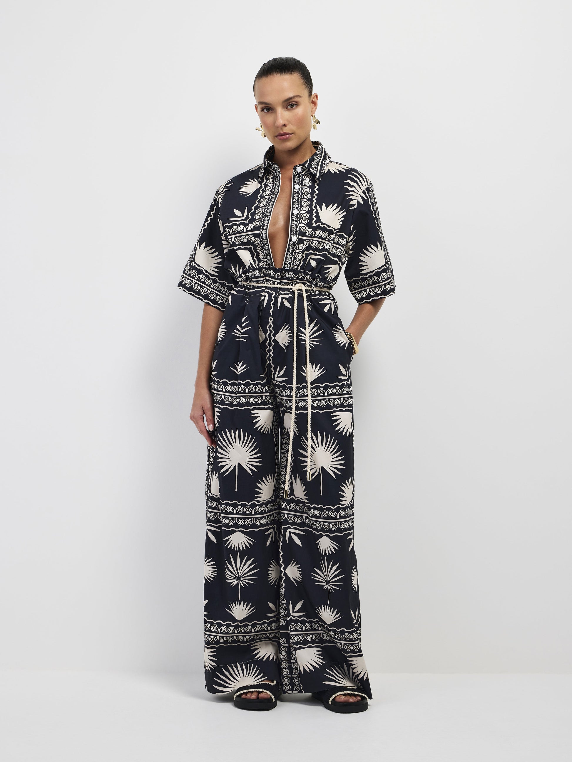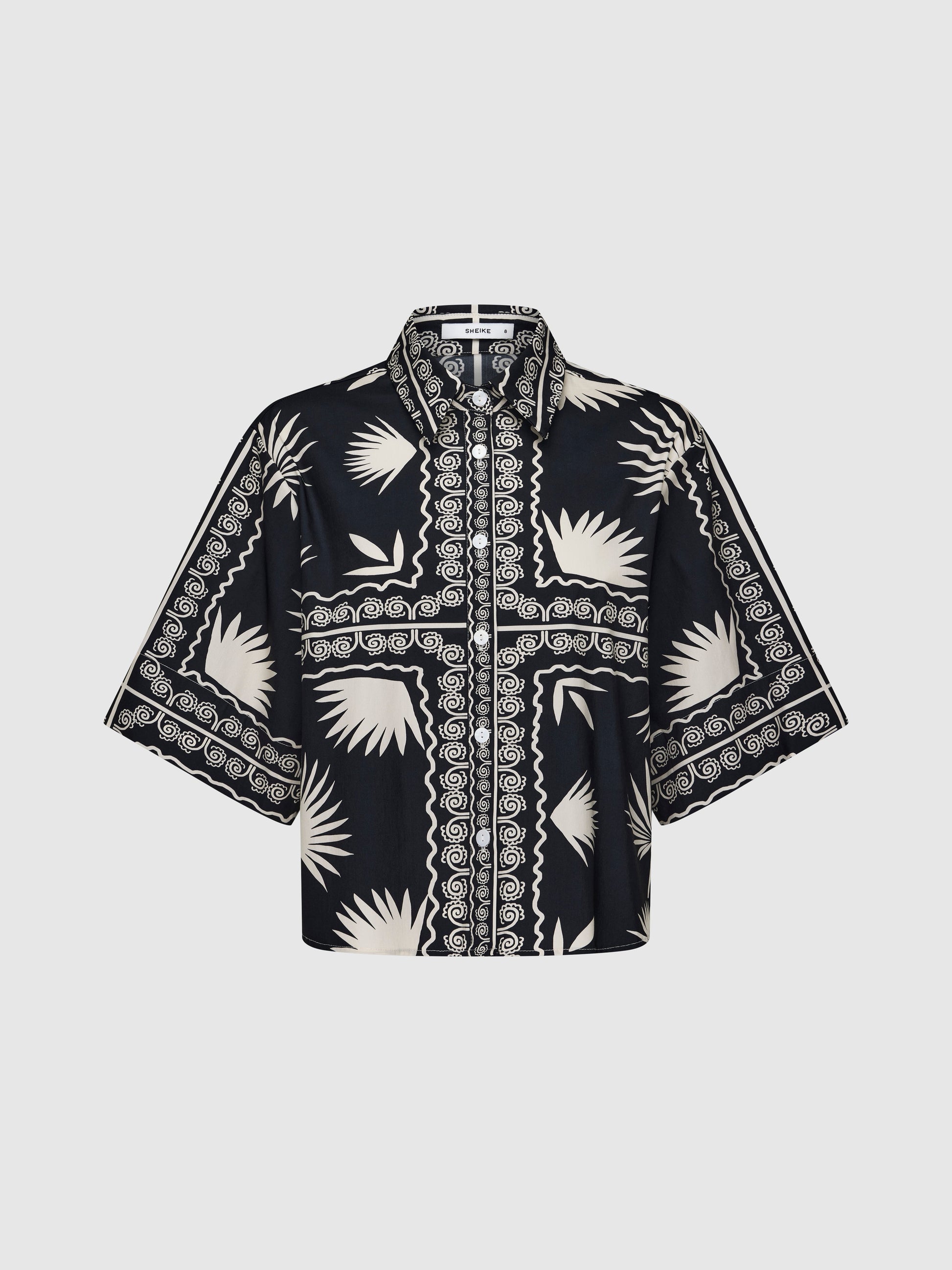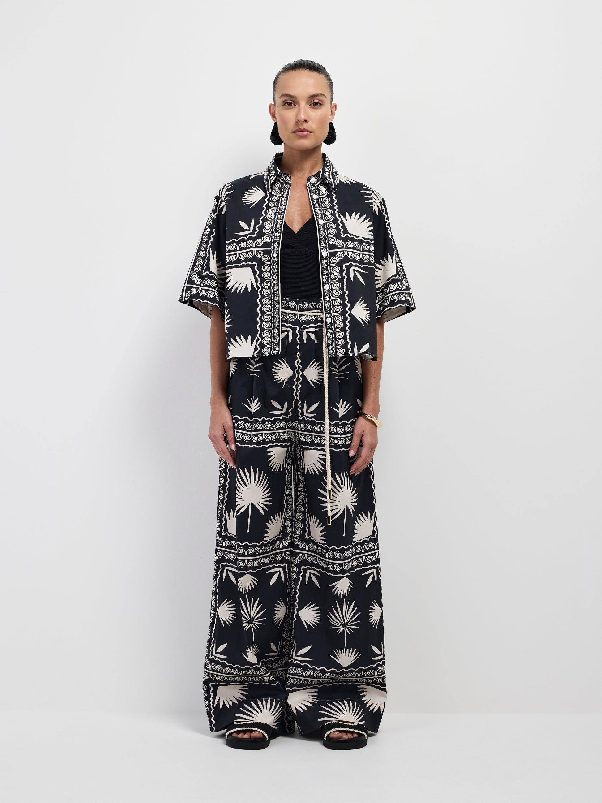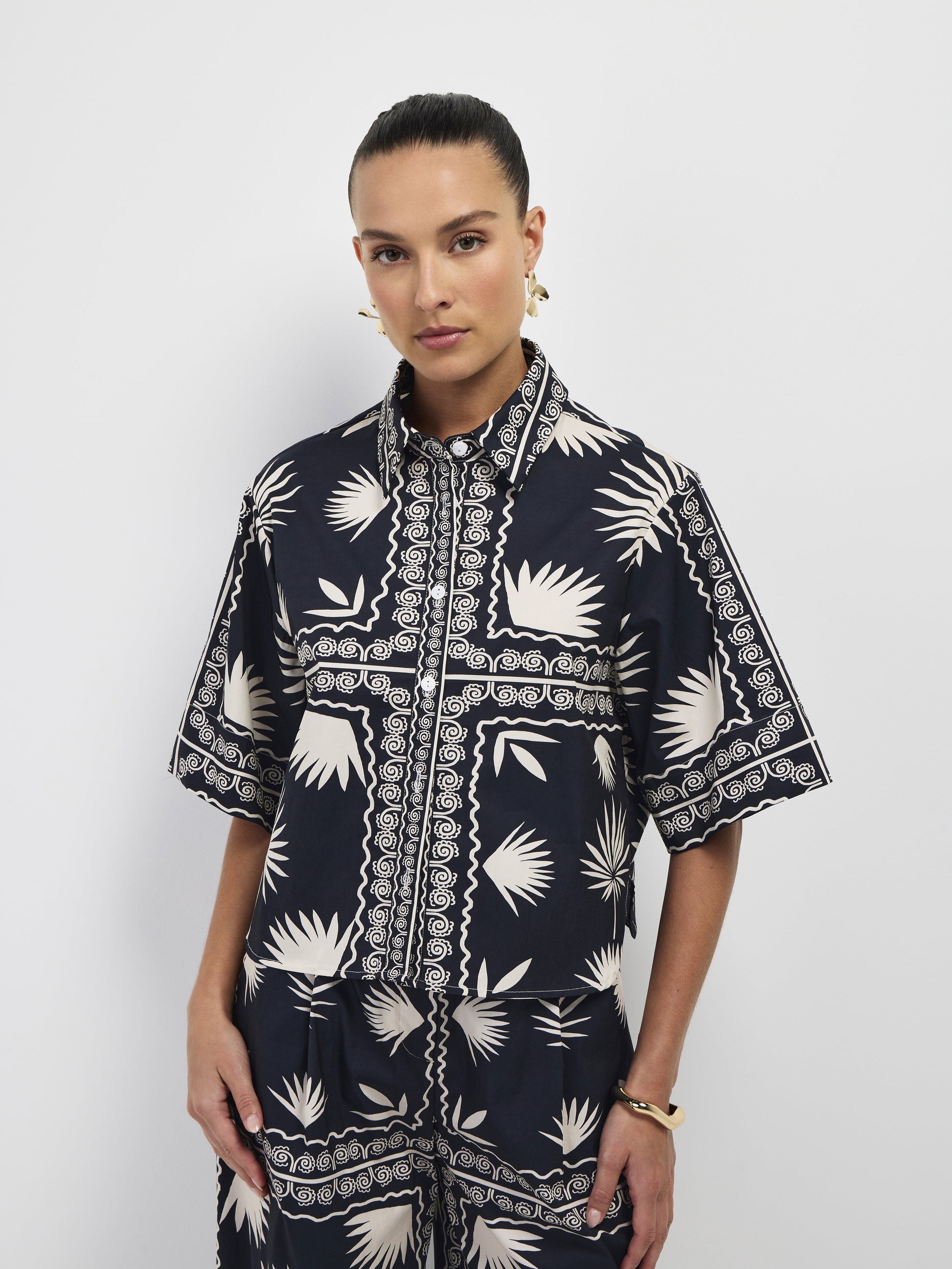 Escape to paradise in the Palm Serenity Shirt. Featuring a printed fabrication with slight stretch, collared neckline, cropped relaxed styling and button up front. Pair back with our matching Palm Serenity Pant for a gorgeous Co-ord look.