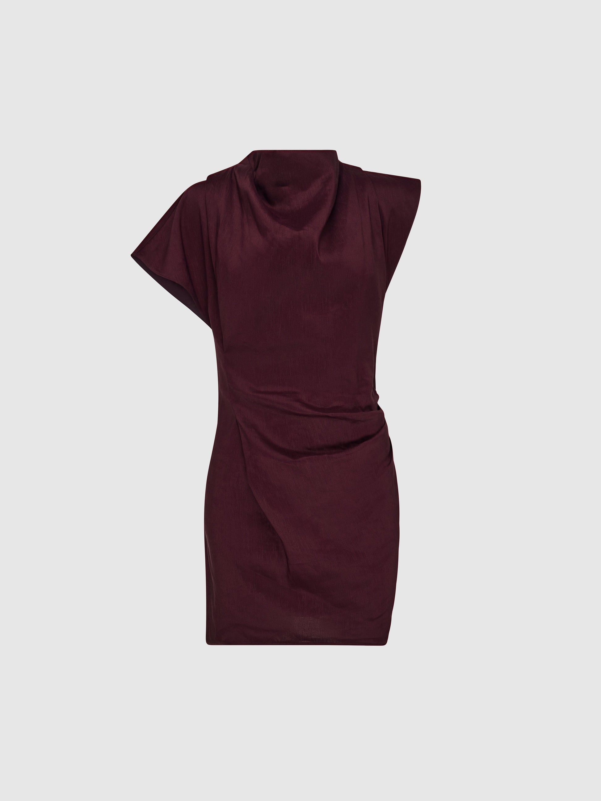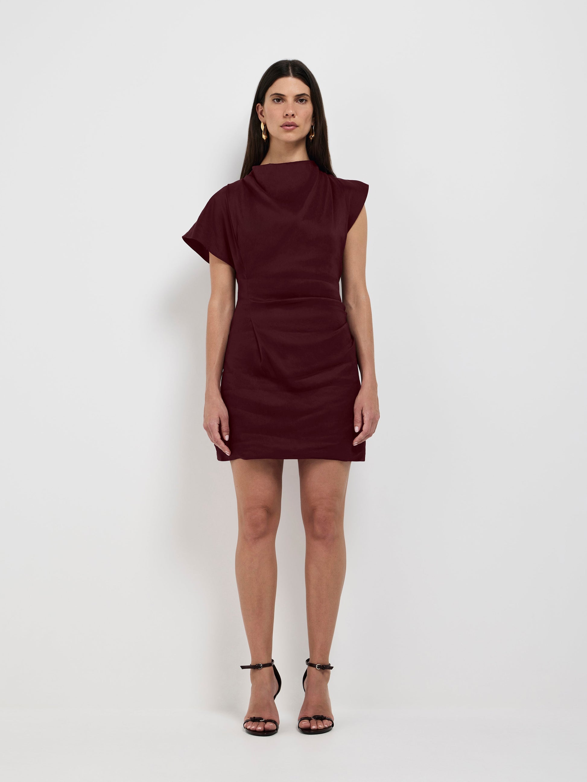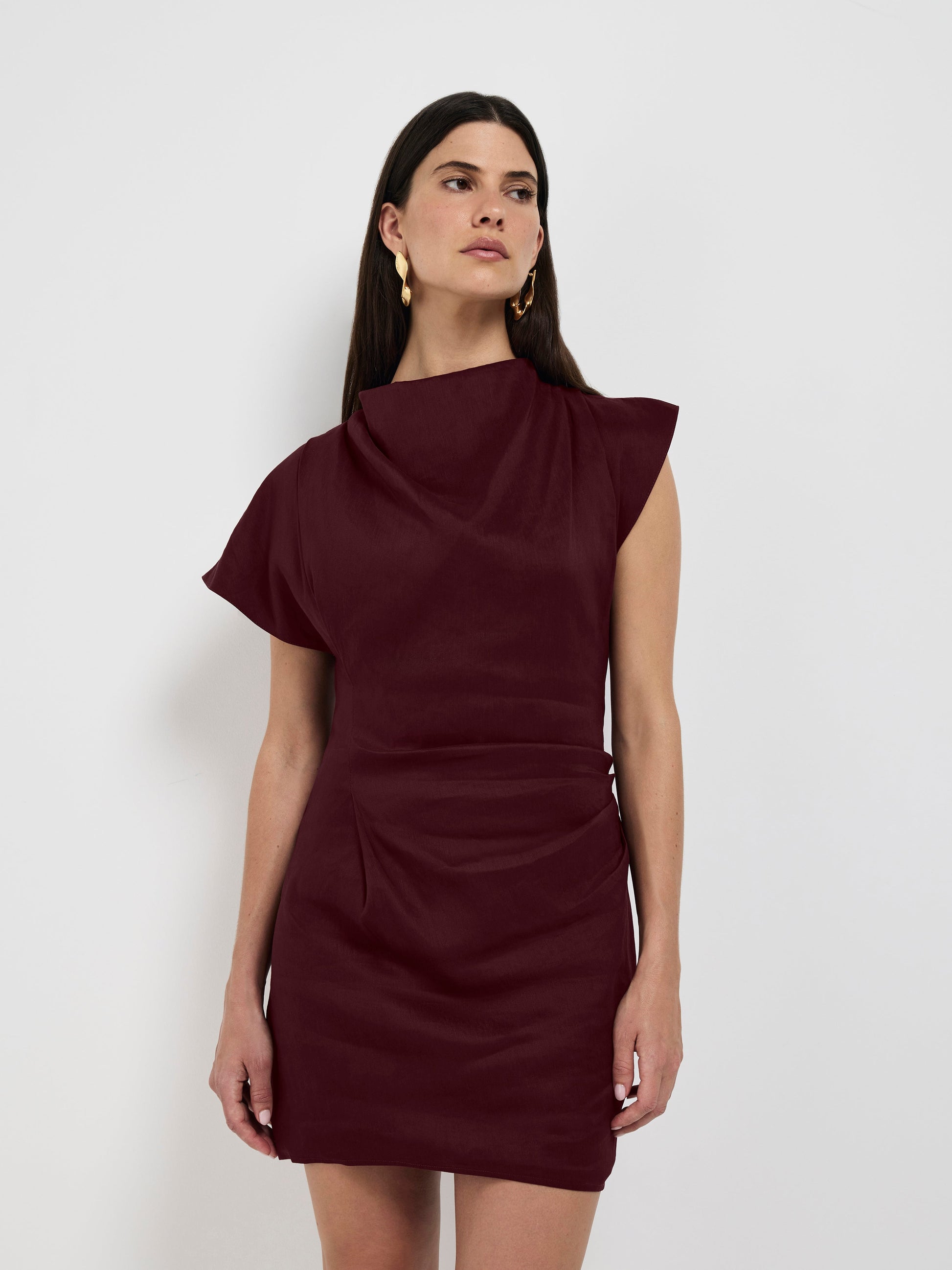 Embrace the allure of Parisian glamour with the Paris Nights Mini Dress. Showcasing a burgundy linen blend fabrication, fitted cut, high cowl neckline, dropped shoulder with tuck details and mini length Skirt. Pair with our Whimsy Earrings to complete the look.