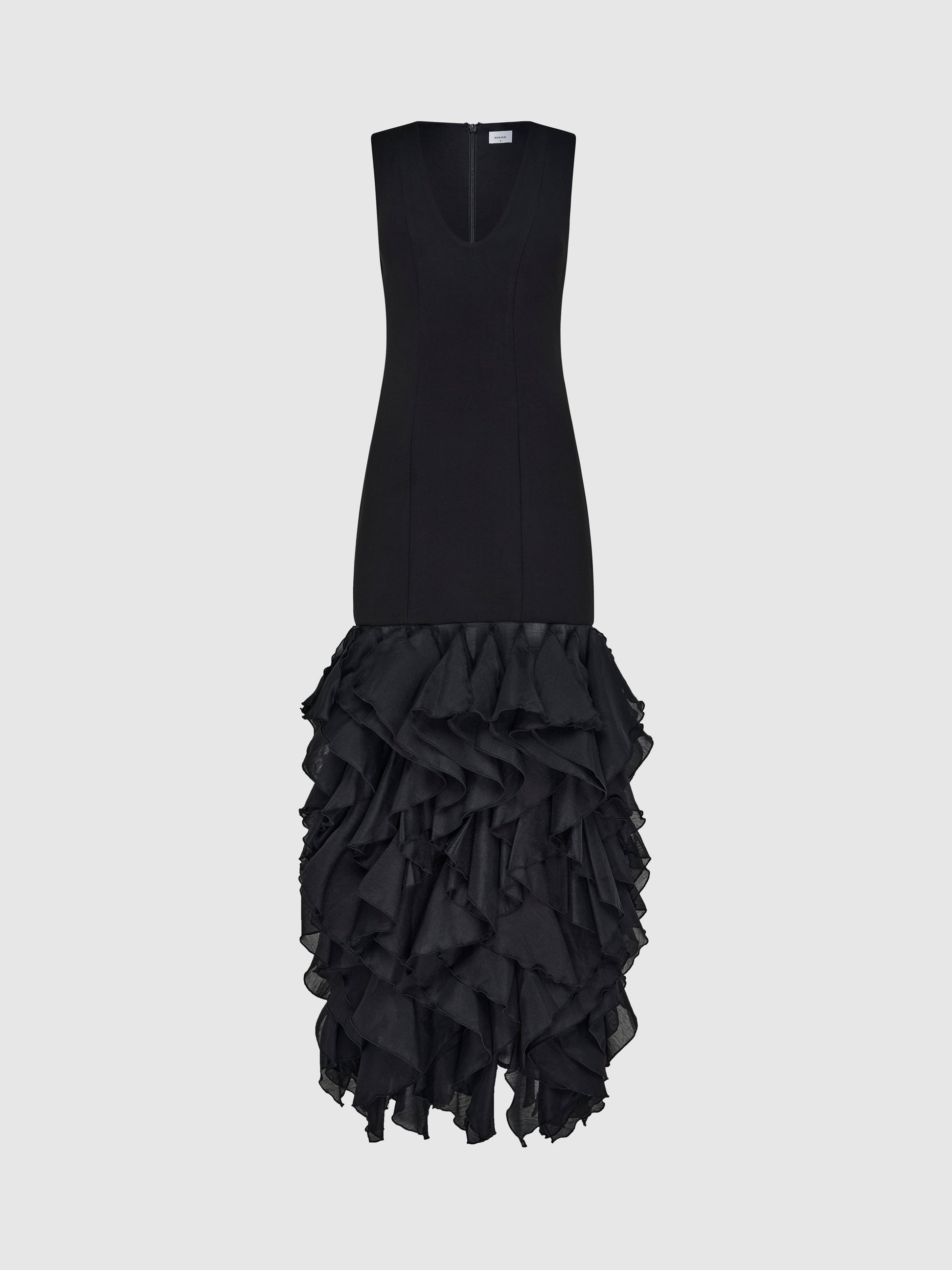 Step into the spotlight in the Reflections Gown. Showcasing a black stretch fabrication, fitted styling to low hip with contrast ruffle hemline, deep scoop neckline, invisible back zipper and maxi skirt length. Pair back with our Tula Earrings to complete the look!