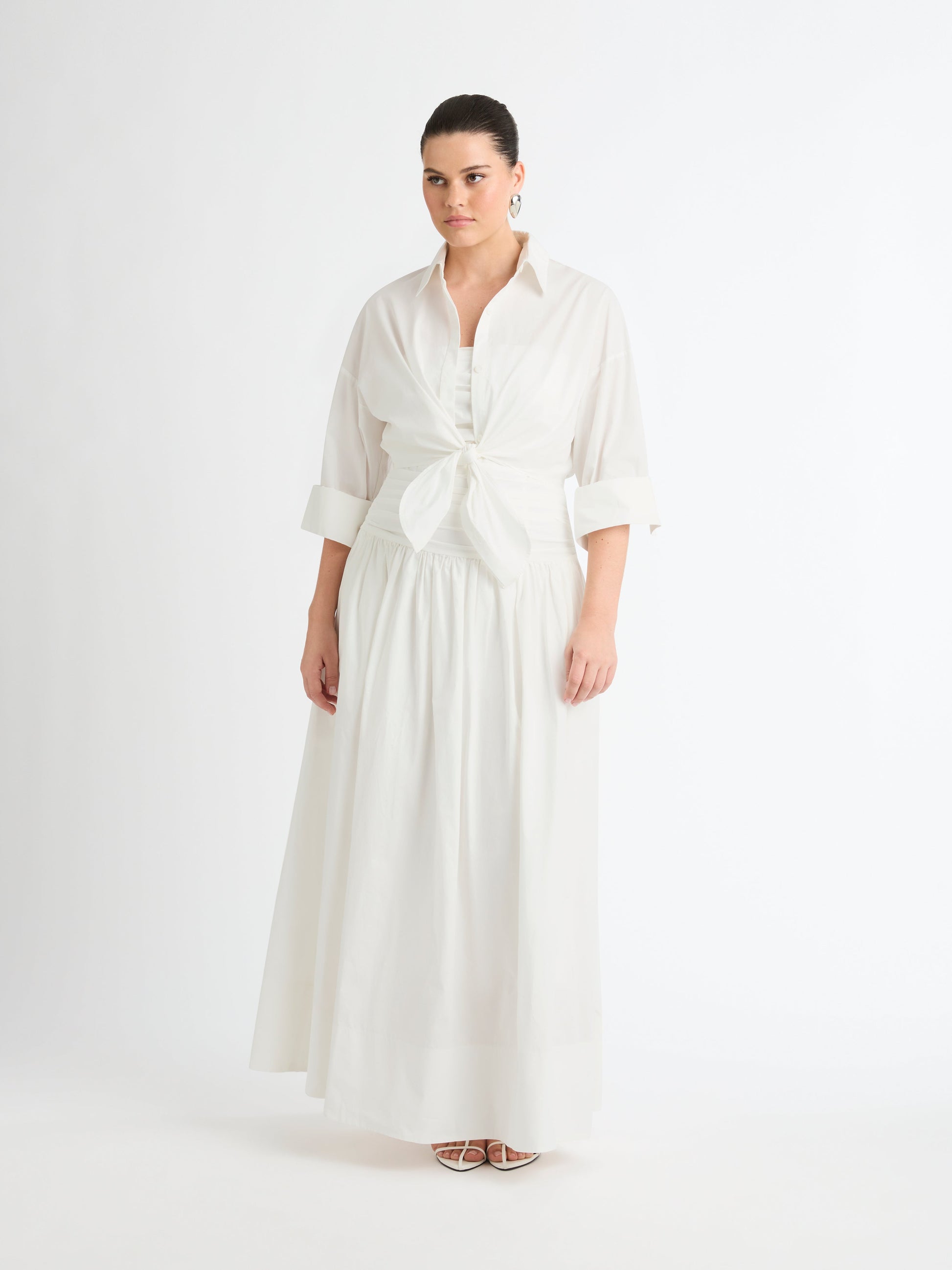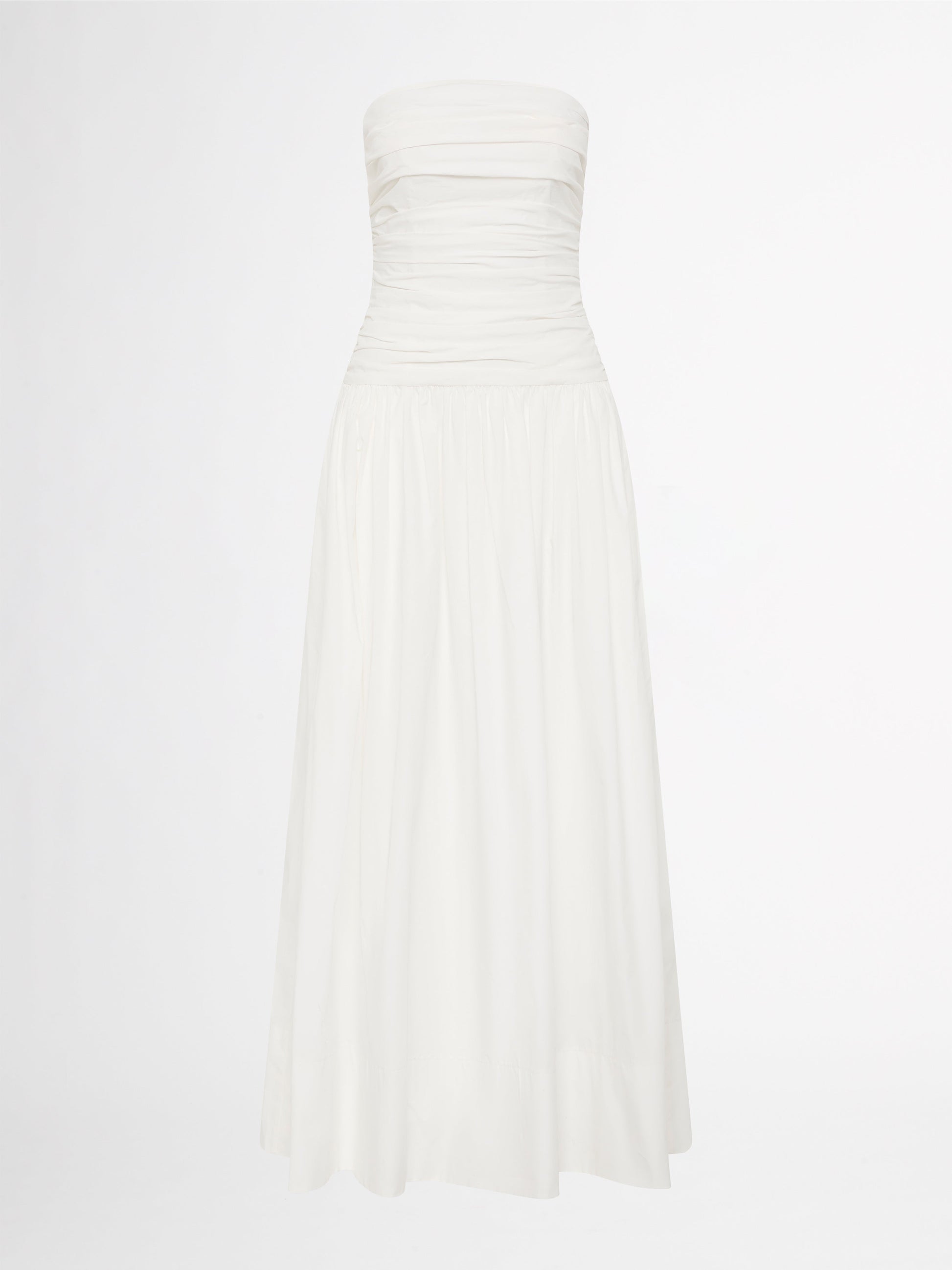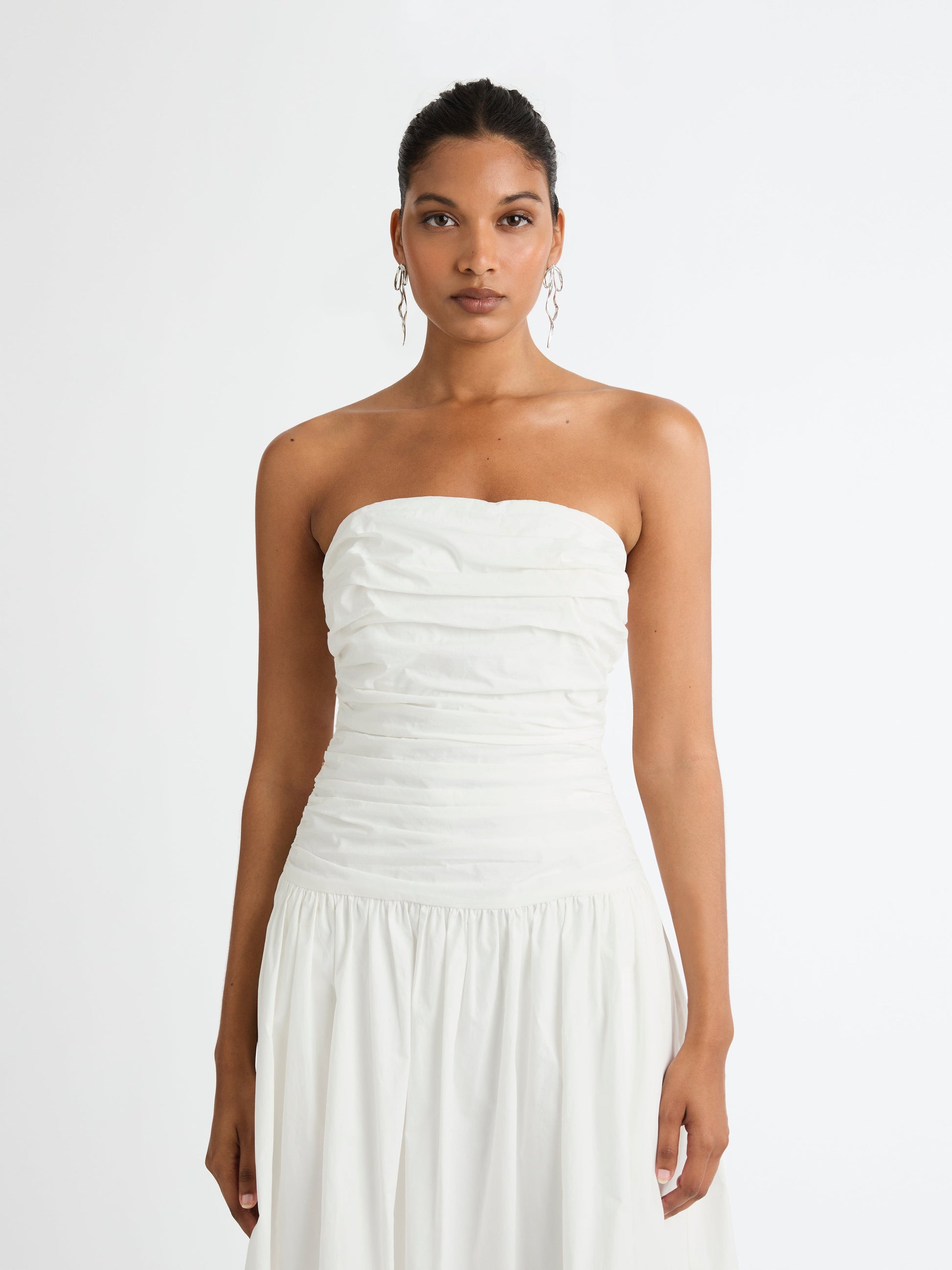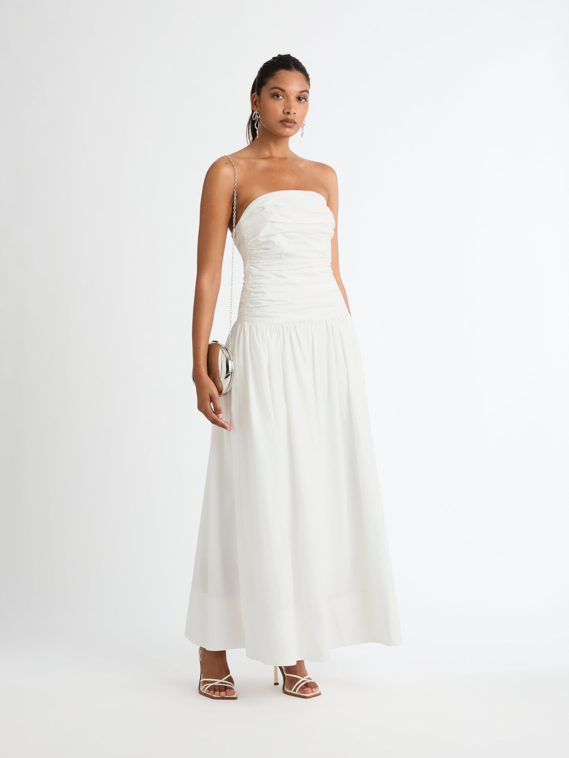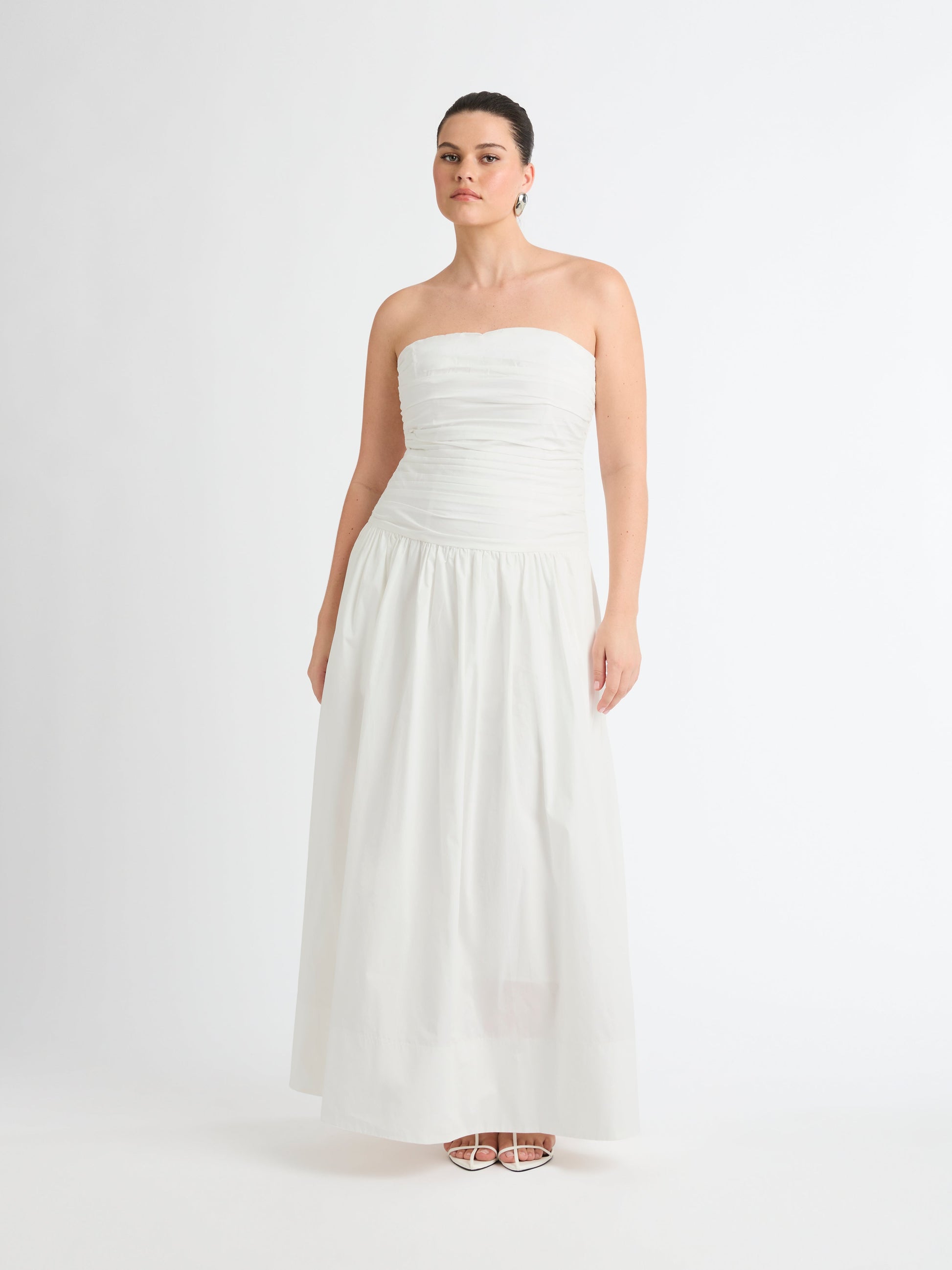 Indulge in the crisp ivory pallet of the Remy Maxi Dress - showcasing woven cotton fabrication, drop waist bodice with full skirt, strapless, horizontal tucking detail at bodice, straight neckline, pockets and maxi length skirt. Pair with our Audrina Earrings to complete the look.