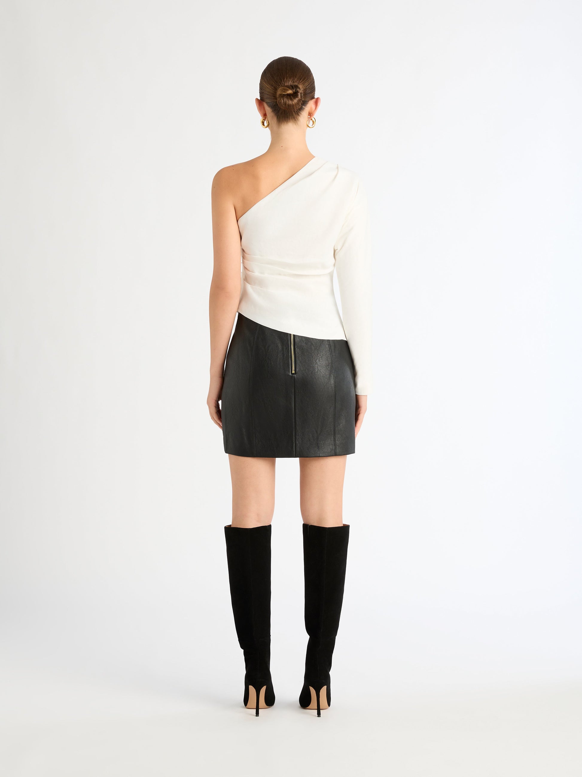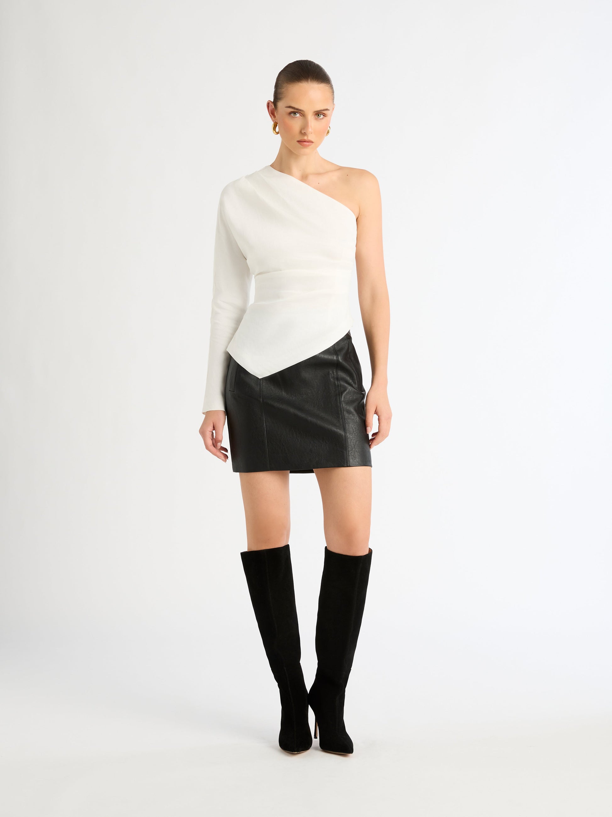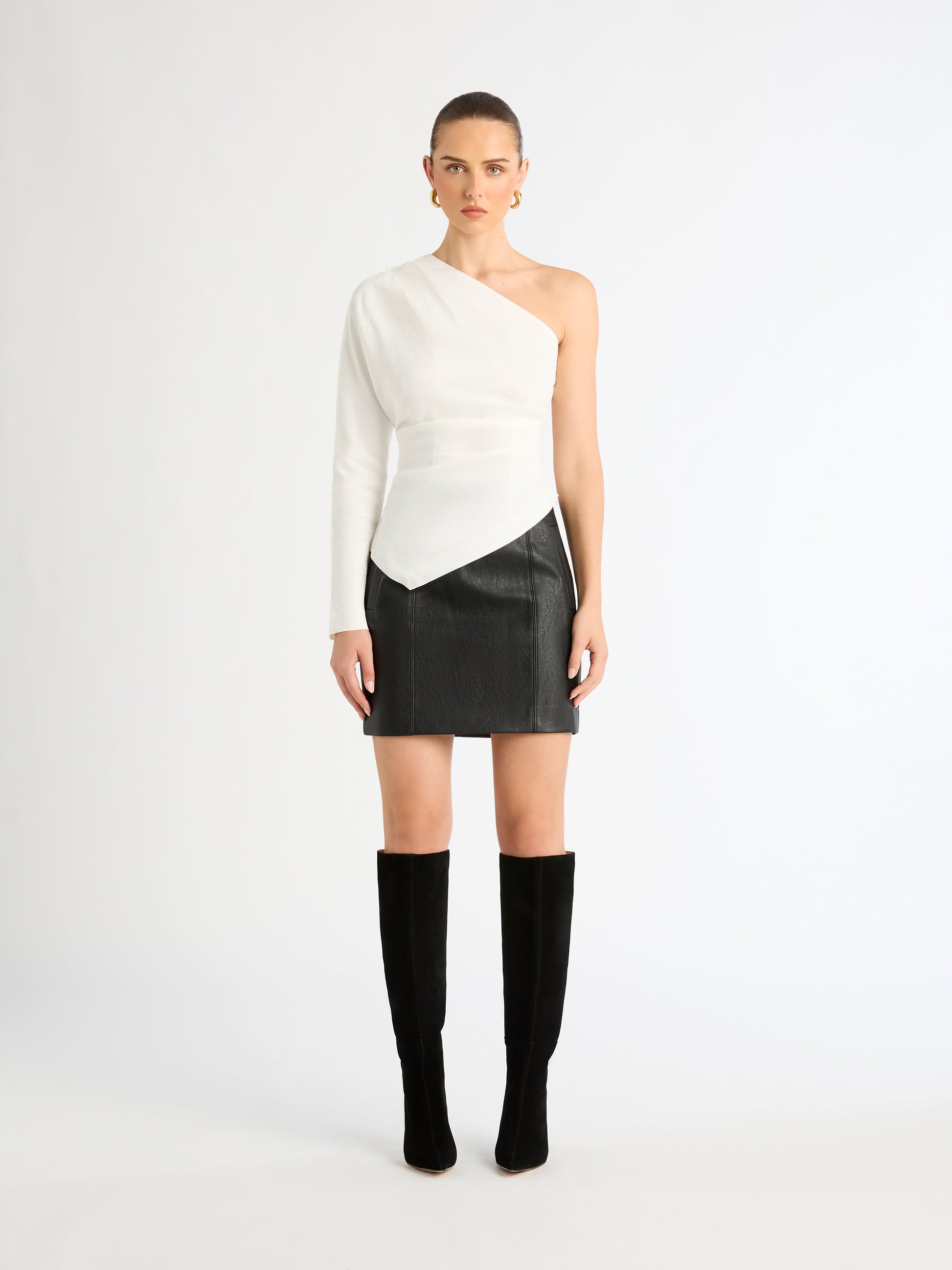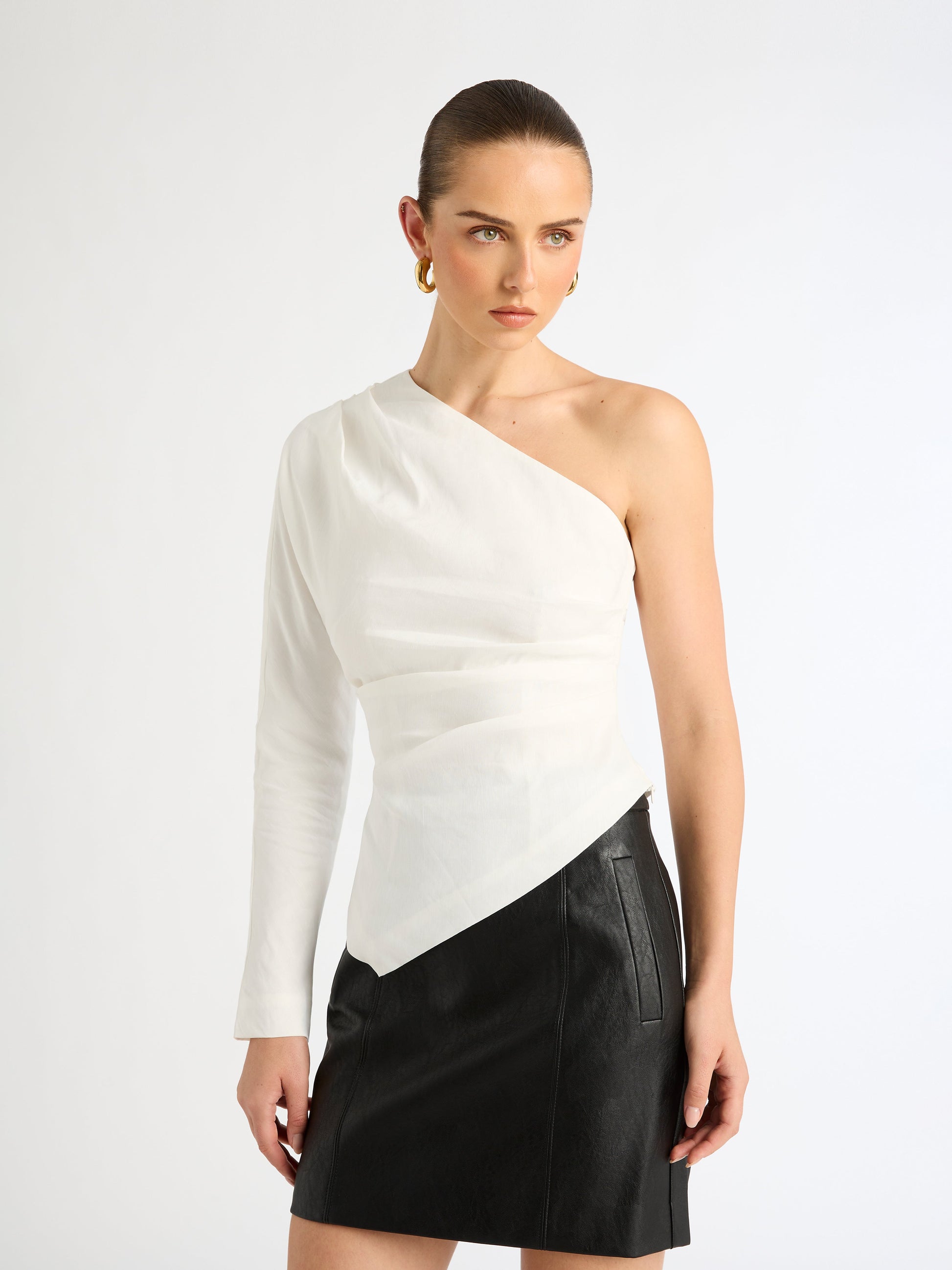 Add a touch of elegance to your wardrobe with the Reputation Top. With it's one shoulder long sleeve, asymmetrical hem, fitted styling and Linen blend fabrication - there is no doubt that you will be owning this look!