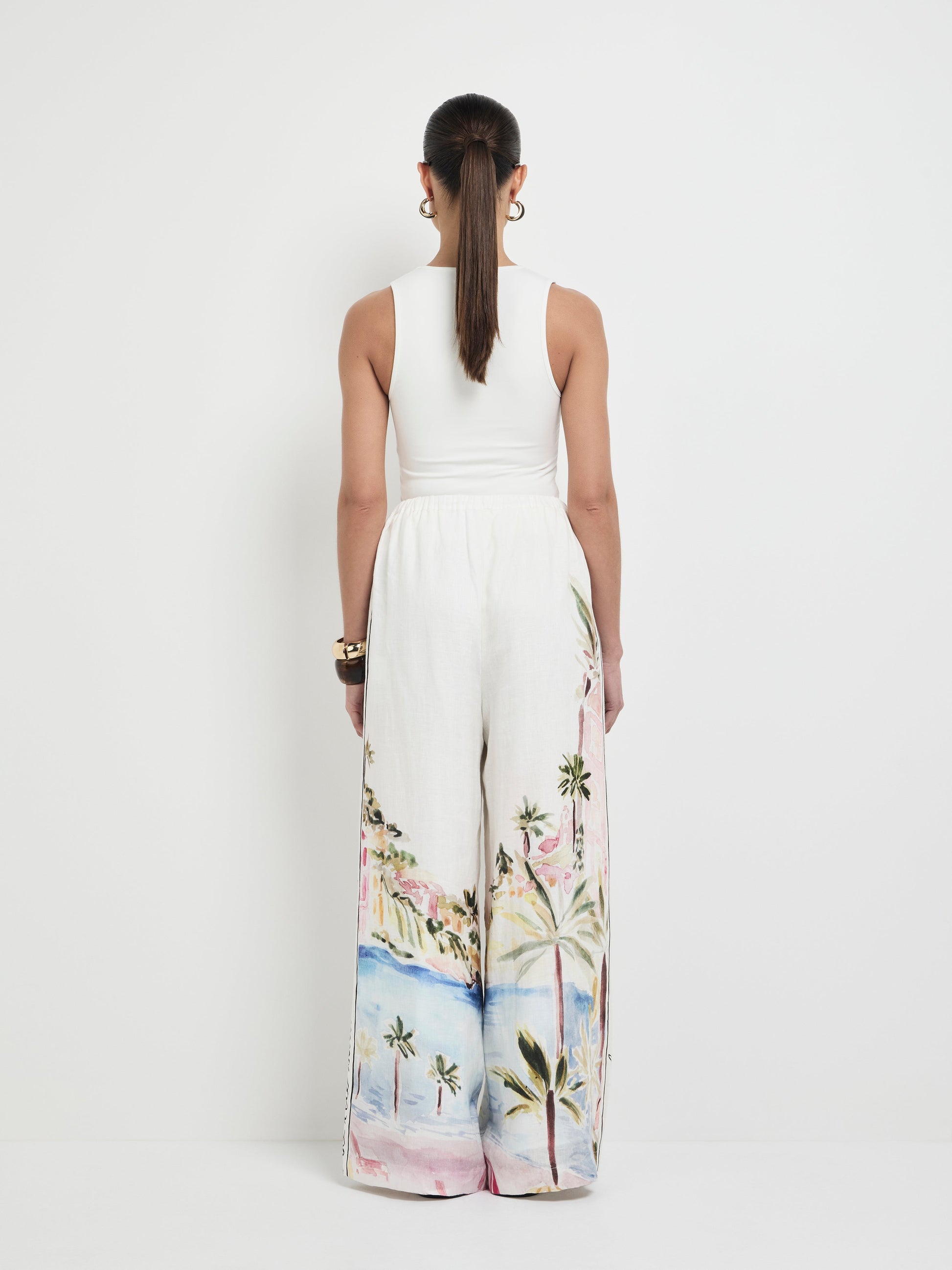 Capture the romance of faraway coastlines and endless summers in the Riviera Dreams Pant. Featuring 100% Linen Printed fabrication, elasticated waist with drawstring, wide leg, pockets and full lining. Pair back with our matching Riviera Dreams Shirt for a gorgeous Co-ord look.