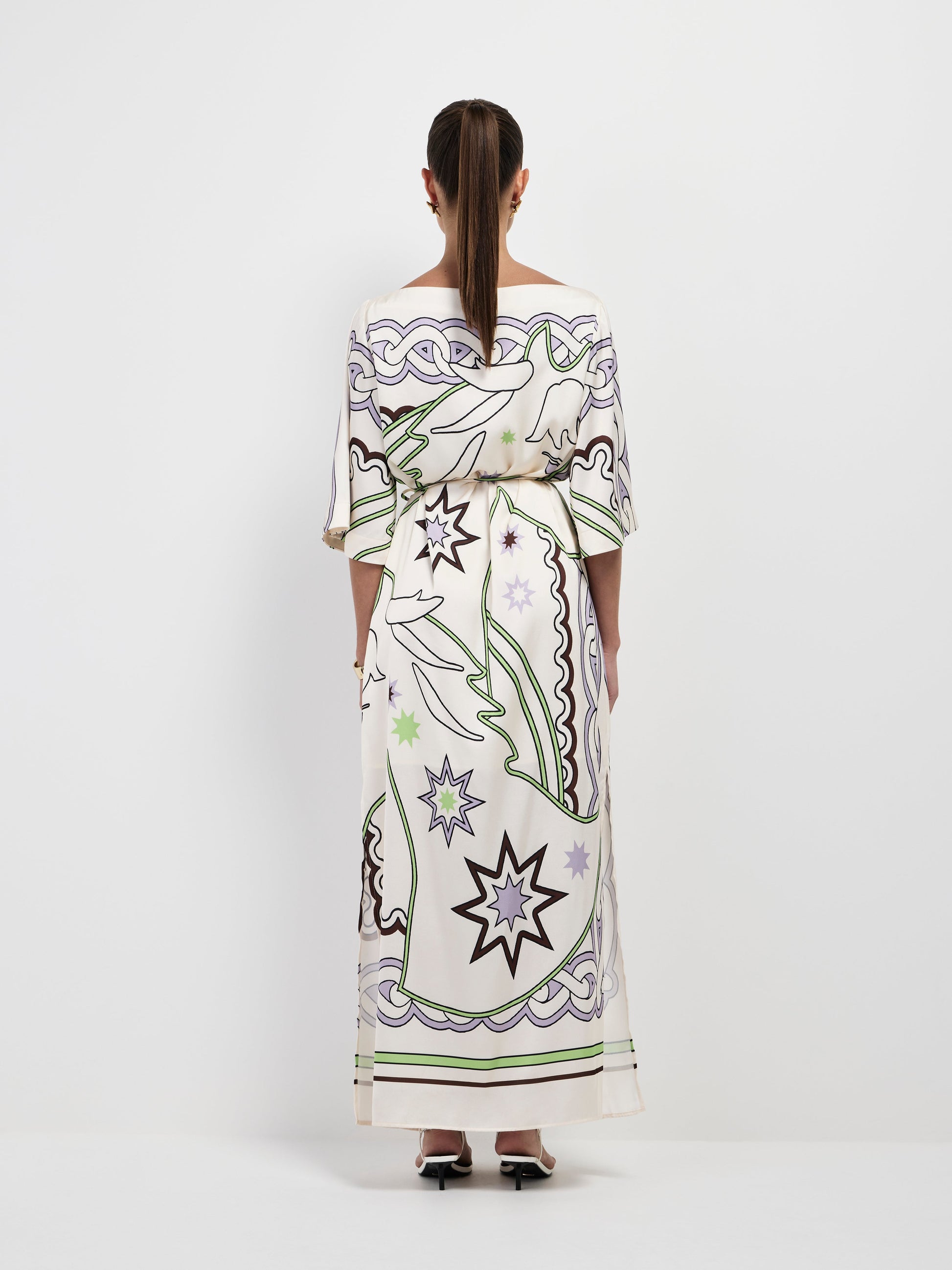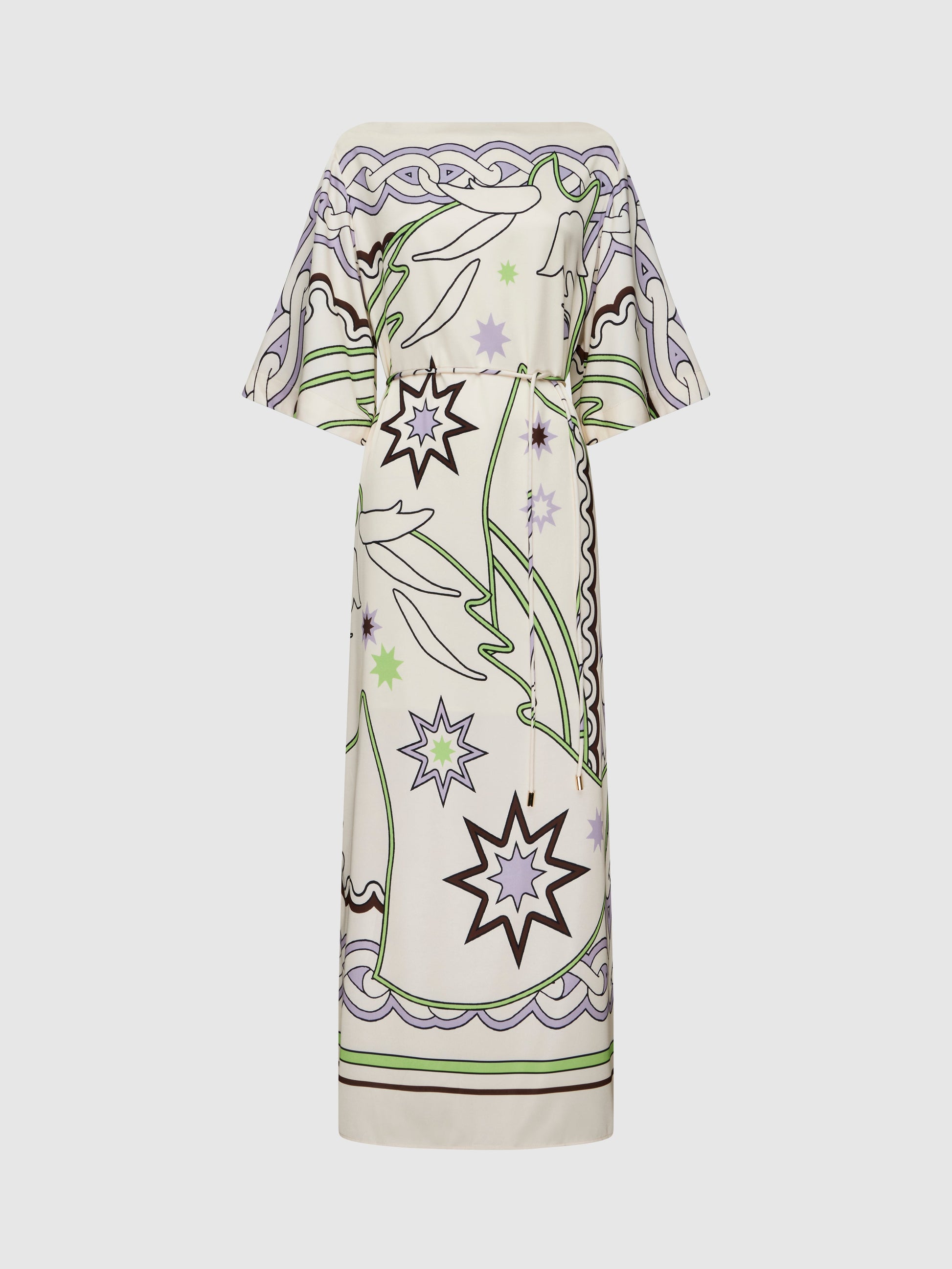 Playful prints take center stage with our Rodeo Tunic Dress. Featuring a printed satin fabrication, wide neckline that can be worn off shoulder, relaxed fit, side seam splits, tie belt and maxi skirt length. Pair with our Akai Earrings to complete the look.