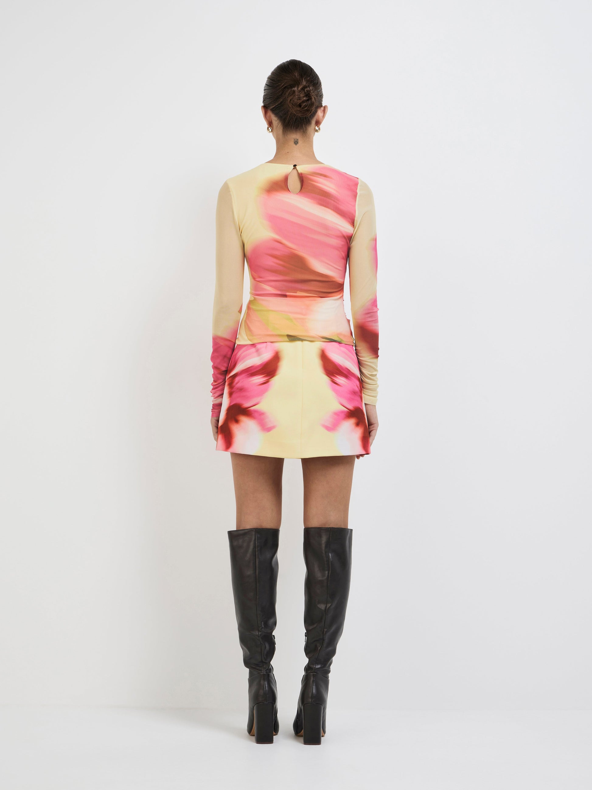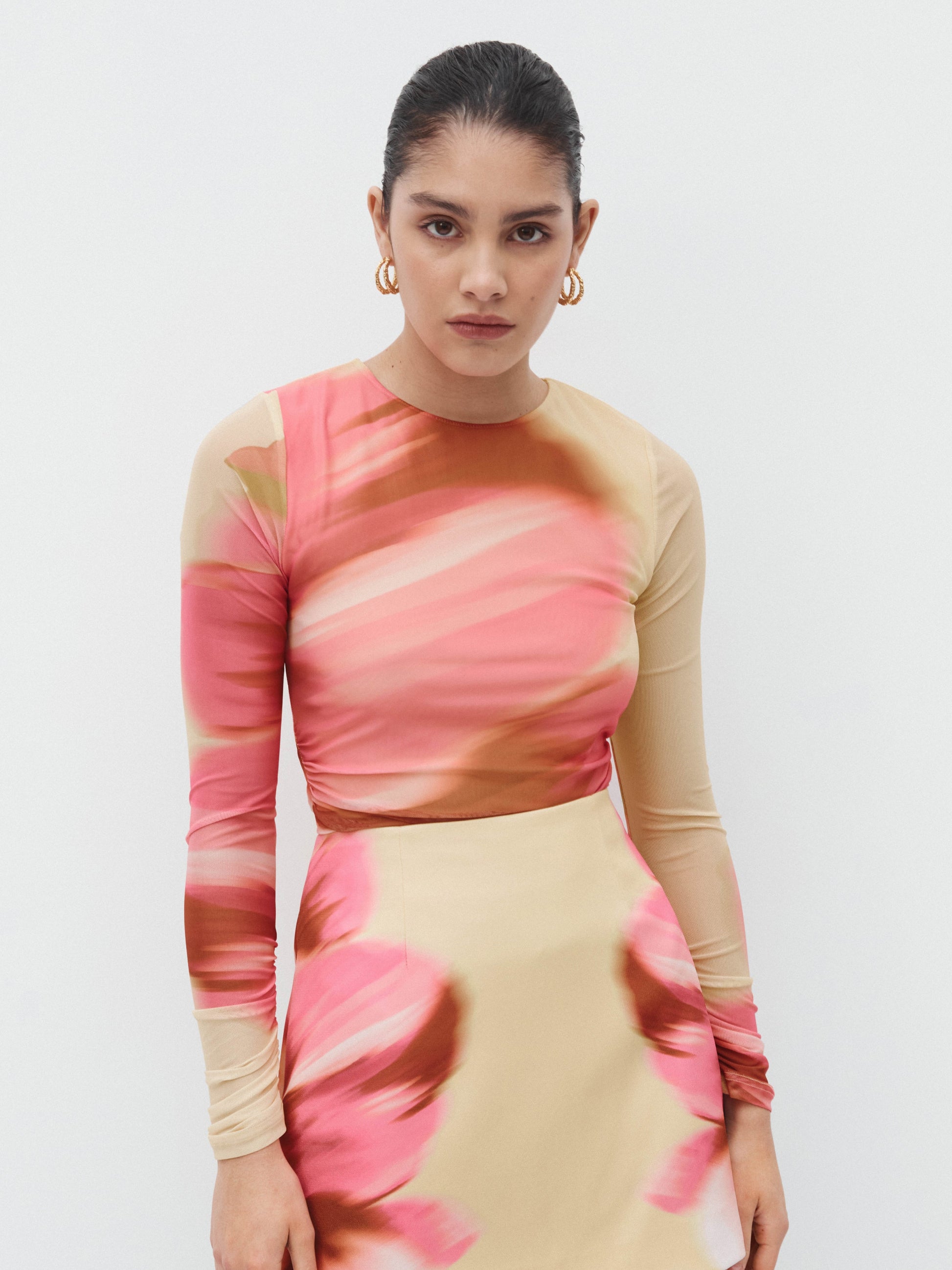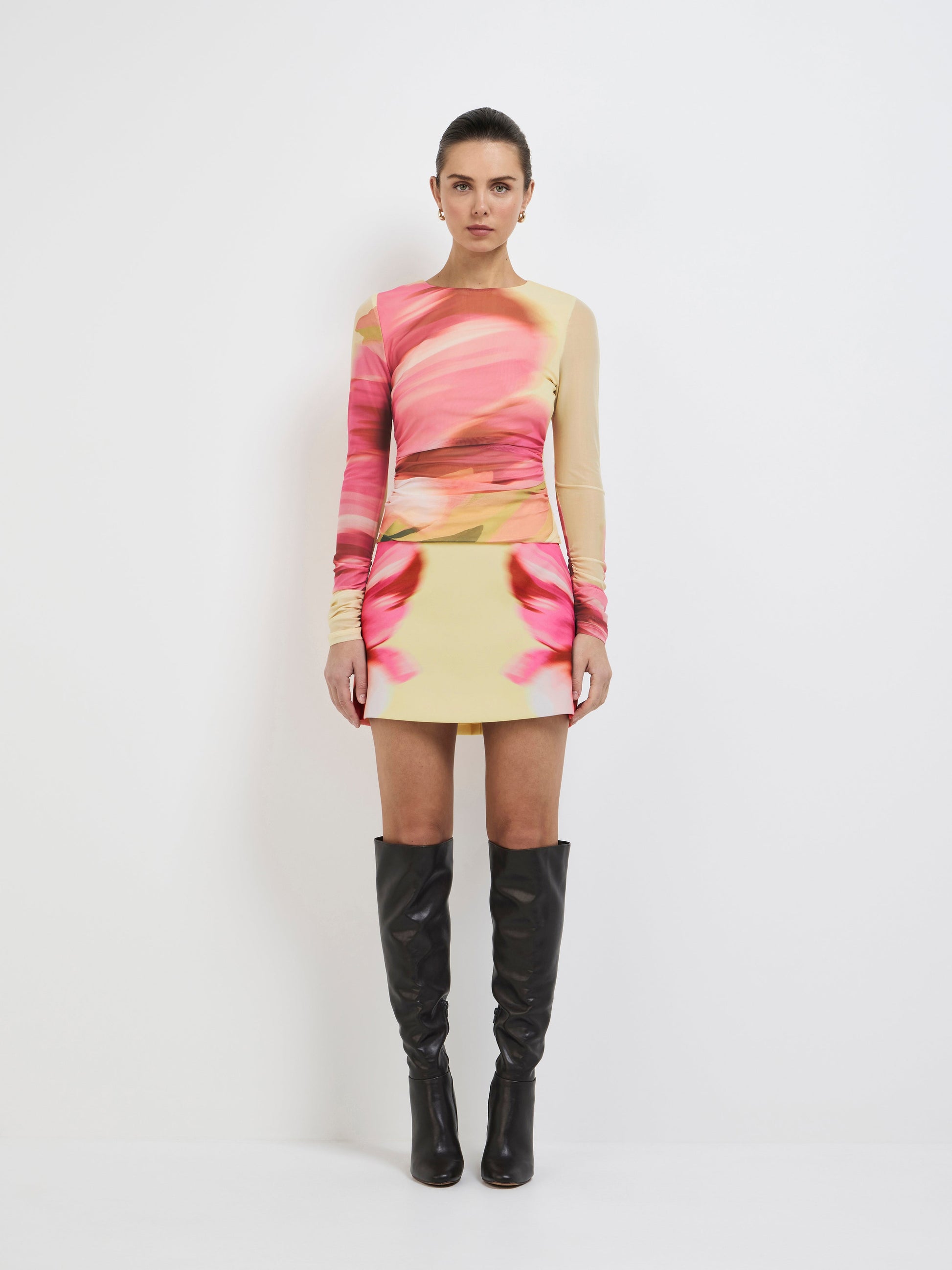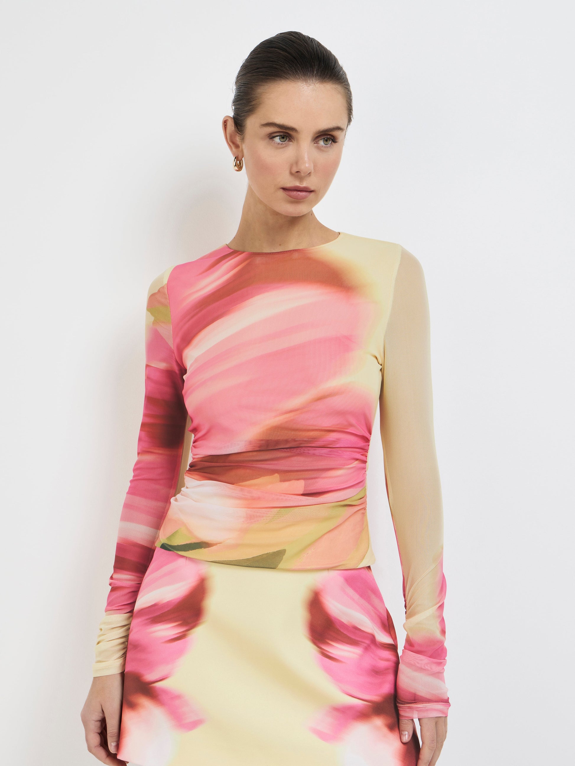 Bold Florals, Soft Focus. Introducing our Sabrina Top – featuring a printed mesh fabrication, fitted silhouette, side ruching, long sleeves, high neckline, lined body and unlined sleeves. Pair it with our matching Sabrina Mini Skirt to complete the look.