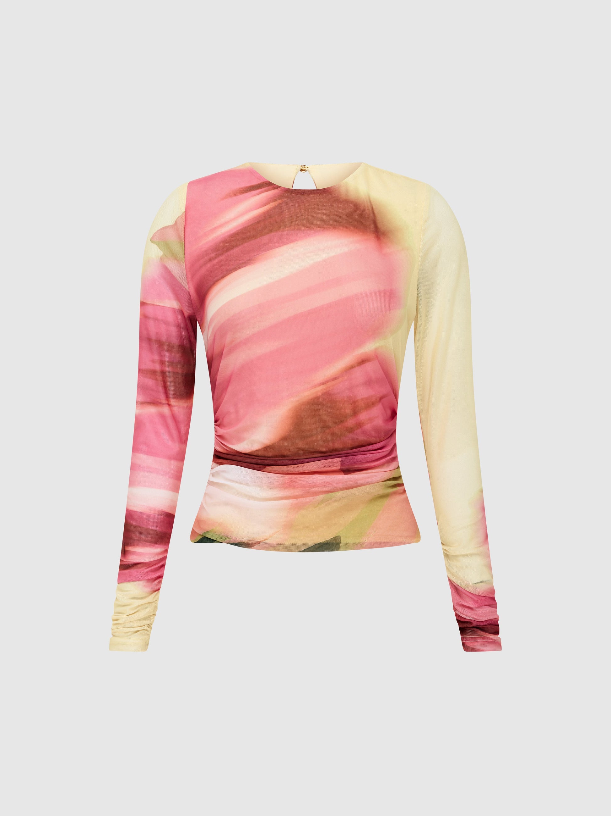 - Long sleeves with ruching at hem