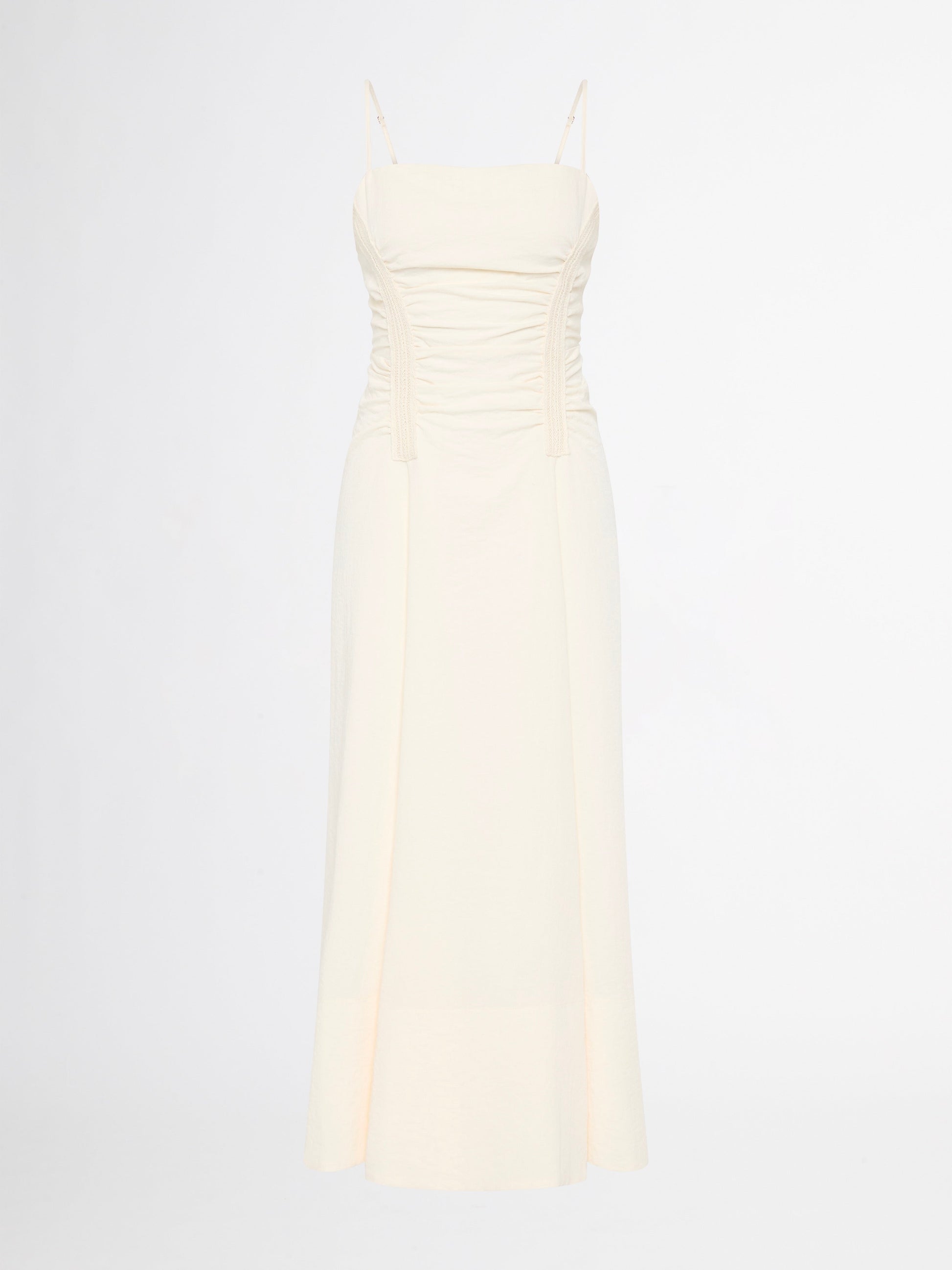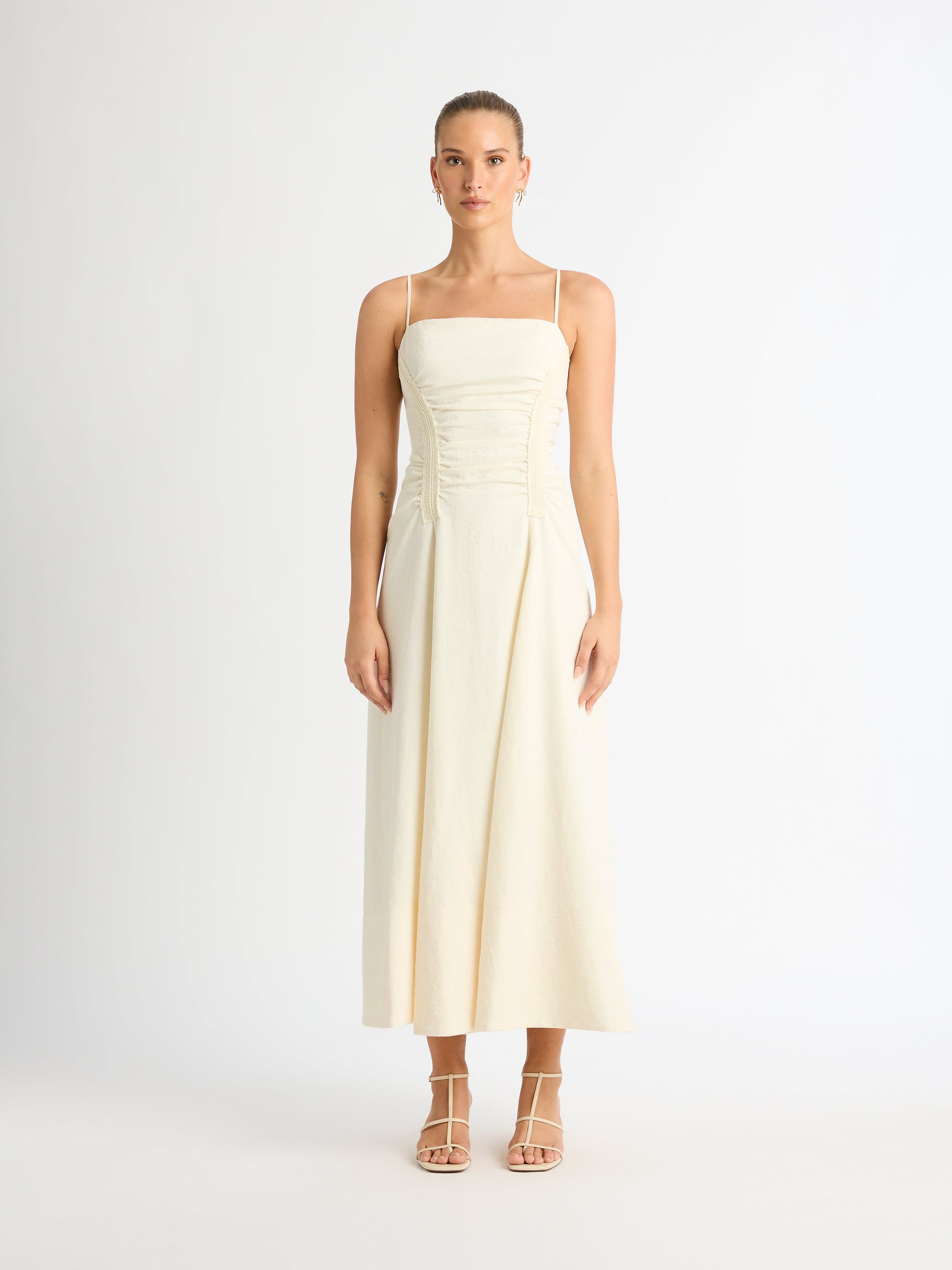 Embrace effortless elegance with the Sahara Midi Dress. Featuring an oatmeal woven fabrication, fitted bodice with A-line skirt, straight neckline, trim detail and gathers on bodice, thin adjustable straps and midi length skirt. Pair with our Simmie Earrings to complete the look.