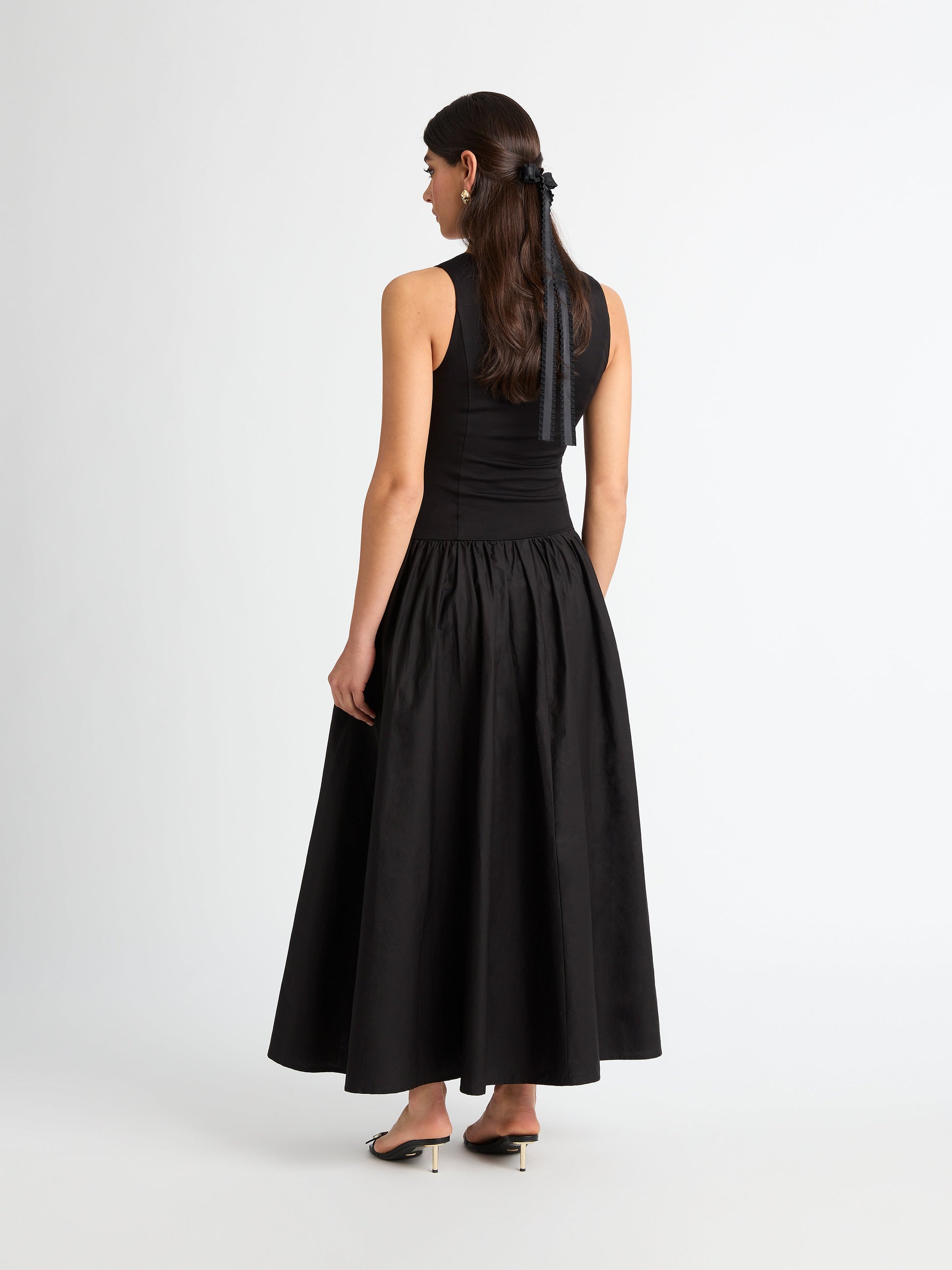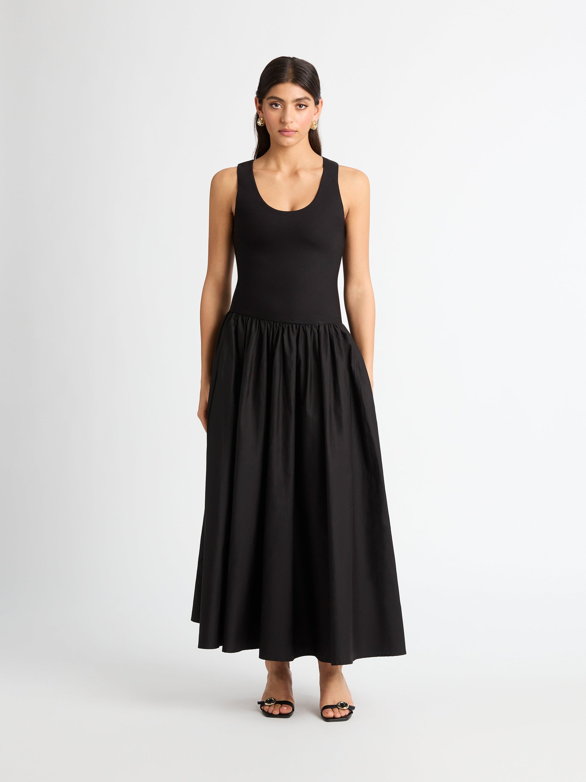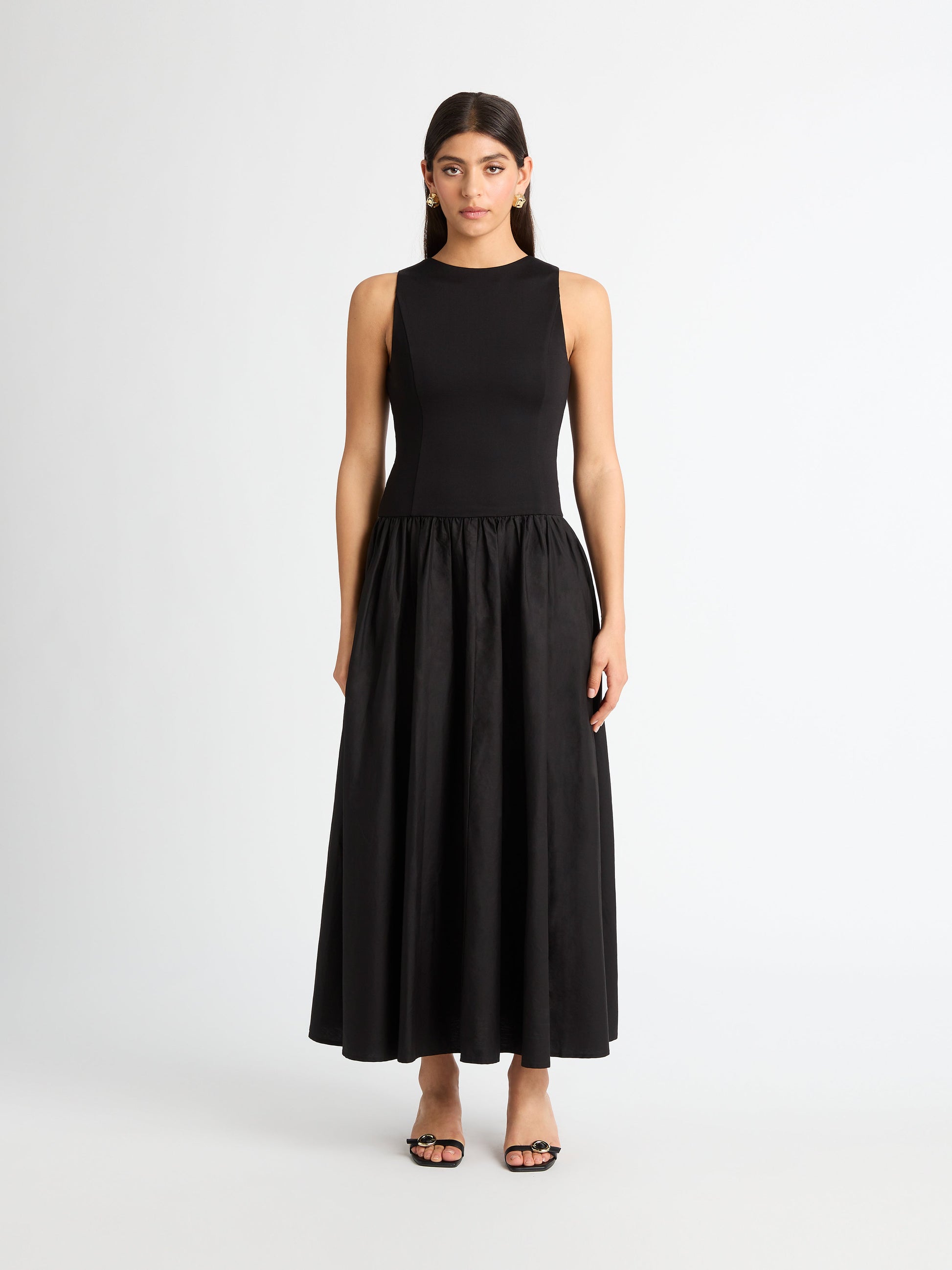 An effortlessly polished look for any occasion. Introducing the Selena Maxi Dress - showcasing a stretch knit/woven fabrication, fitted bodice with full skirt, reversible neckline, side seam pockets, drop waist and a maxi length. Pair with our Marina Stud Earrings to complete the look.