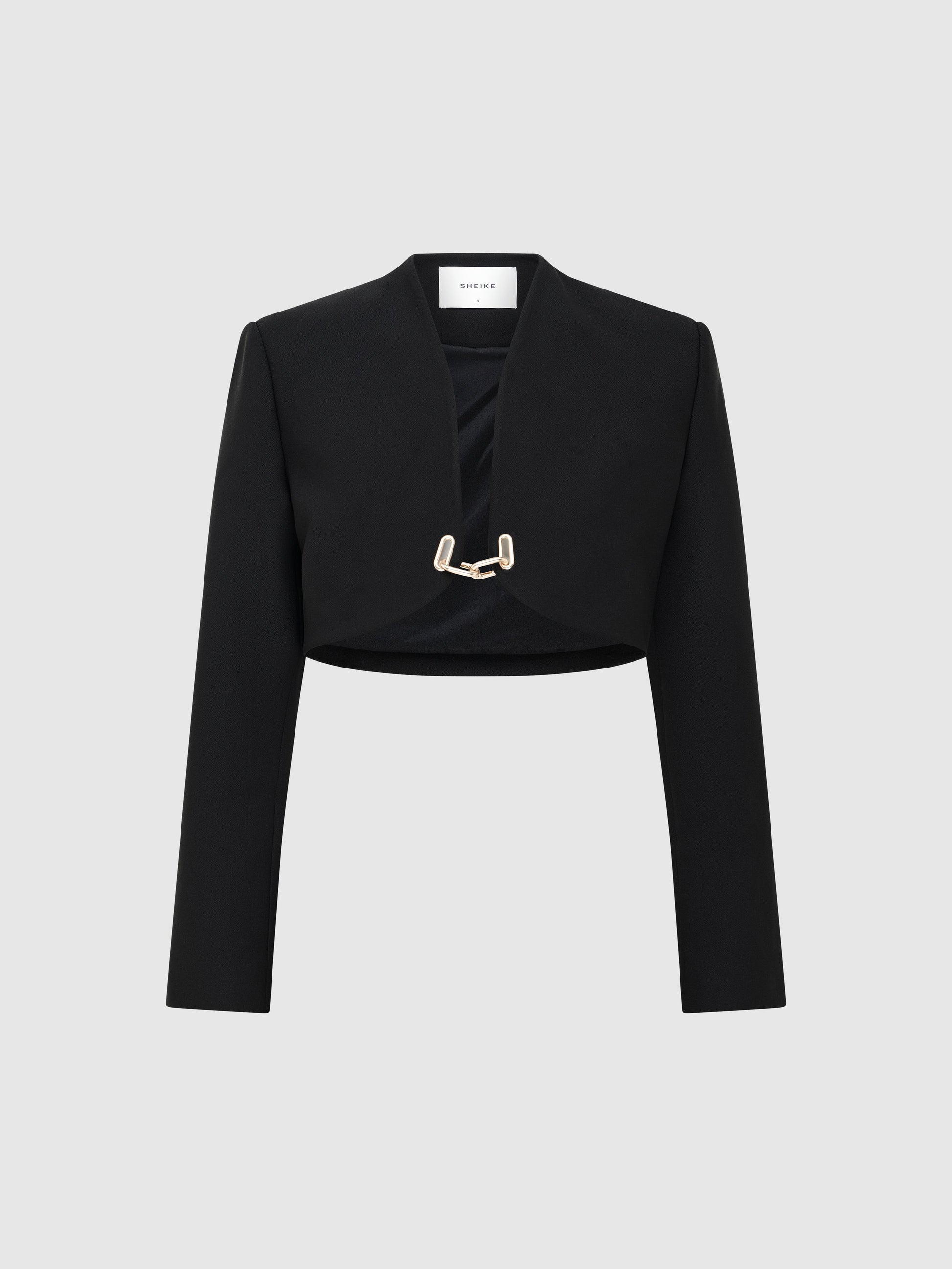 A captivating blend of clean tailoring and crisp monochrome tones. Introducing our Serena Cropped Jacket - featuring a black woven bonded fabrication, relaxed cropped fit, shoulder pads and double front gold clasp closure. Pair back with our Holly Mini Skirt to complete your look.