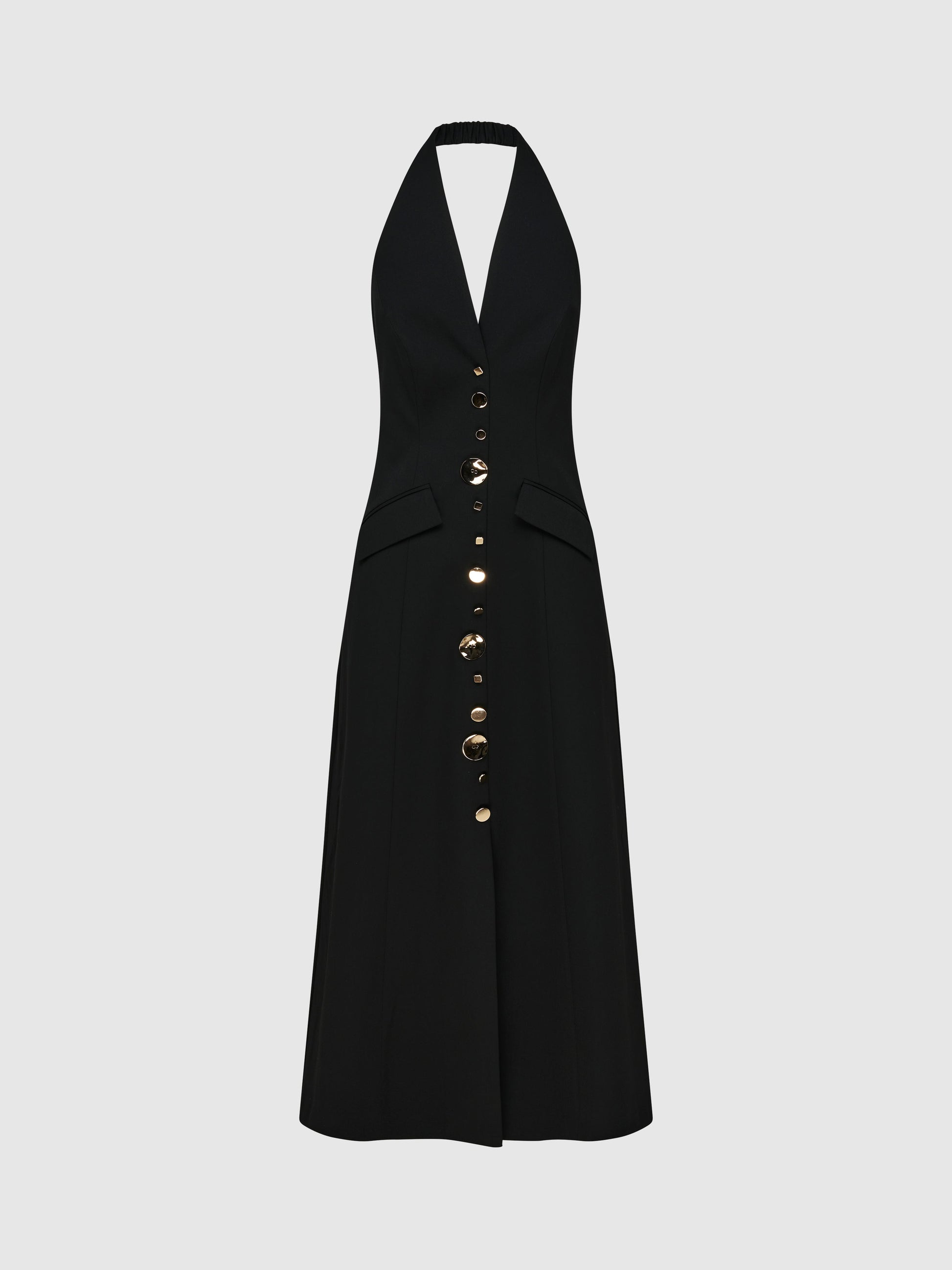 The Shai Maxi Dress is back in Black. For the modern muse, featuring a woven black fabrication, halter neckline with elasticated back, faux feature buttons down front and maxi A-line skirt. Pair with our Demi Earring Stack to complete the look.