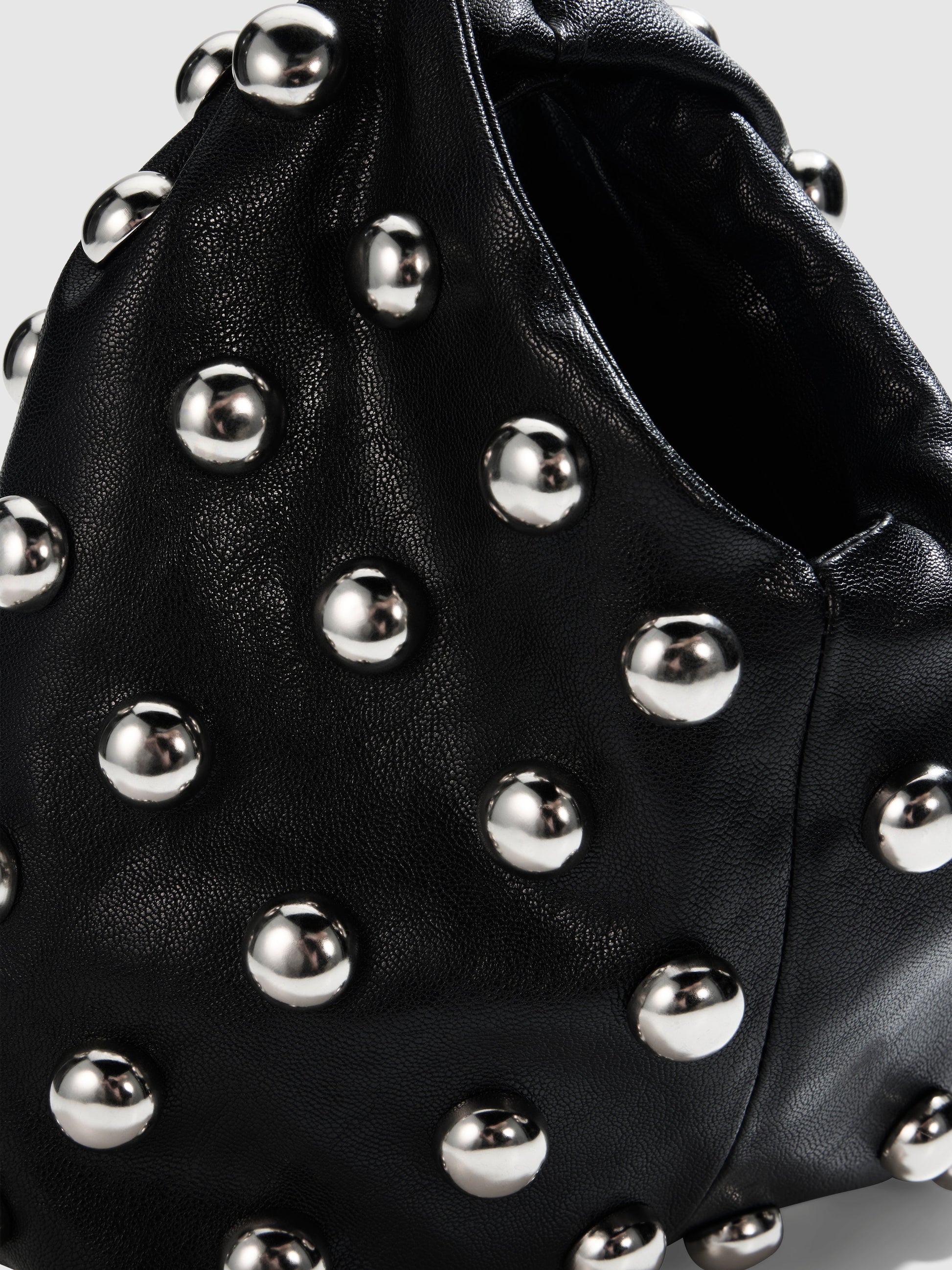 Introducing the Simmie Bag - a black faux leather bag with twist detail handle and silver sphere hardware detailing.