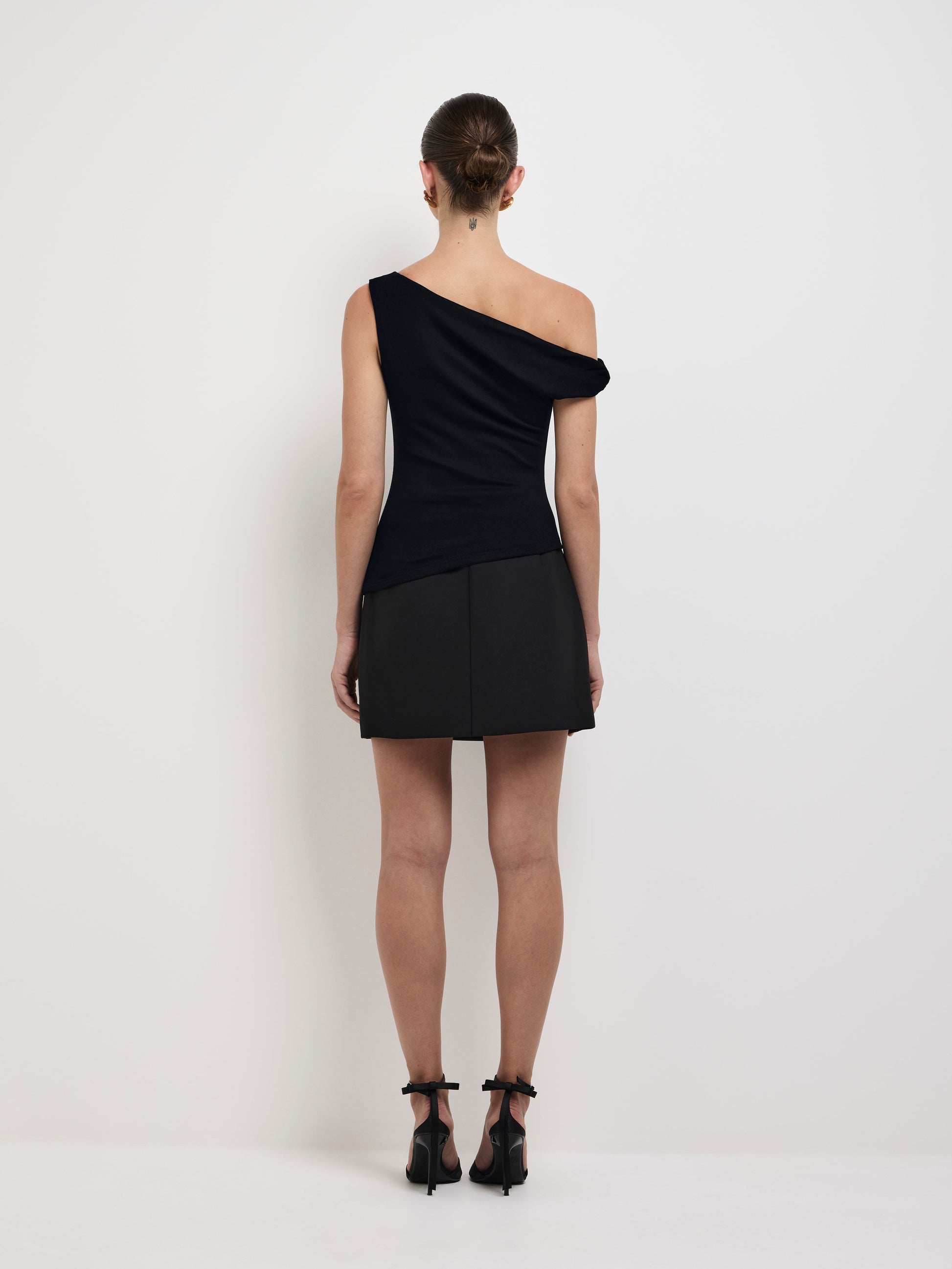 Classic styling redefined. Introducing the Simmie Top - showcasing a black stretch knit fabrication, asymmetric neckline with twisted strap detailing and asymmetrical hem. Pair with our Nour Skirt to complete the look.