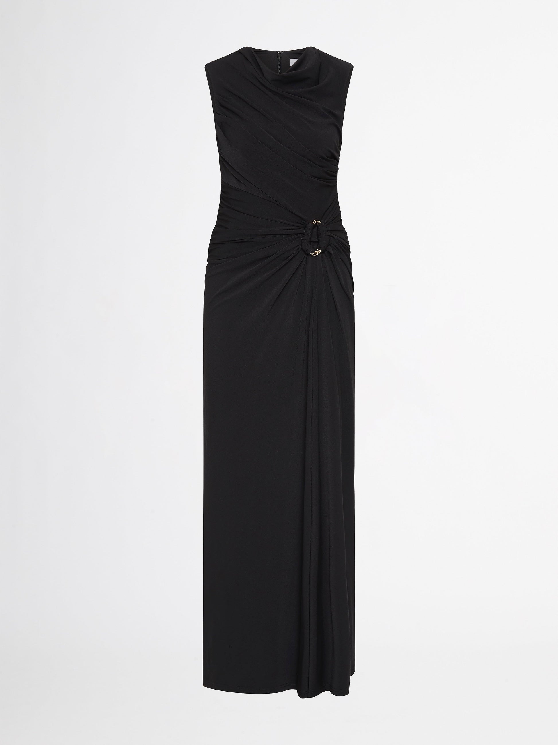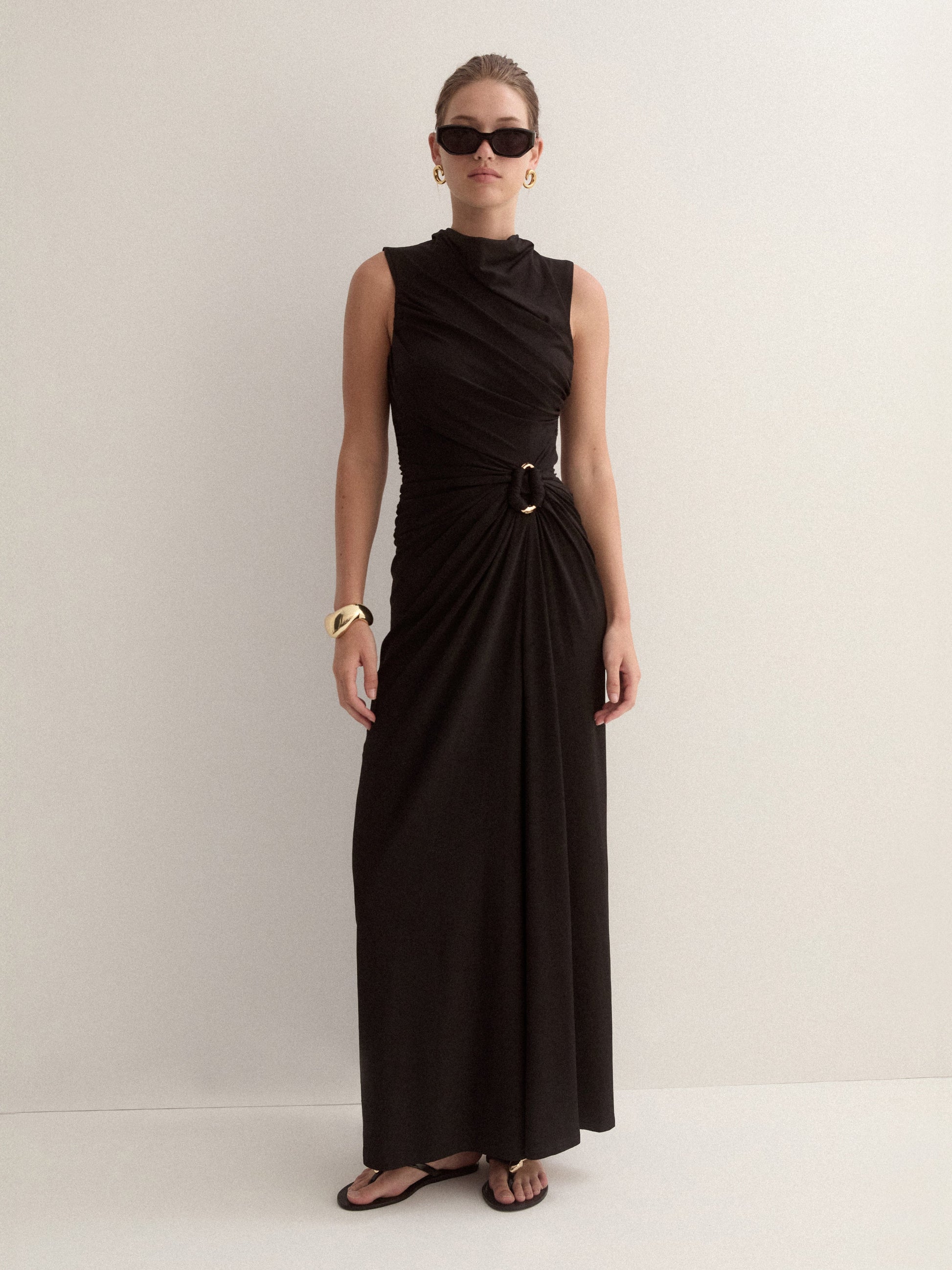 Timeless beauty redefined. Introducing the Simone Maxi Dress - showcasing a black stretch fabrication, slim fit cut to hips, draped cowl neckline, ruched bodice and hip, non functional buckle detail on hip, maxi skirt length and split. Pair with our Swirl Earrings to complete the look.