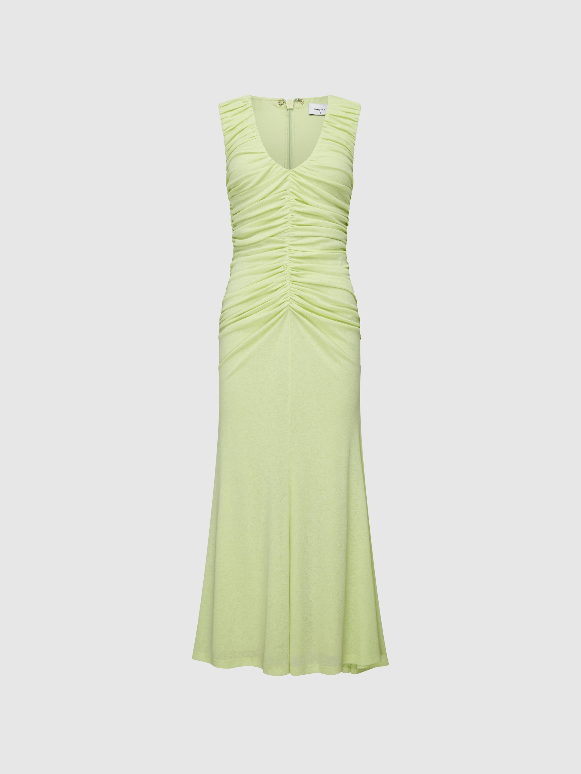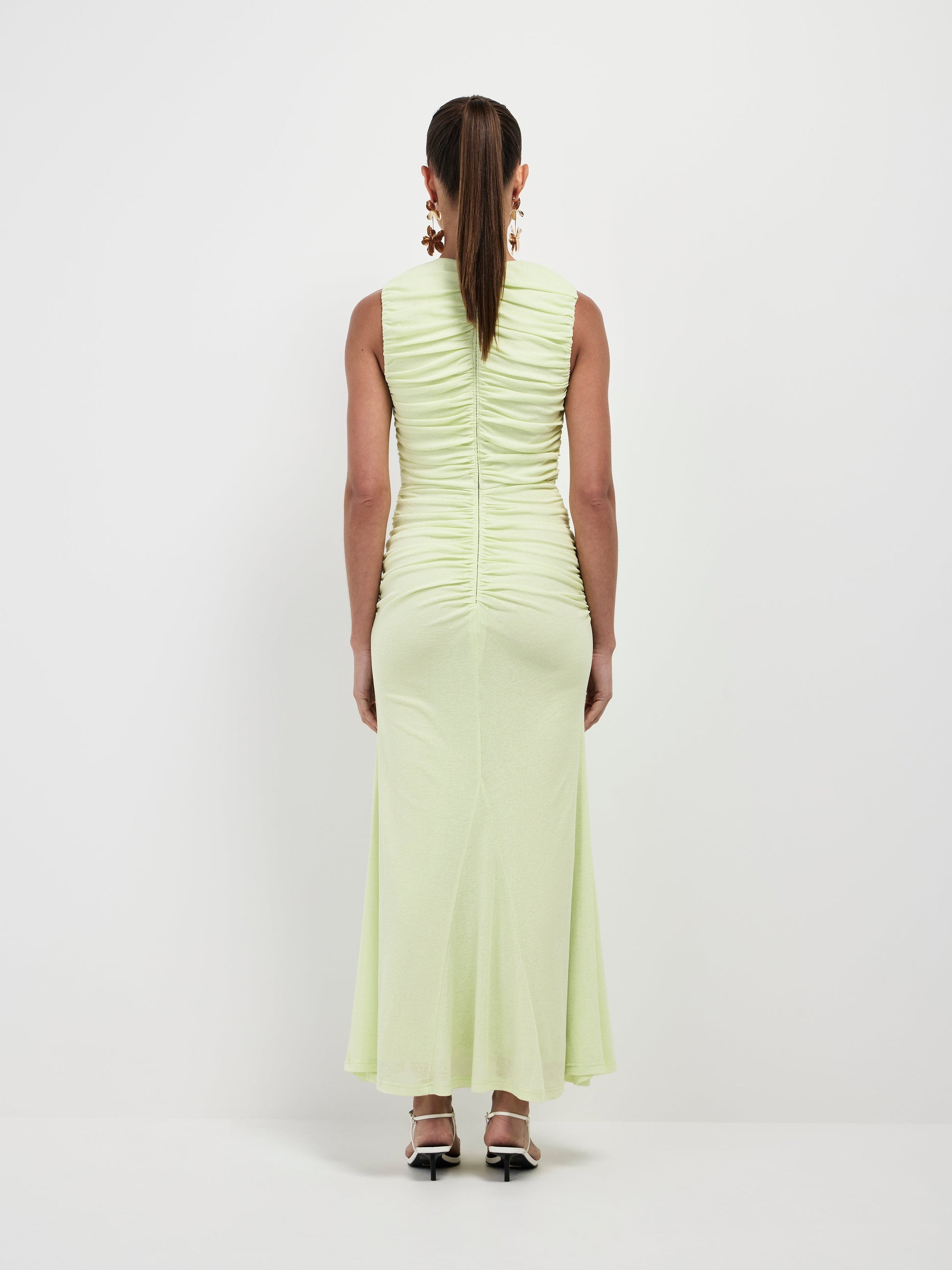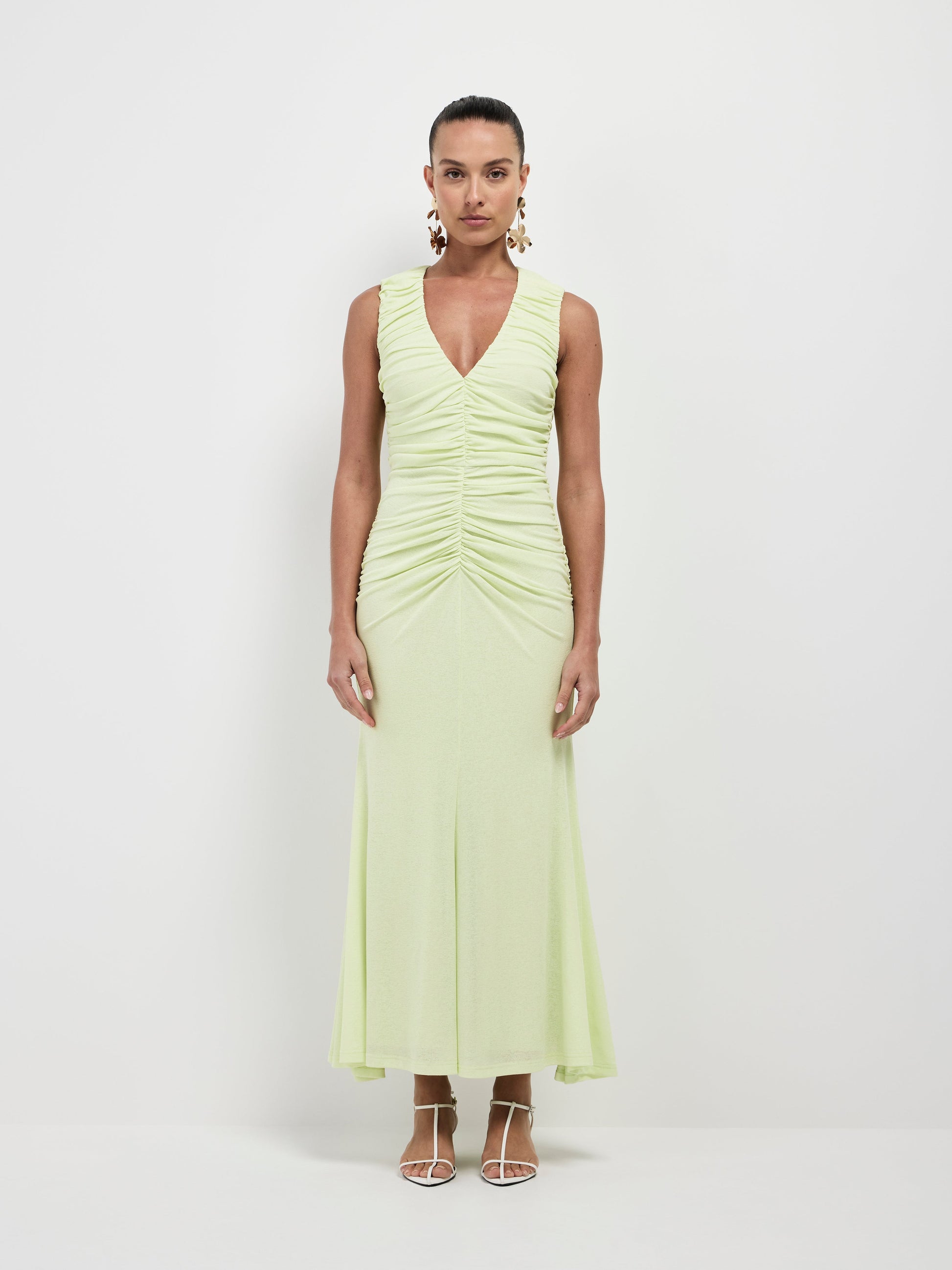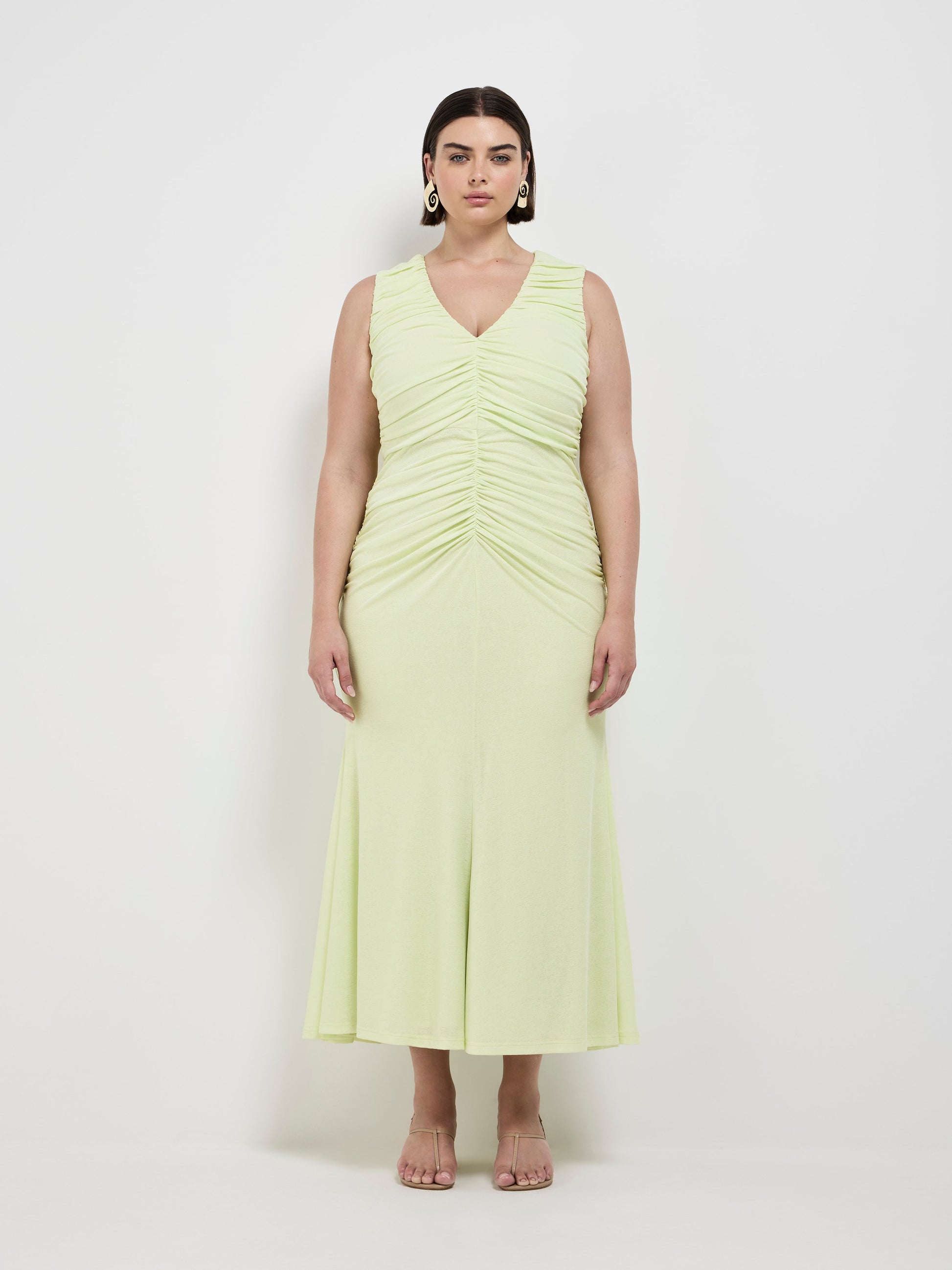 Unveil your inner goddess with the Siren Midi Dress. Showcasing a green stretch knit fabrication, fitted cut with full hem, midi length skirt and ruching through out bodice and hips. Pair with our Celia Earrings to complete the look.