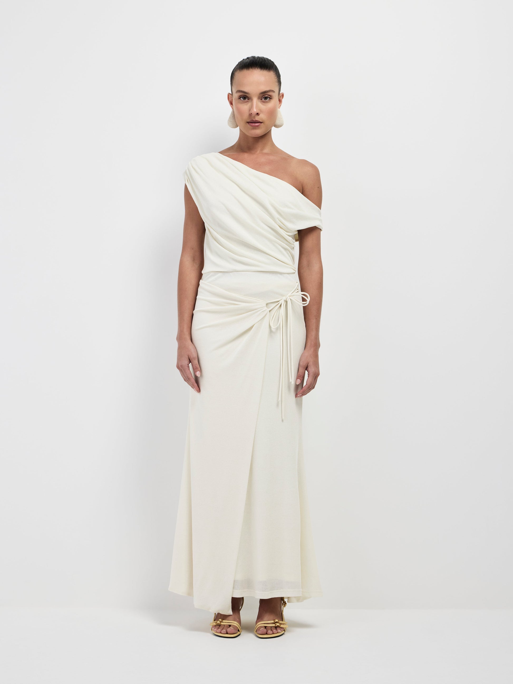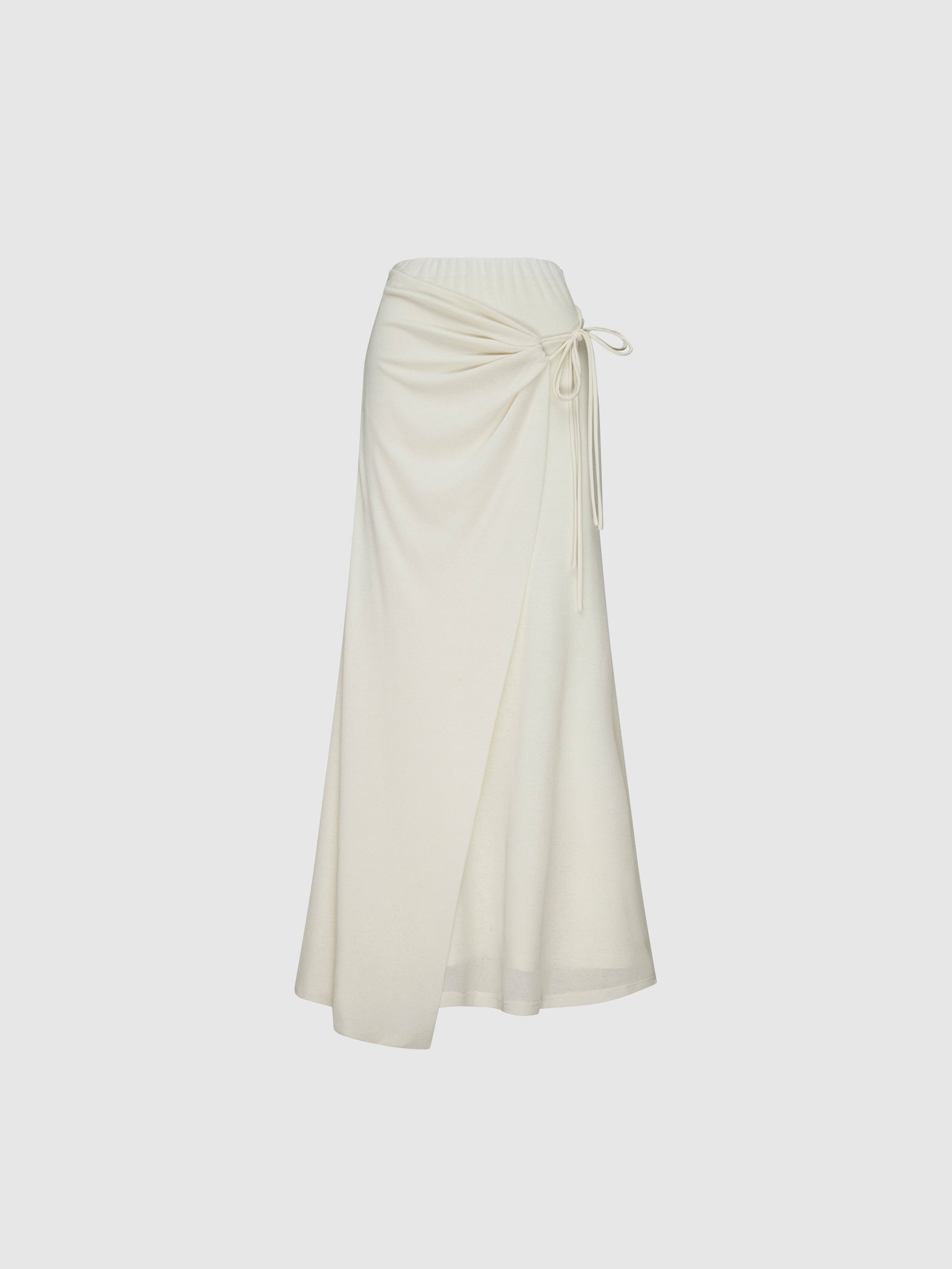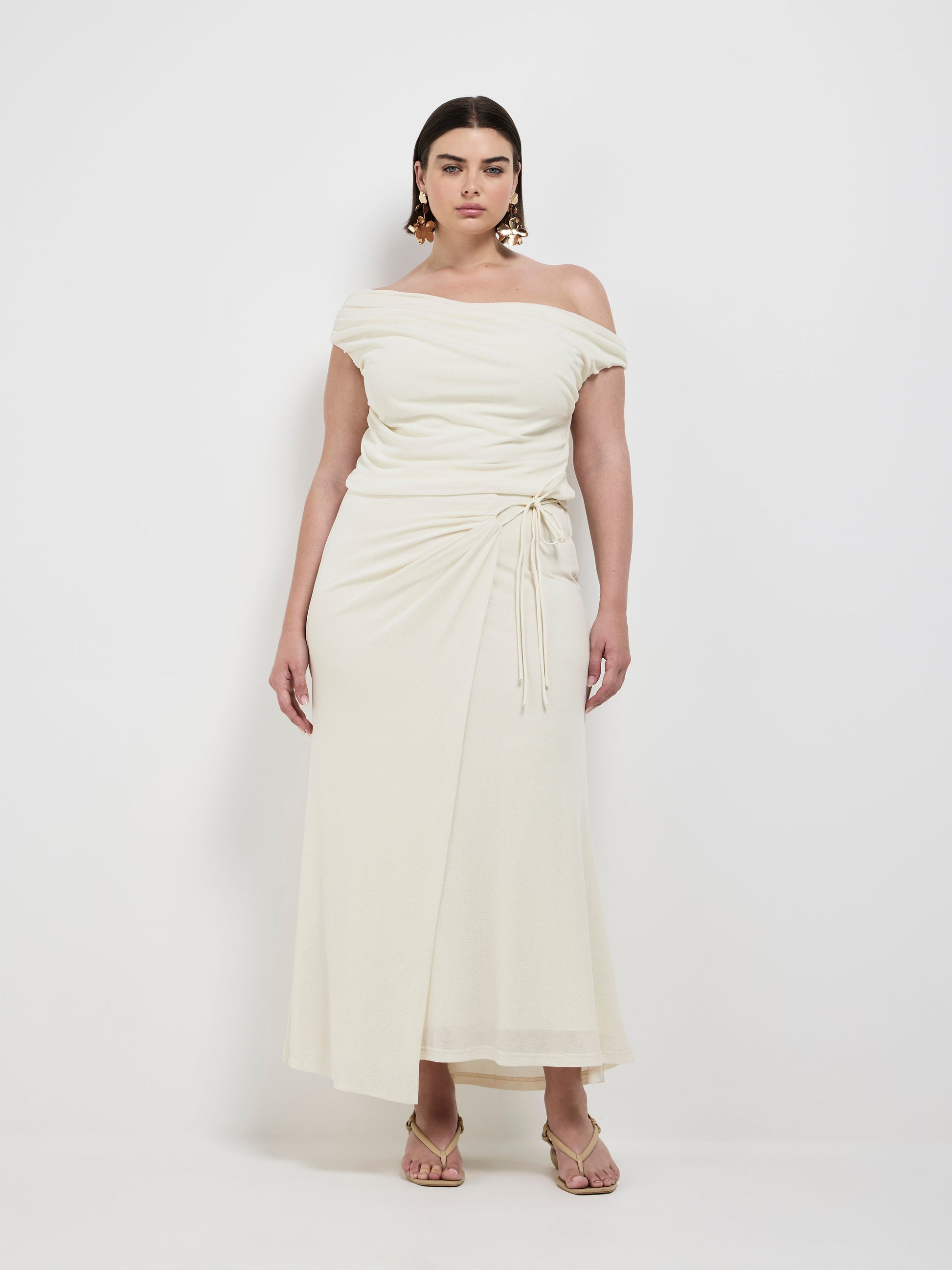 Unveil your inner goddess with the Siren Midi Skirt. Showcasing an ecru stretch knit fabrication, elasticated waist, front wrap with ties, midi length skirt and full lining. Pair with our matching Siren Top to complete the look.