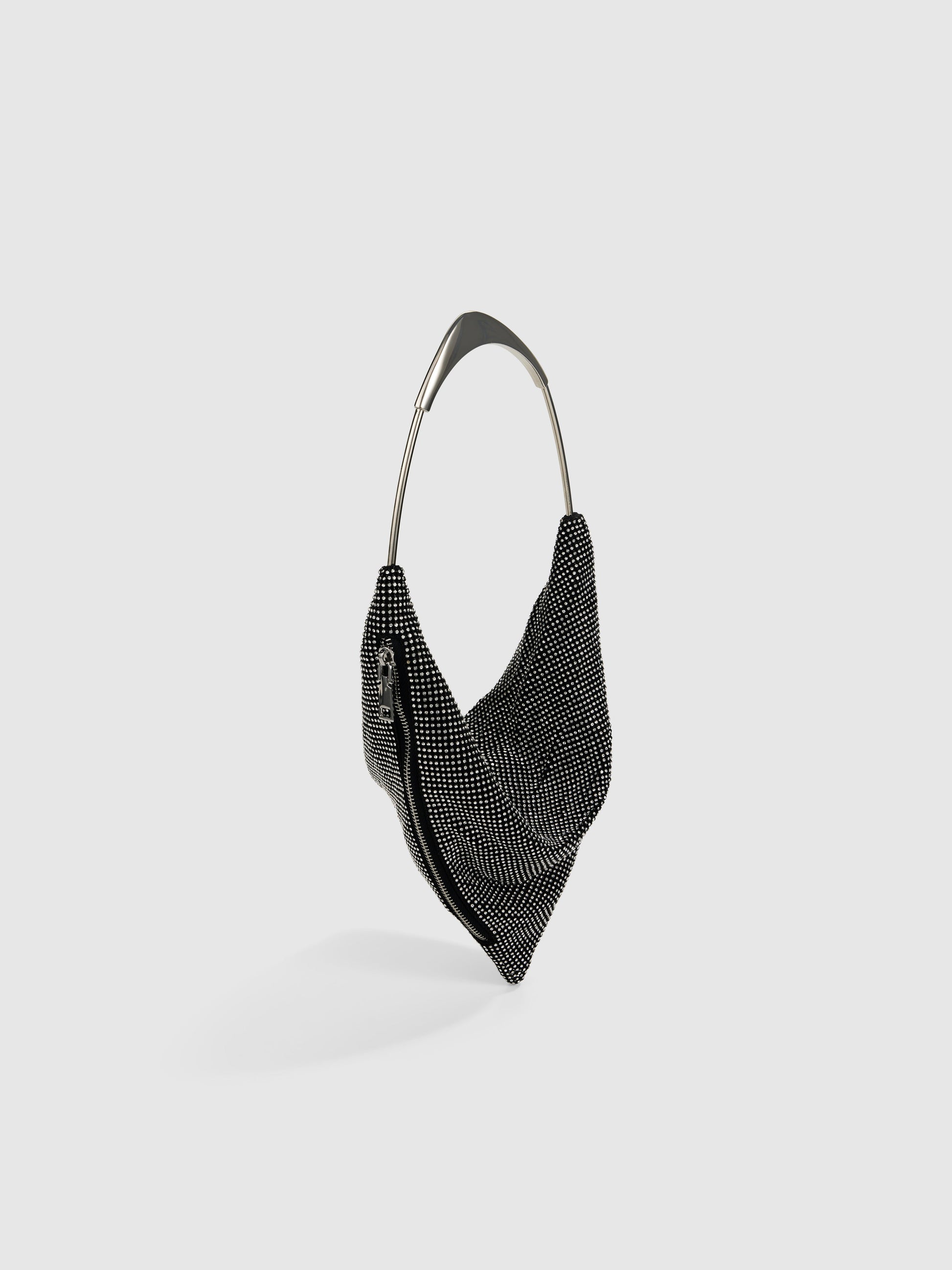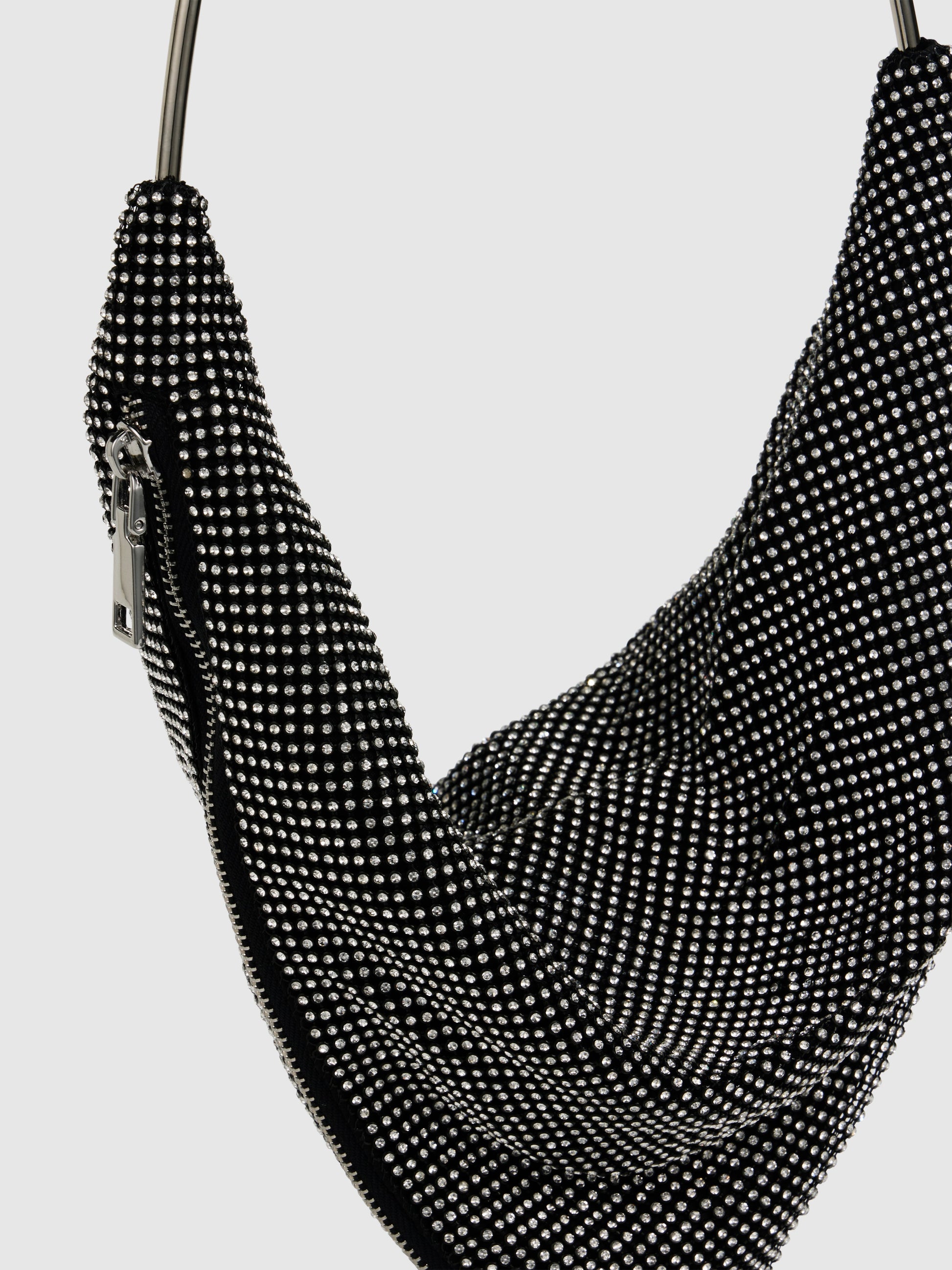Elevate your accessory game with the Skyline Bag. Featuring shimmering silver mesh adorned with delicate rhinestone accents and a structured silver handle.