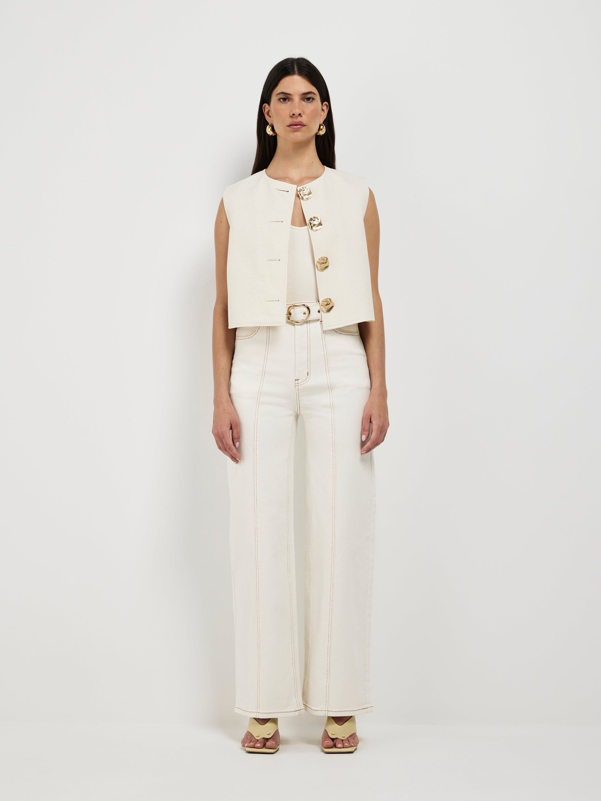 Polished and powerful - Introducing the Soho Vest Top. Showcasing a vanilla woven fabrication, relaxed styling, crew neckline and front button closure. Pair with our matching Soho Mini Skirt for a co-ord look.