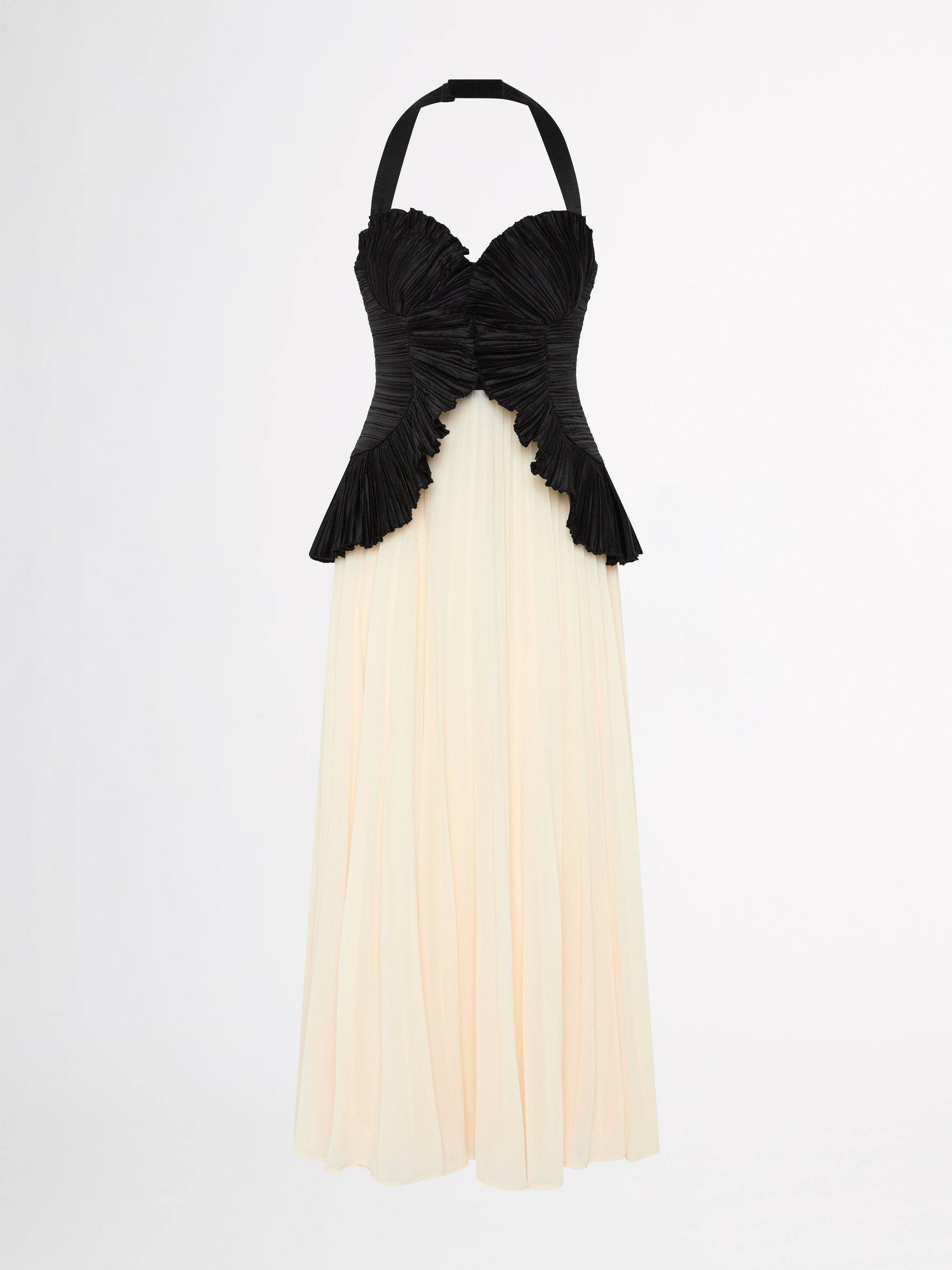 - Satin woven pleated fabrication with contrast chiffon skirt