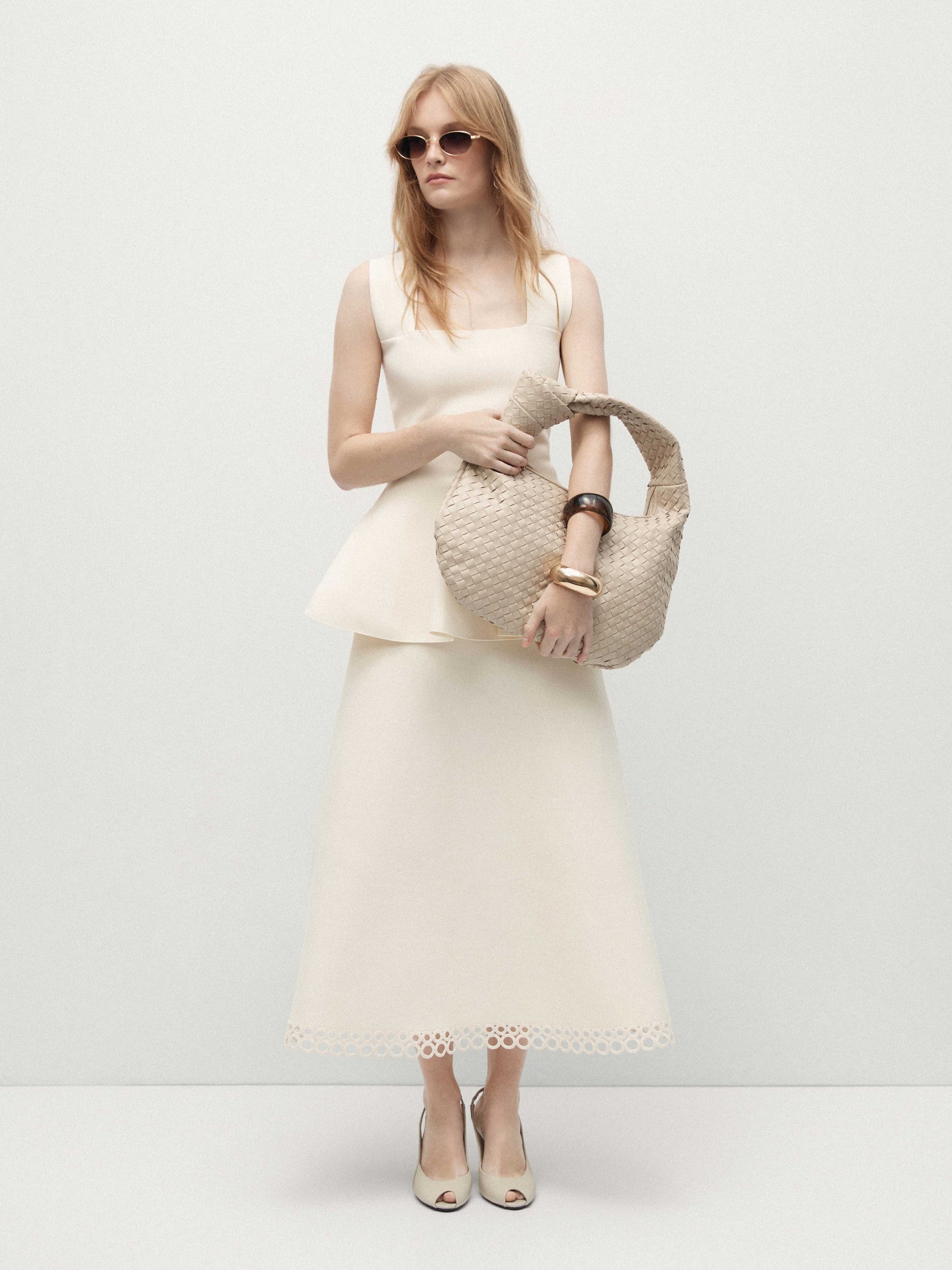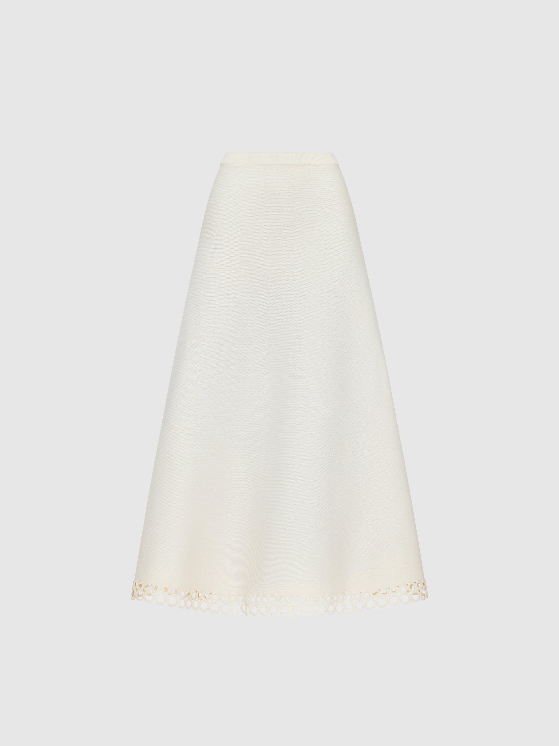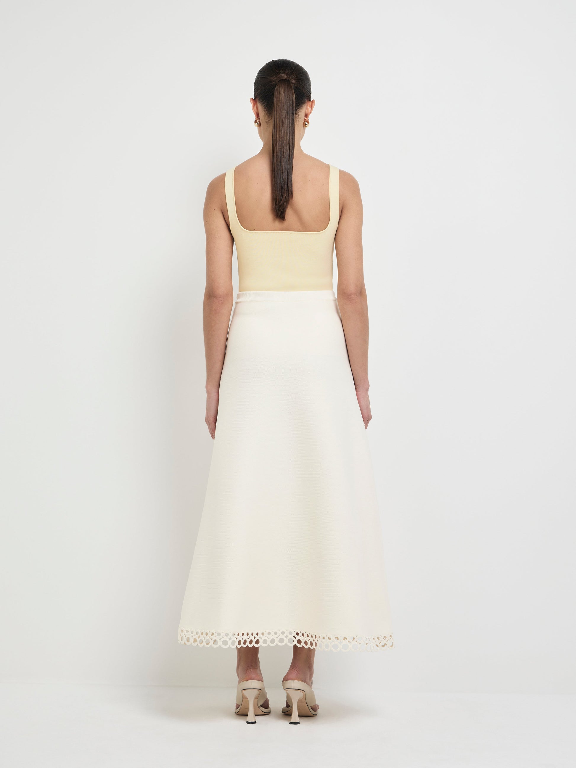 Statement style made effortless - Introducing the Stephanie Skirt. Versatile and flattering, this ivory stretch knit skirt features a A-line midi length styling, elasticated waistband and circular trim detail at hem. Pair with our matching Stephanie Top to complete the look.