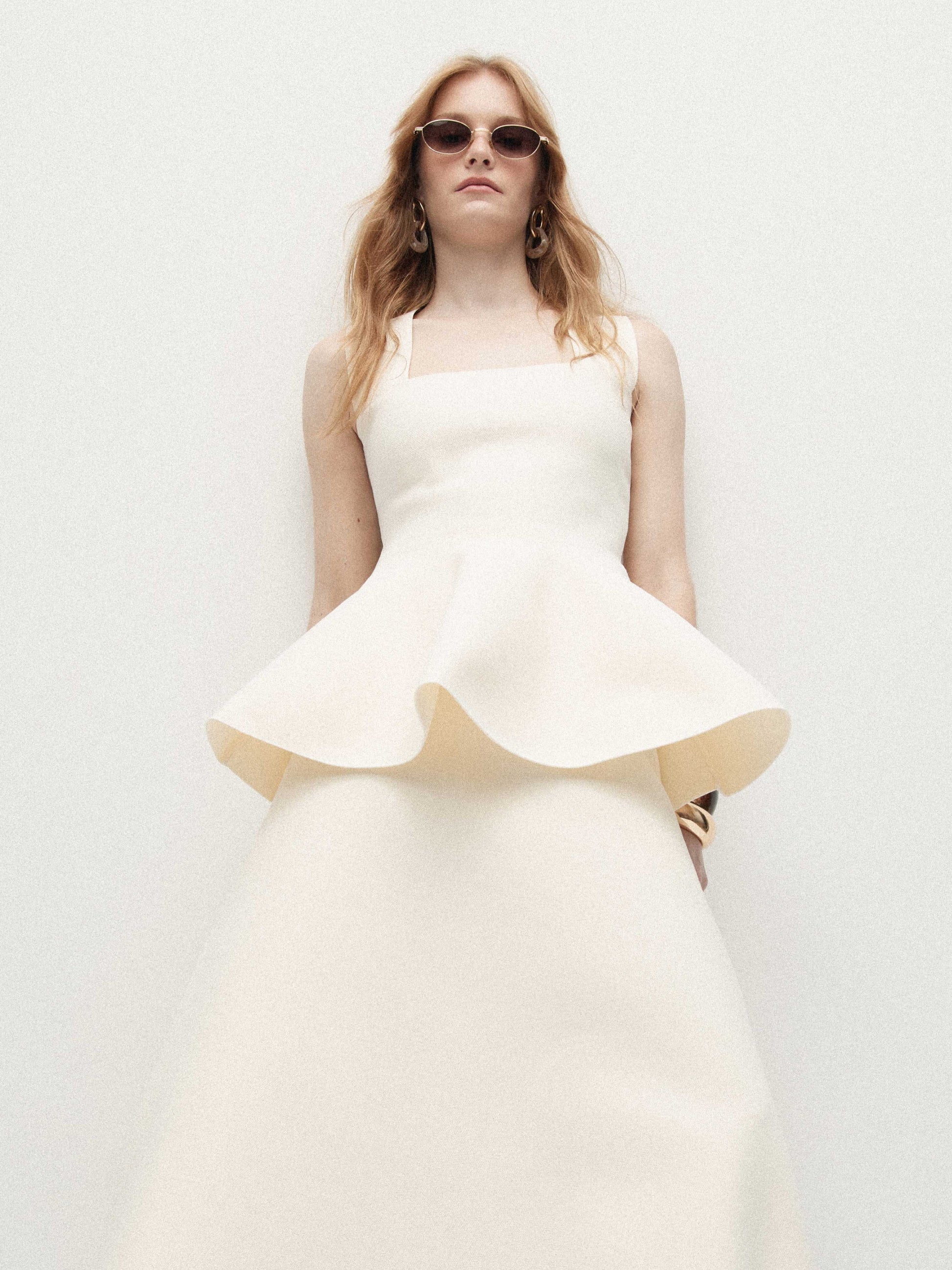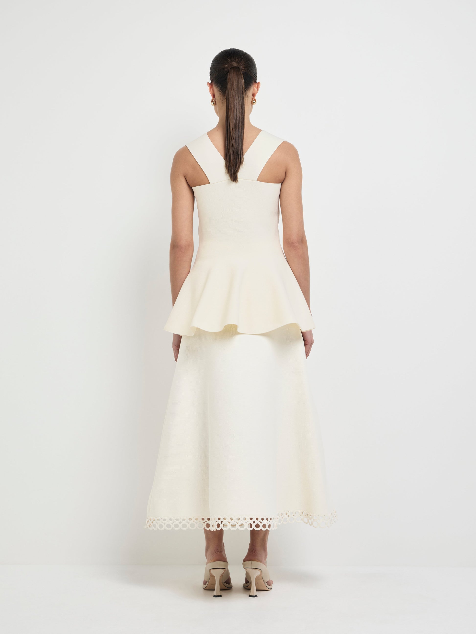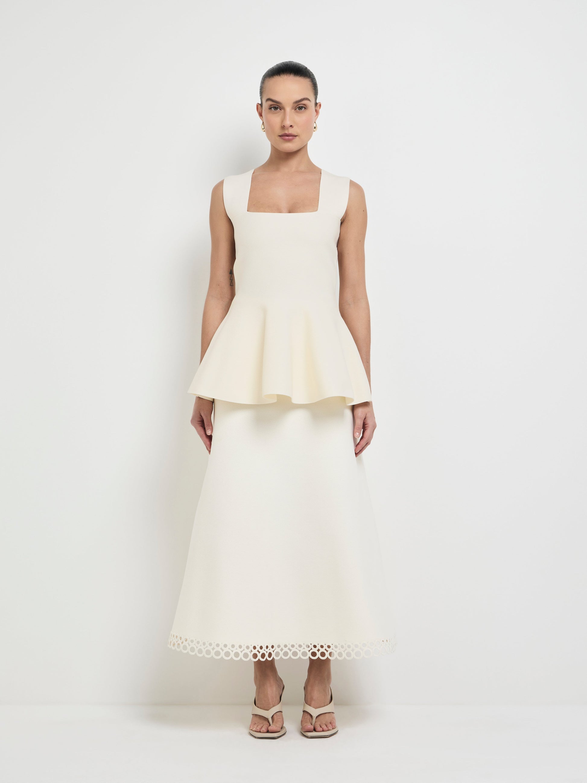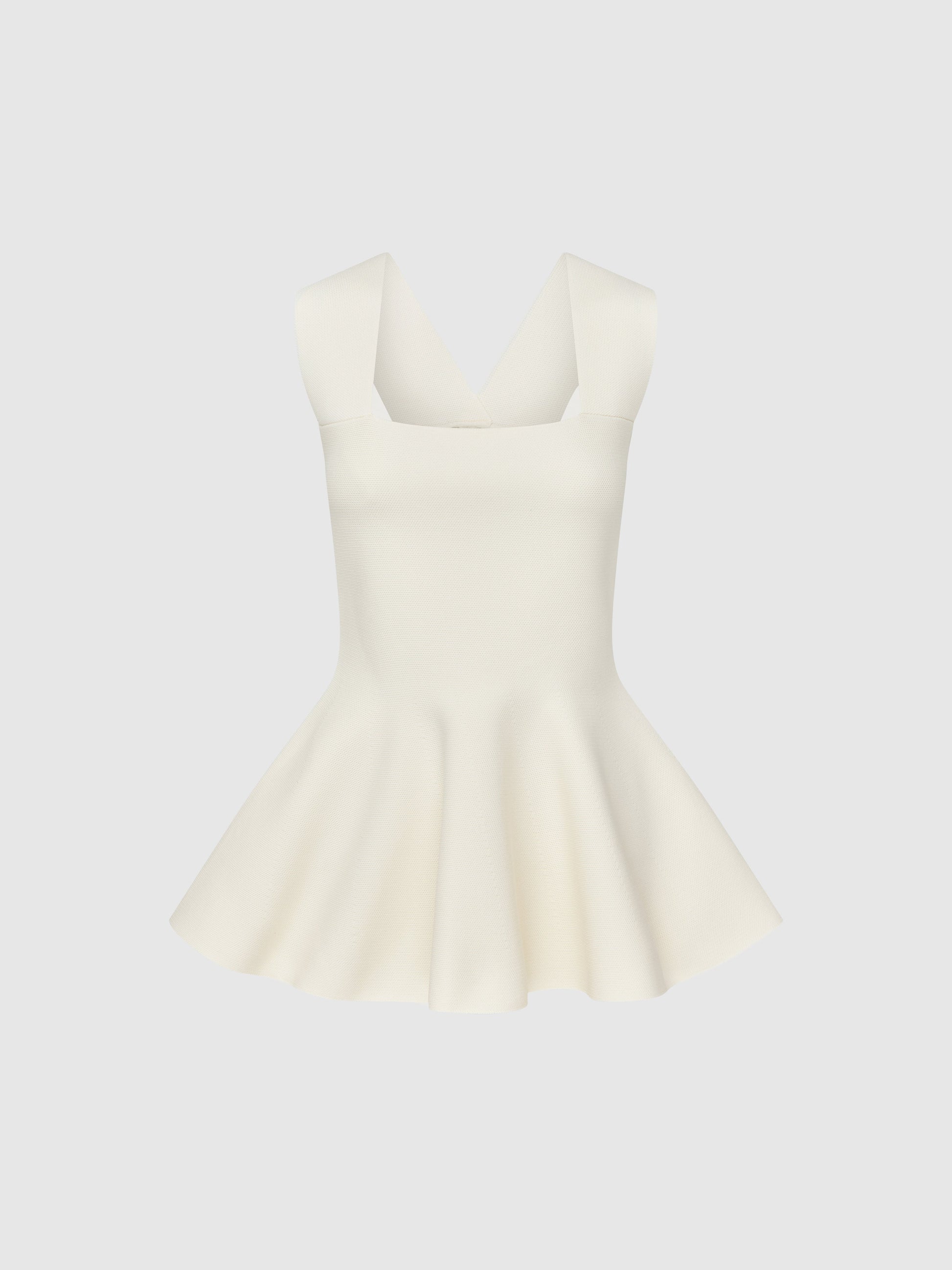 Statement style made effortless - Introducing the Stephanie Top. Versatile and flattering, this ivory stretch knit top features a fitted styling with peplum hem, straight neckline and wide straps. Pair with our matching Stephanie Skirt to complete the look.