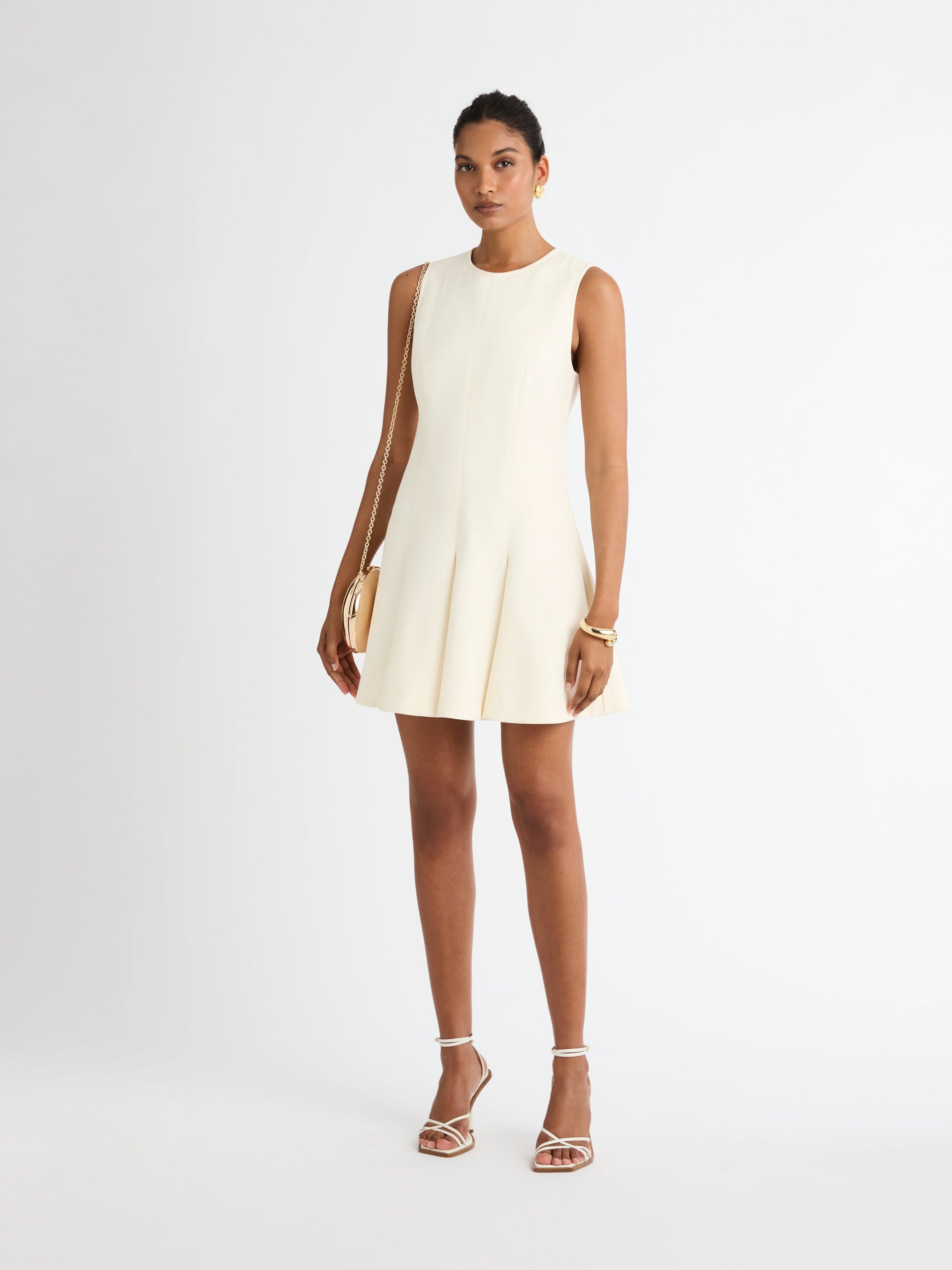 An effortless, polished look to take you into the new season. Introducing the Stockholm Mini Dress, showcasing a woven fabrication, crew neckline, godet detail hem, vertical seams with top stitching and mini skirt length. Pair with our Raye Earrings to complete the look.