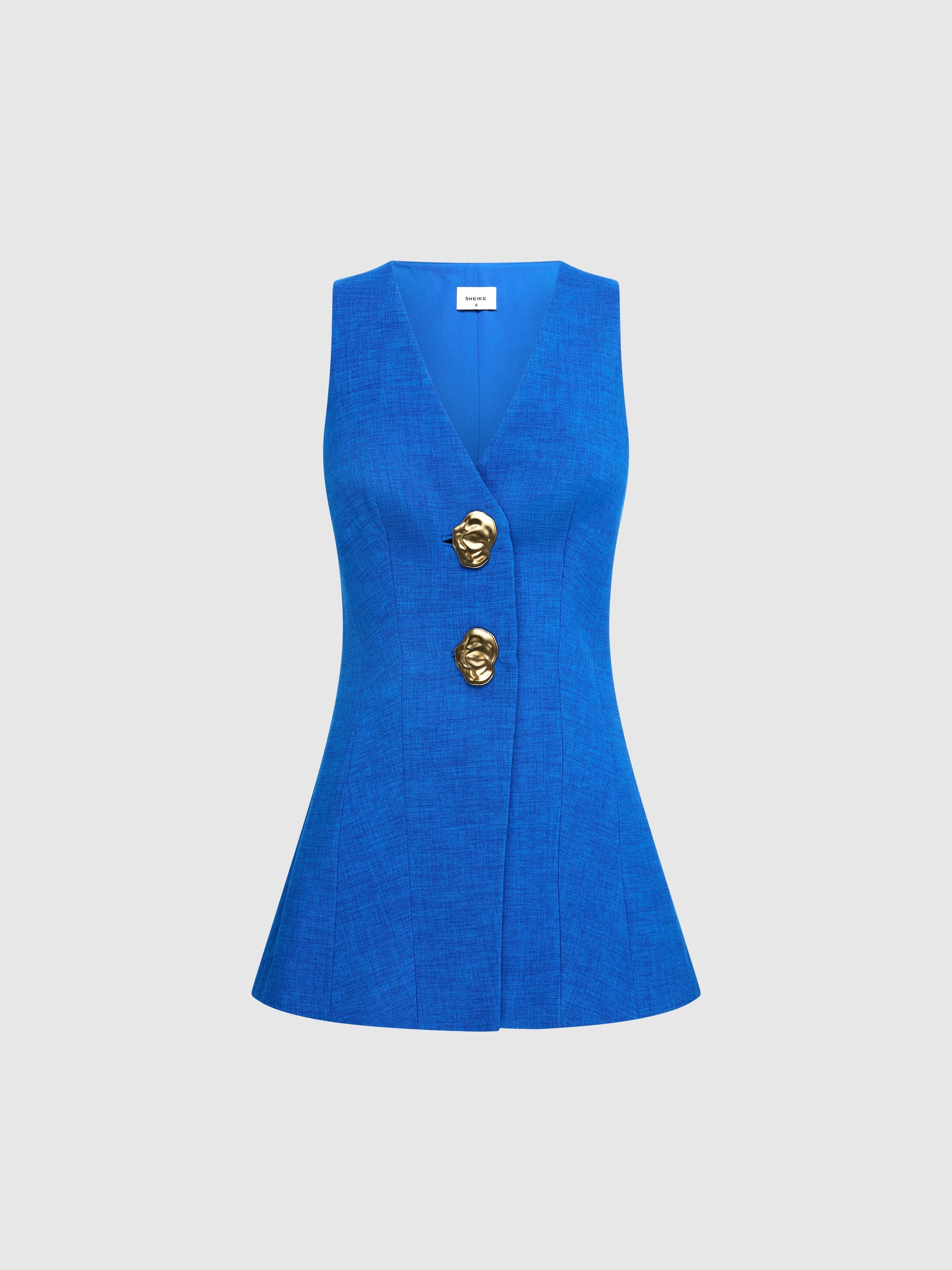 Modern sophistication to refresh your collection - Introducing the Suzie Vest. Showcasing a cobalt woven fabrication, a slim fit, large gold feature buttons, sleeveless and deep V neckline. Pair with our matching Suzie Mini Skirt to complete the look.