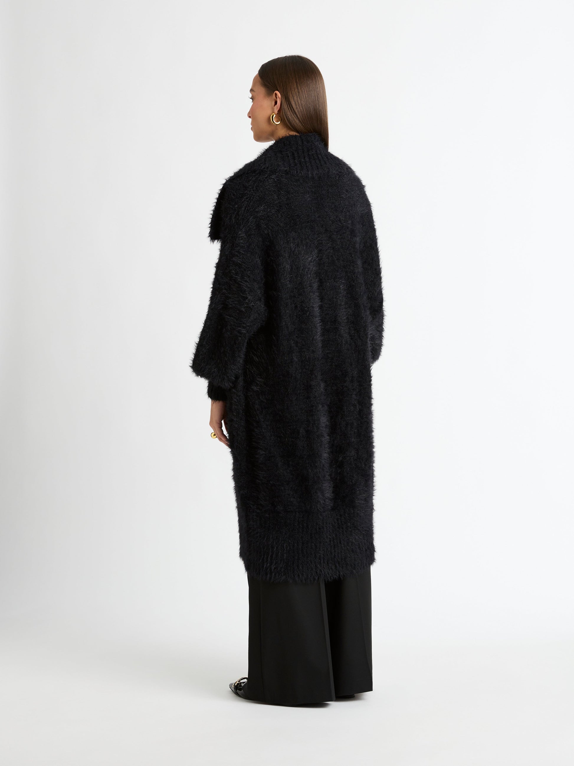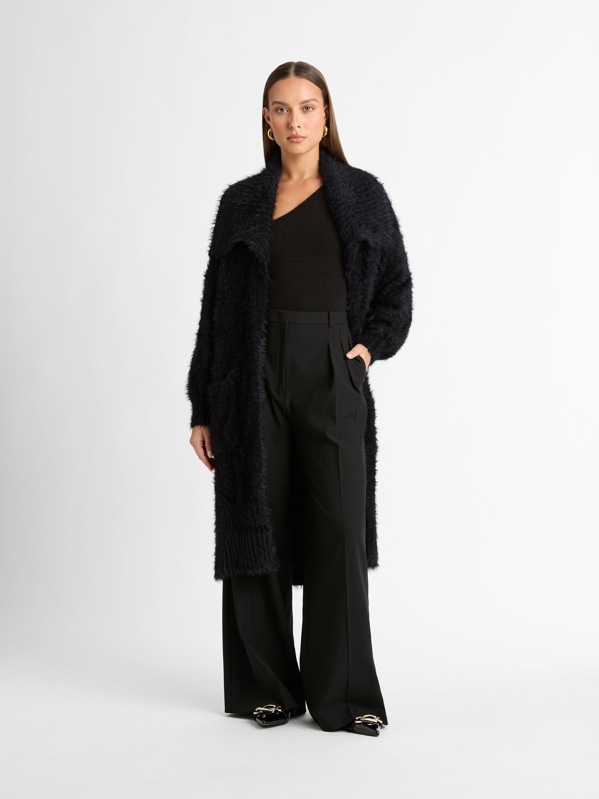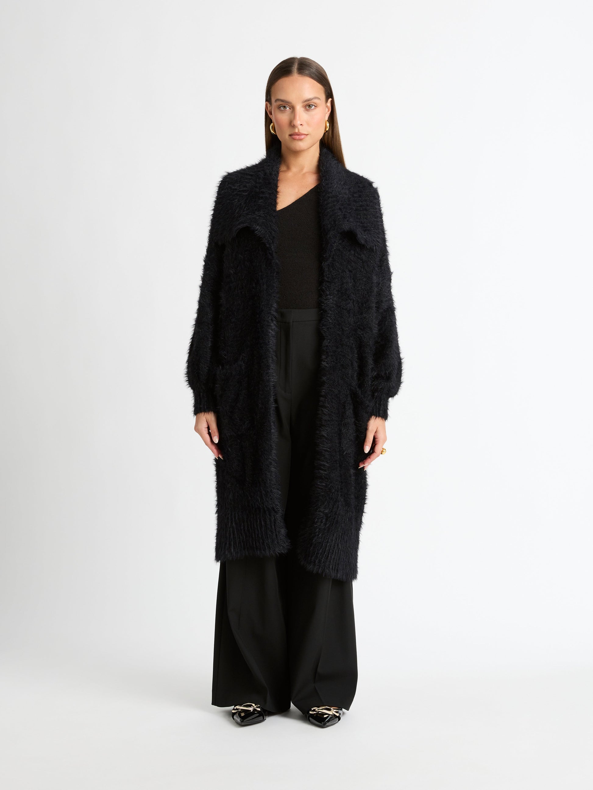 The ultimate staple cardi to see you into the colder months. Introducing the Sybil Long Cardi - showcasing a textured fur like knit fabrication, shall collar, long sleeves, patch pockets and relaxed cut. Pair with our Nova Knit Top and Bradshaw Pant to complete the look.