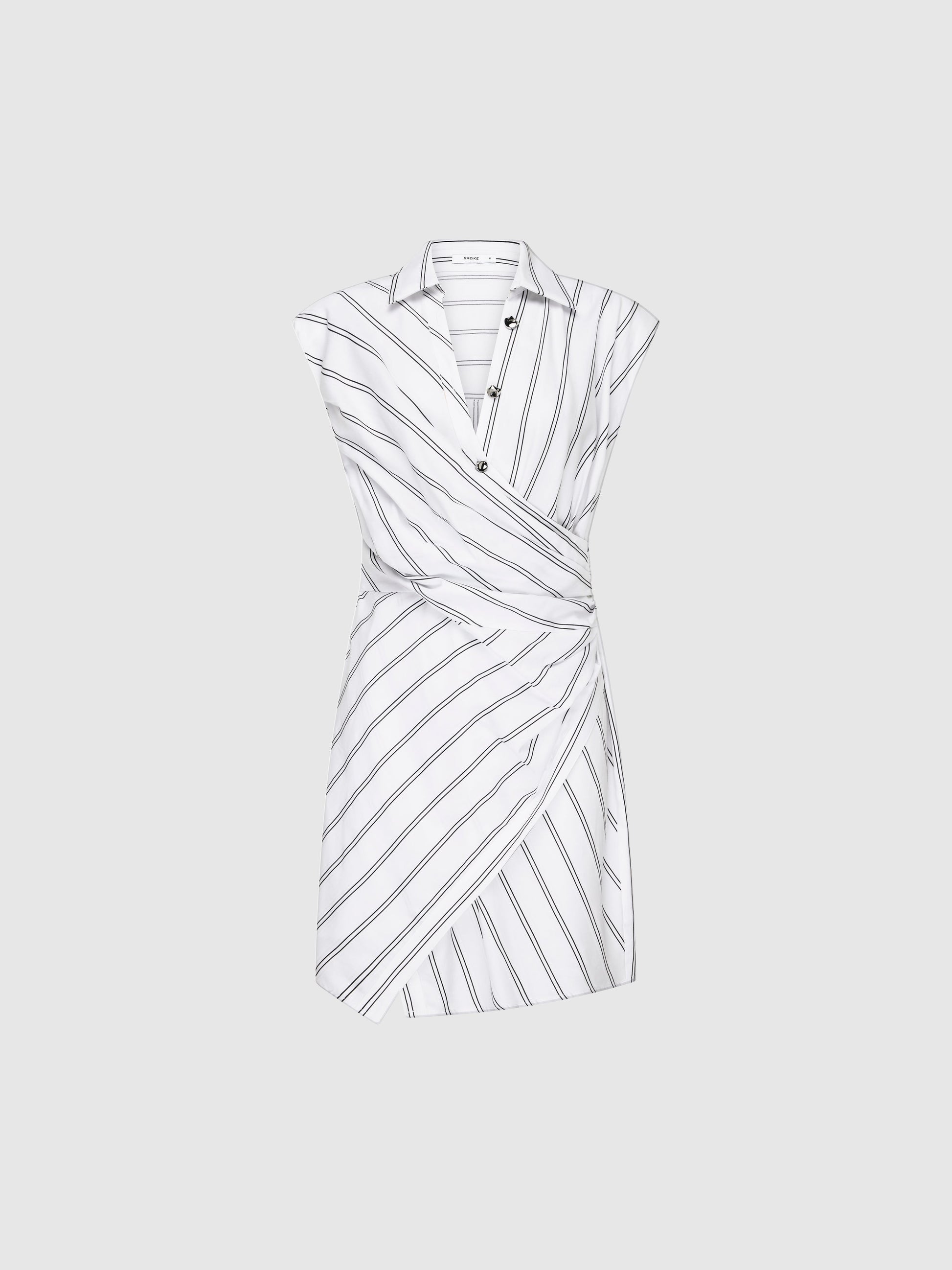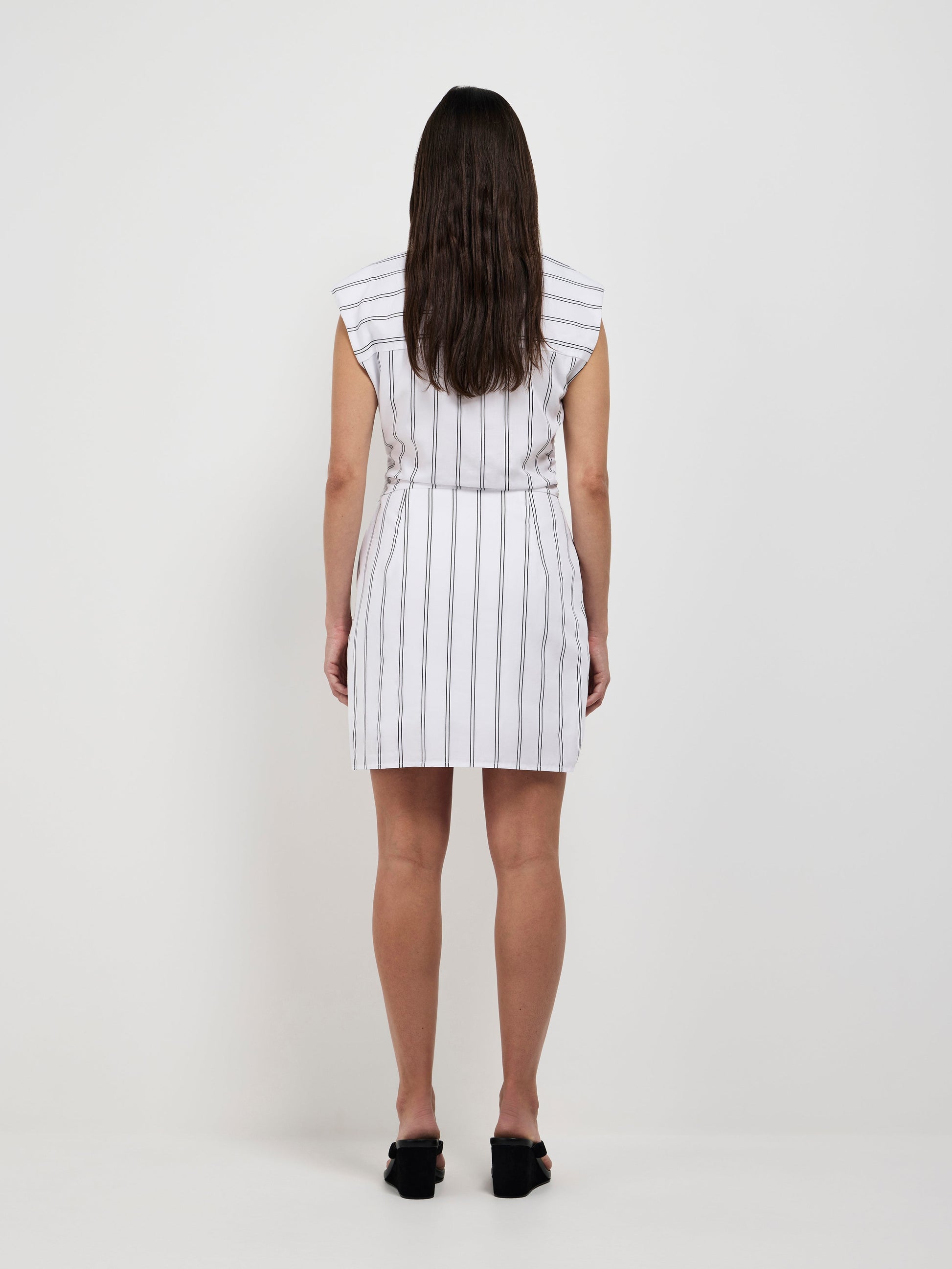 Classic stripes meet effortless silhouettes. Introducing the Teresa Mini Dress - showcasing stripe woven fabrication, slim fit, collared neckline, wrap detailing at waist and mini skirt length. Pair with our Whimsy Earrings to complete the look.
