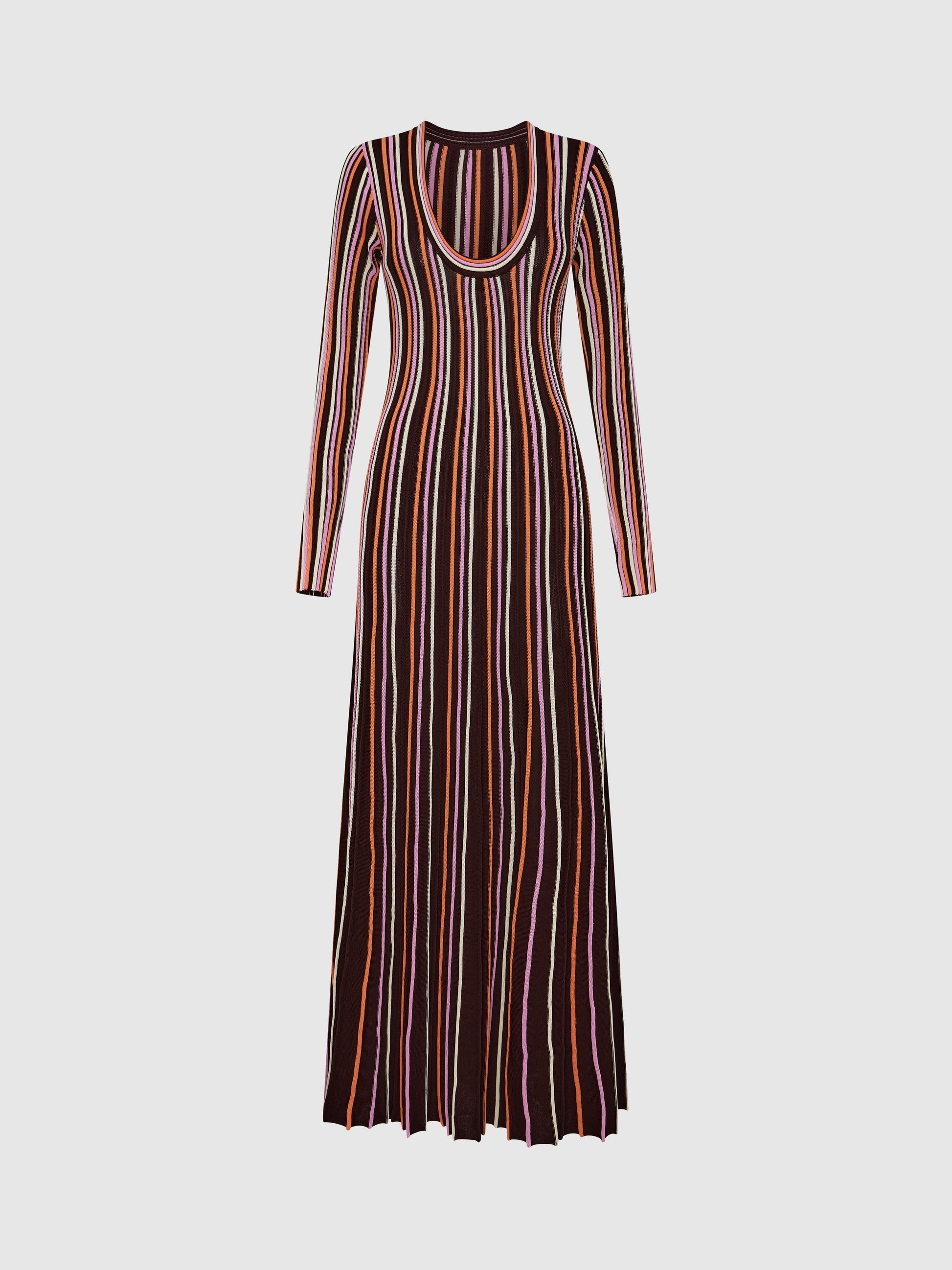 The Ti Maxi Dress is giving major Autumn energy! Featuring a stripped ribbed knit fabrication, long sleeves, fit and flare styling, maxi length skirt and crew neckline with ribbed neck band. This dress can be worn reversed to feature a lower scoop neckline.