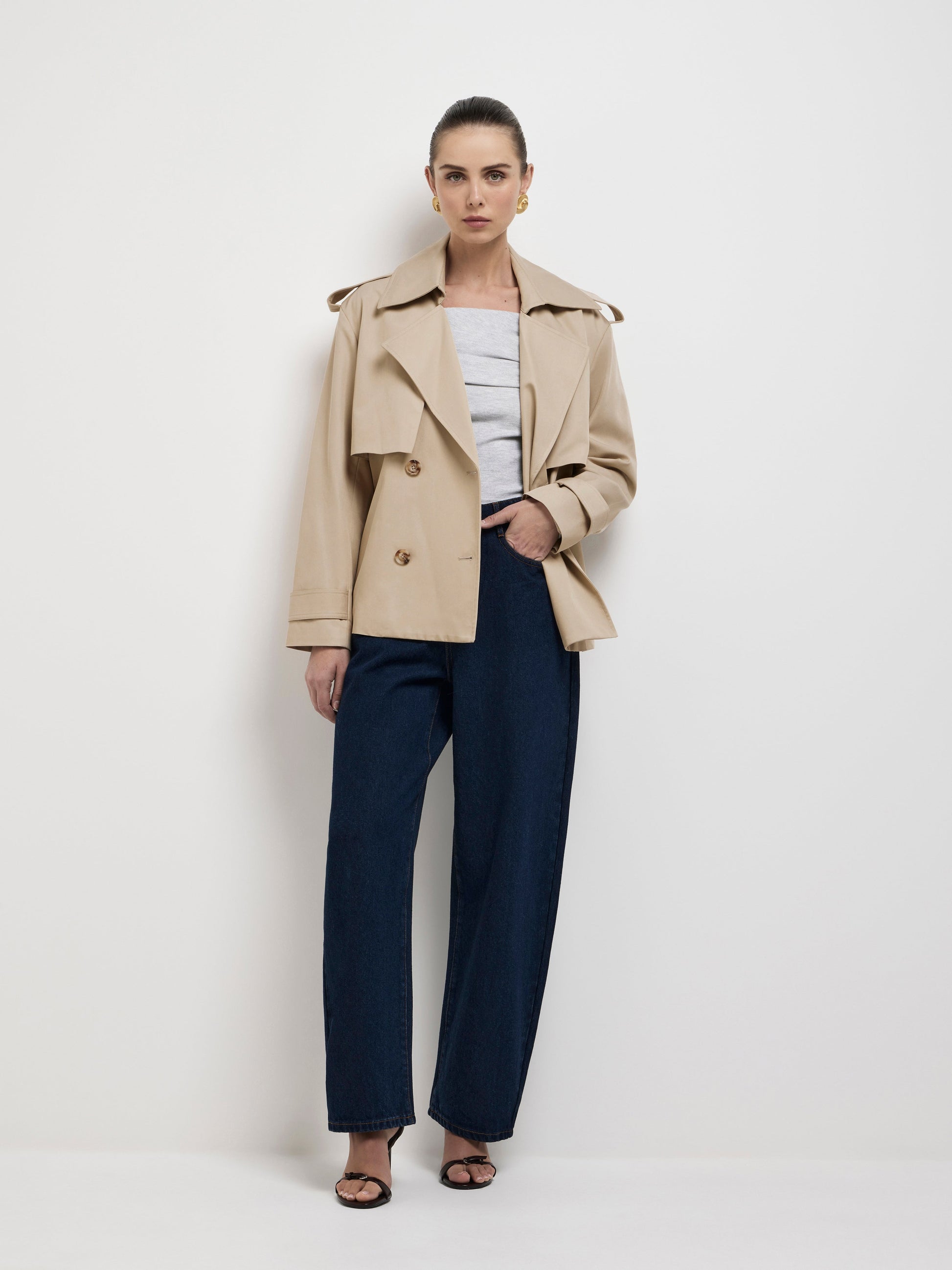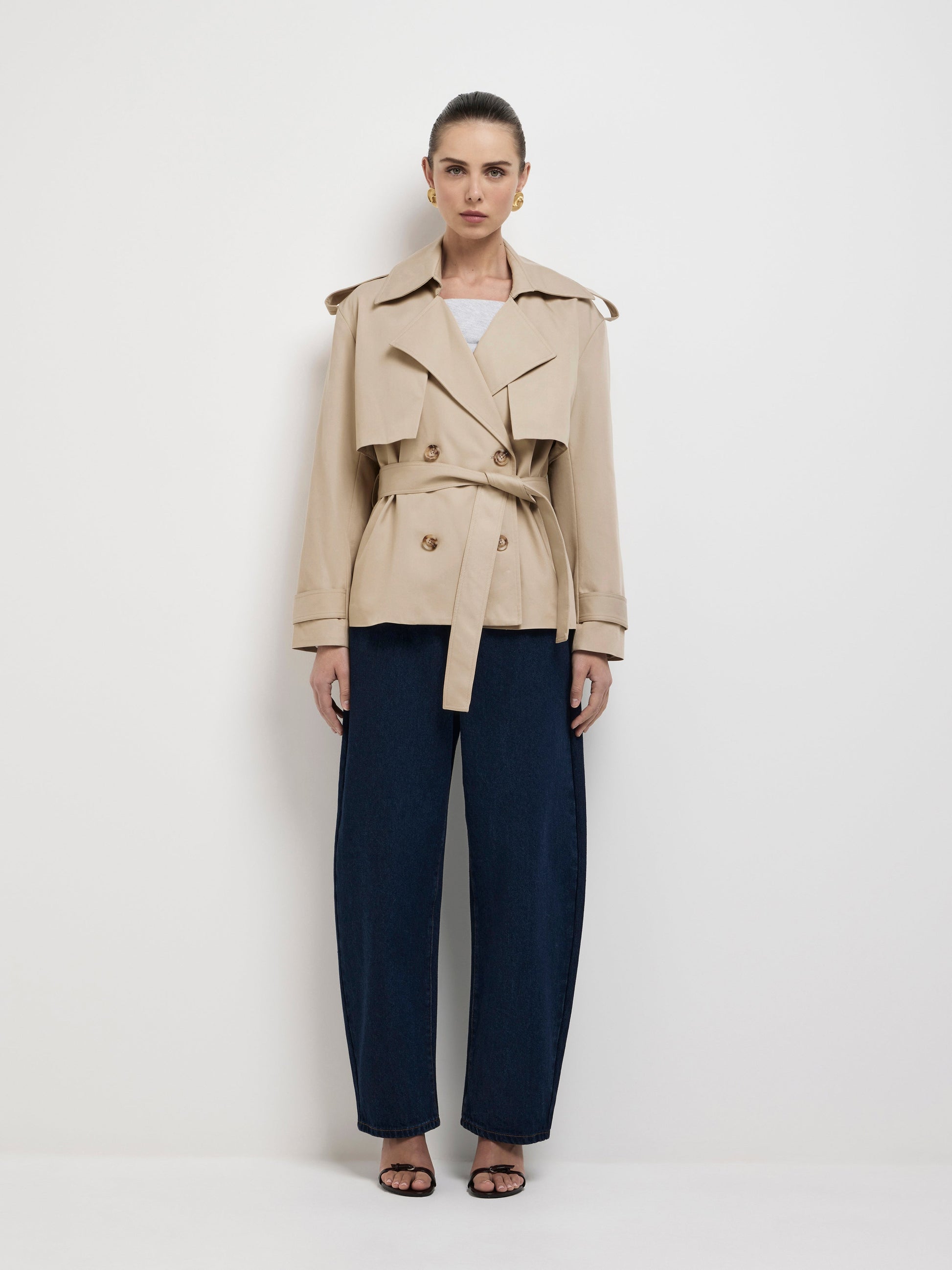 Revamp your Jacket game with the Tiva Jacket. This sophisticated style in classic tan is the perfect cropped length, making it ultra versatile. Featuring a silk blend fabrication, relaxed styling, cropped length, collar and lapel and belted waist. Pair with our Danika Jeans to complete your look!