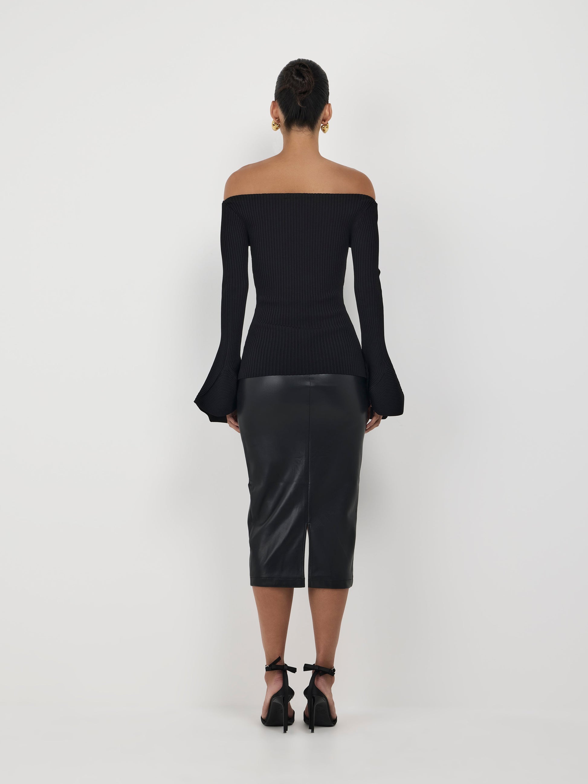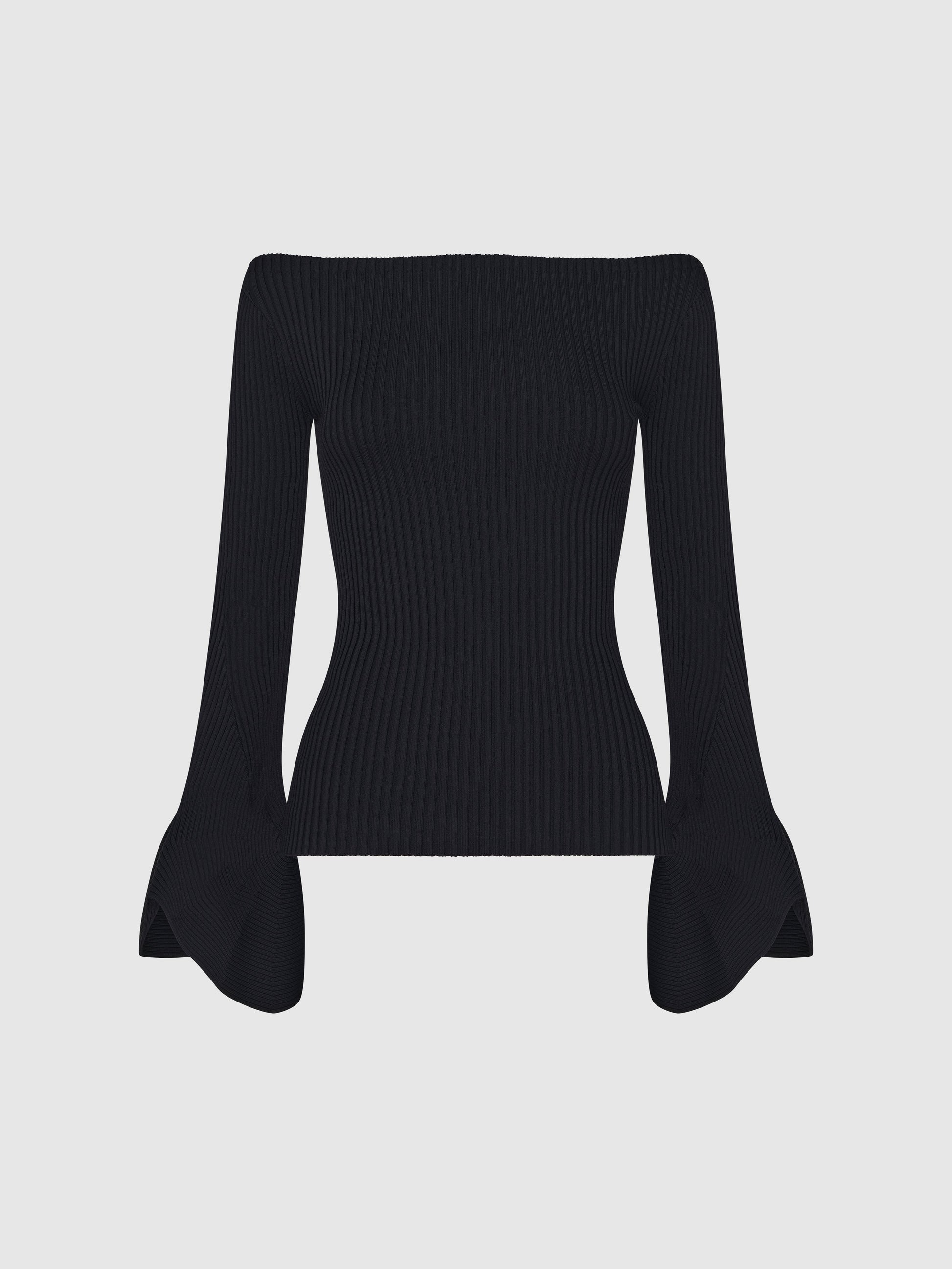 Elevate your basics game with the Tori Knit Top. Combining the off the shoulder trend with a flattering black stretch knit fabric, long sleeves with flared him detail and fitted styling. Pair with our Gotham Skirt to complete the look!