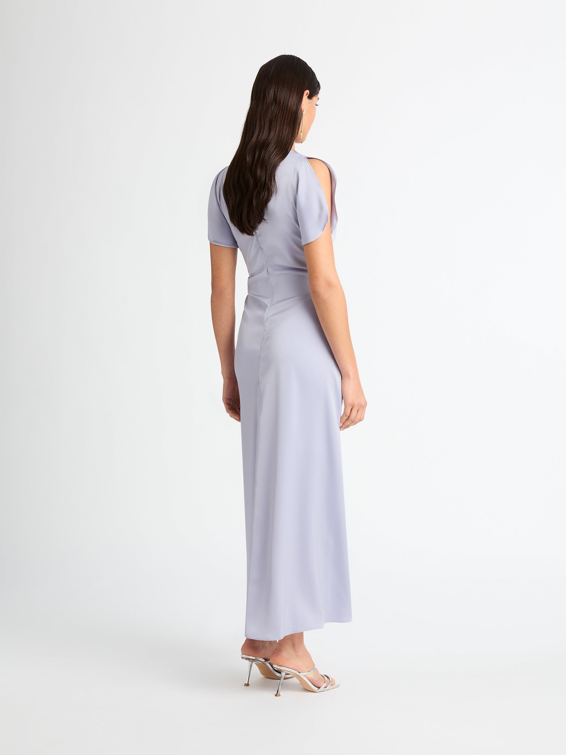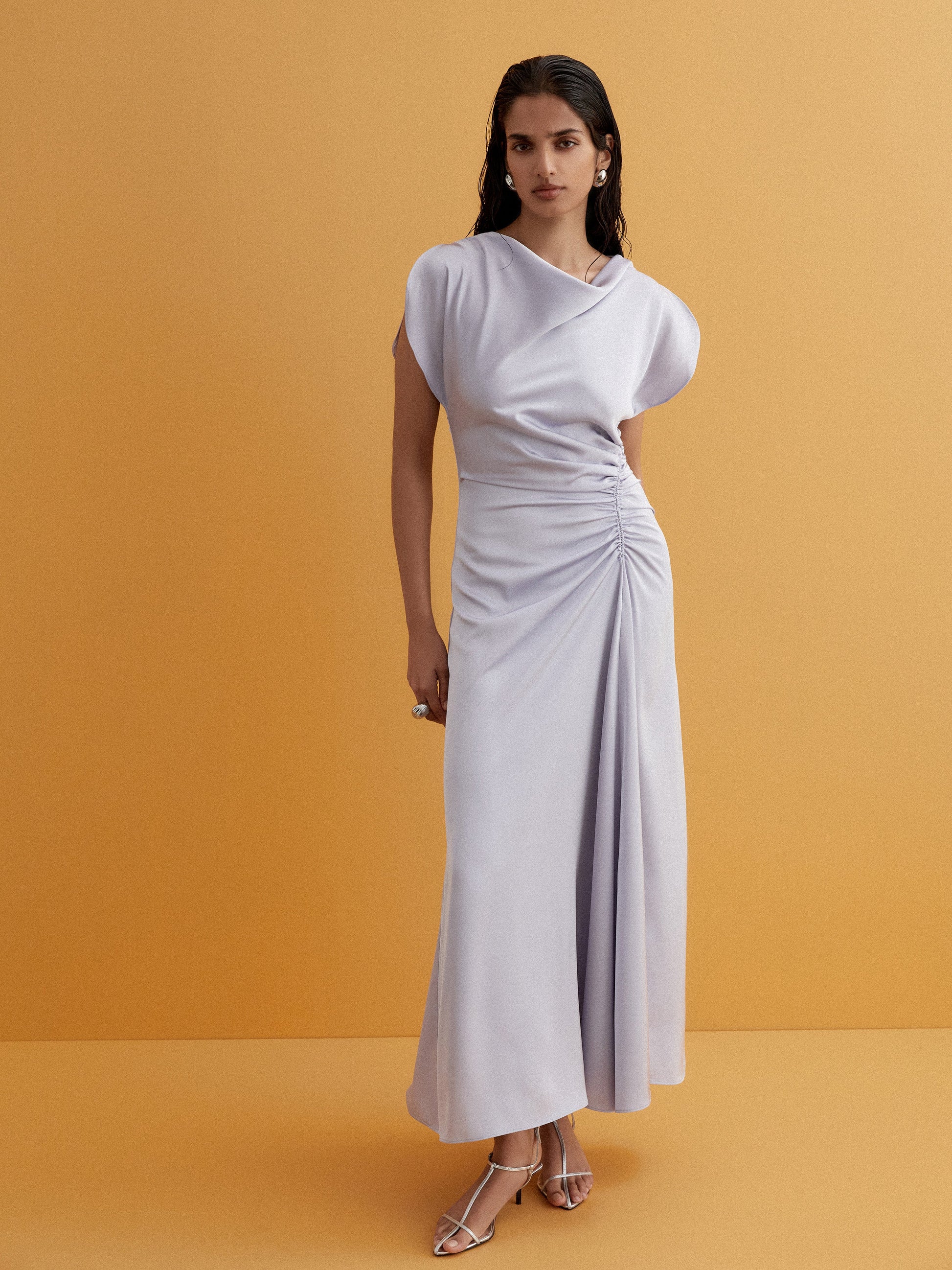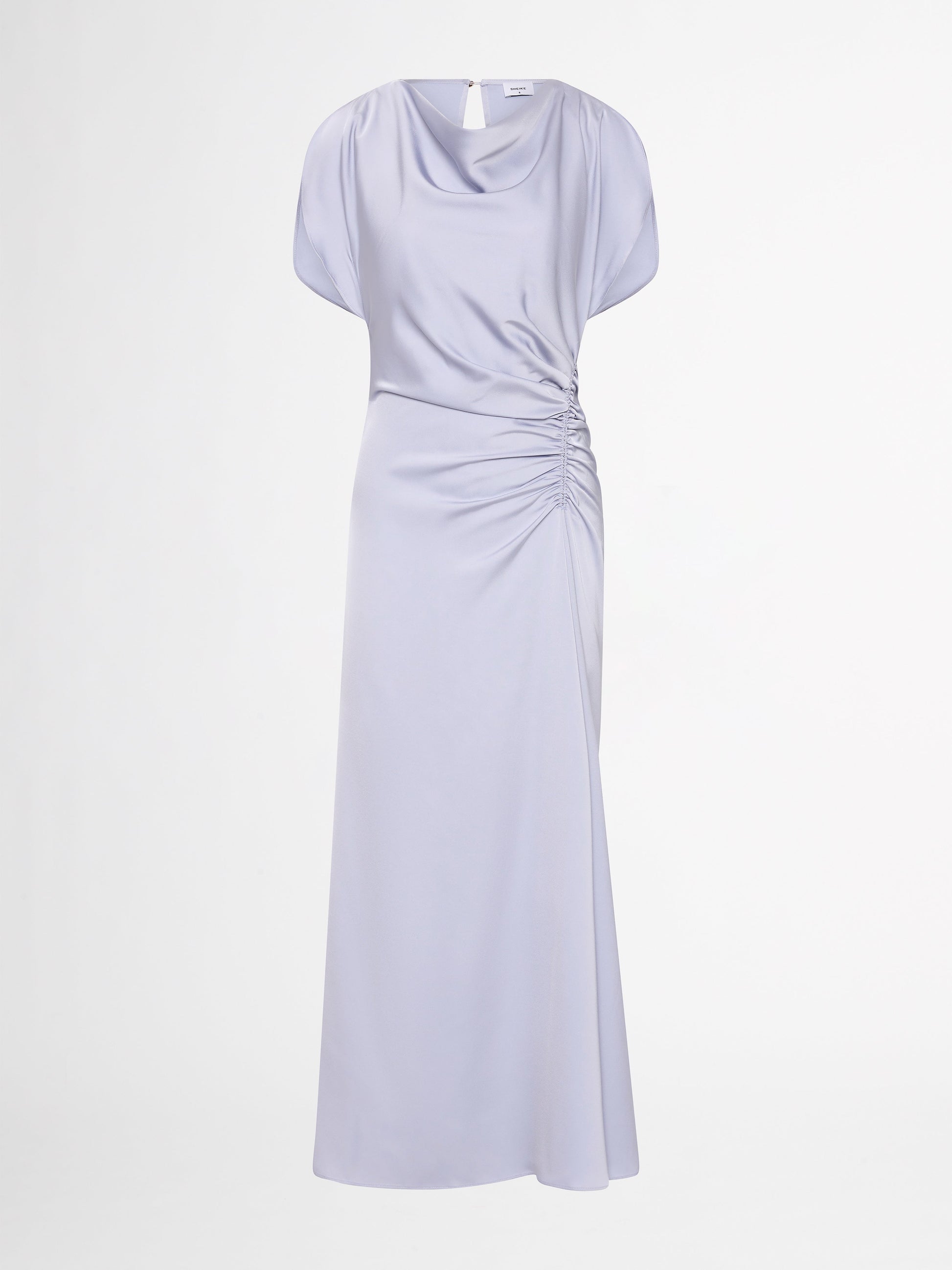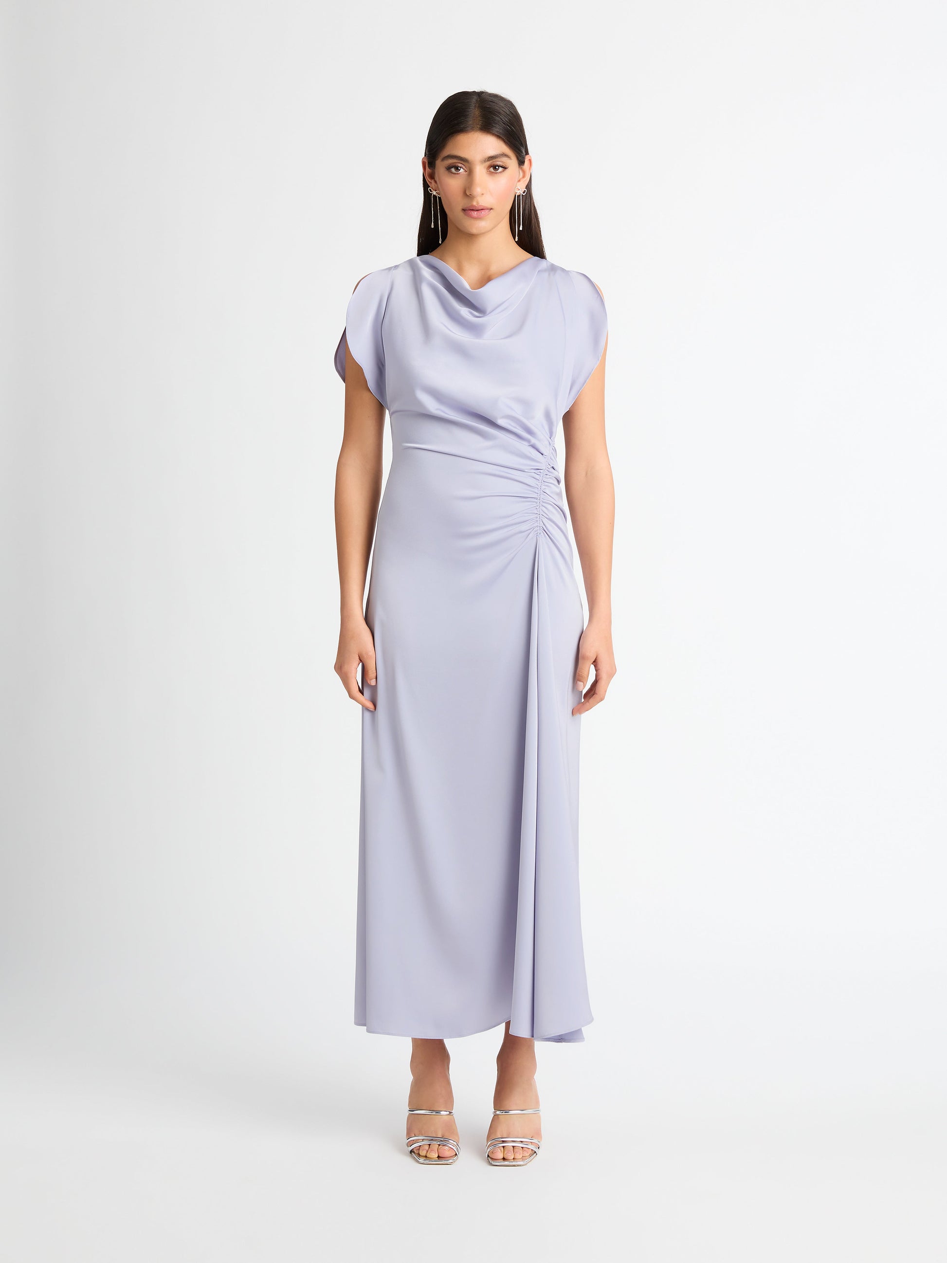 Make a lasting impression with the Tully Draped Maxi Dress. Featuring a silver blue satin woven fabrication, maxi ankle length skirt, cowl front neckline, sleeveless, ruching at left side seam waist, center back zip and internal mesh mini slip. Pair back with our Blaire Earrings to complete the look.