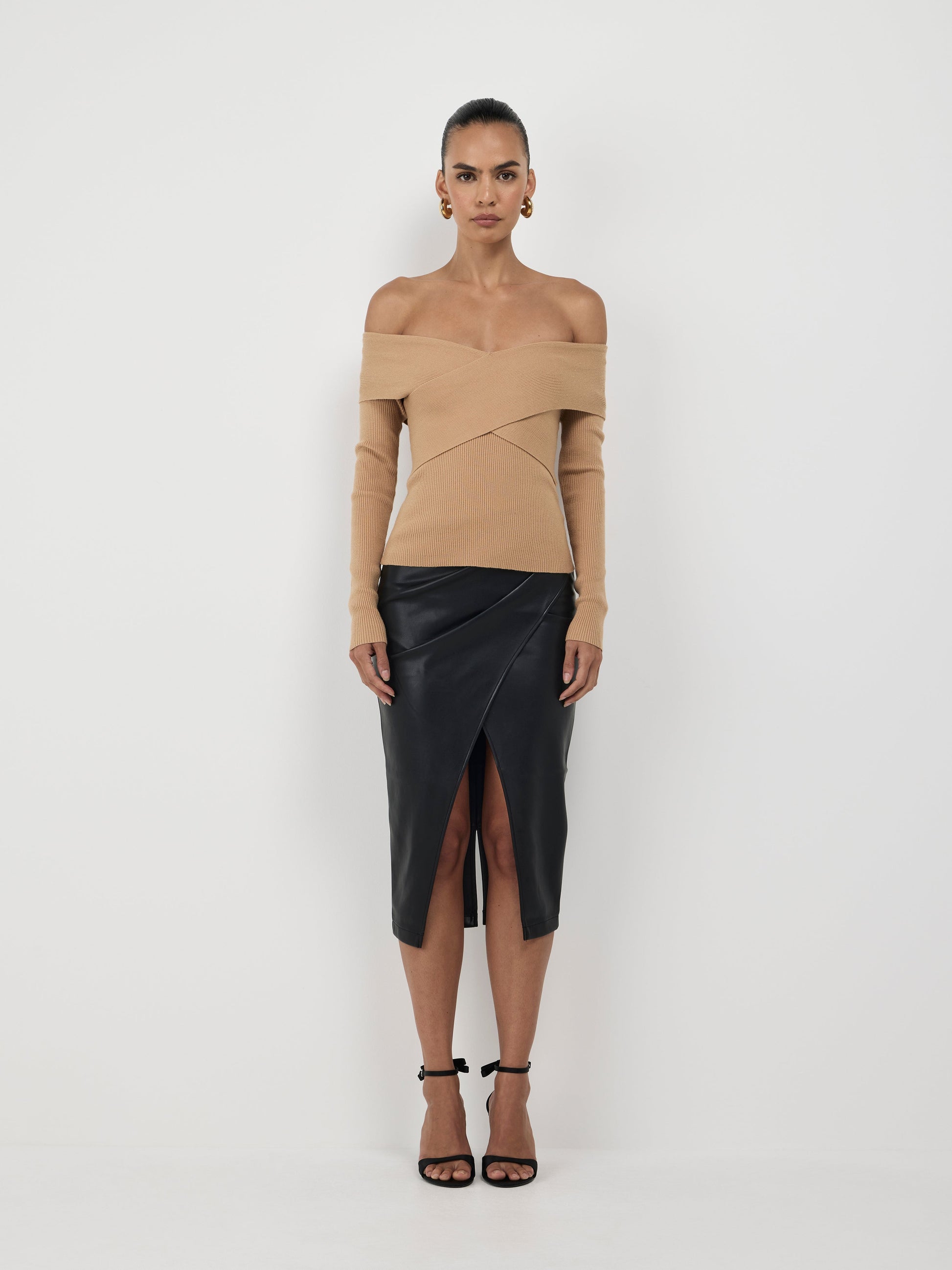 Elevate your basics game with the Valentina knit Top. Featuring a neutral ribbed knit fabrication, off the shoulder neckline, long sleeves and overlay detailing at neck. Pair with our Gotham Skirt to complete the look!