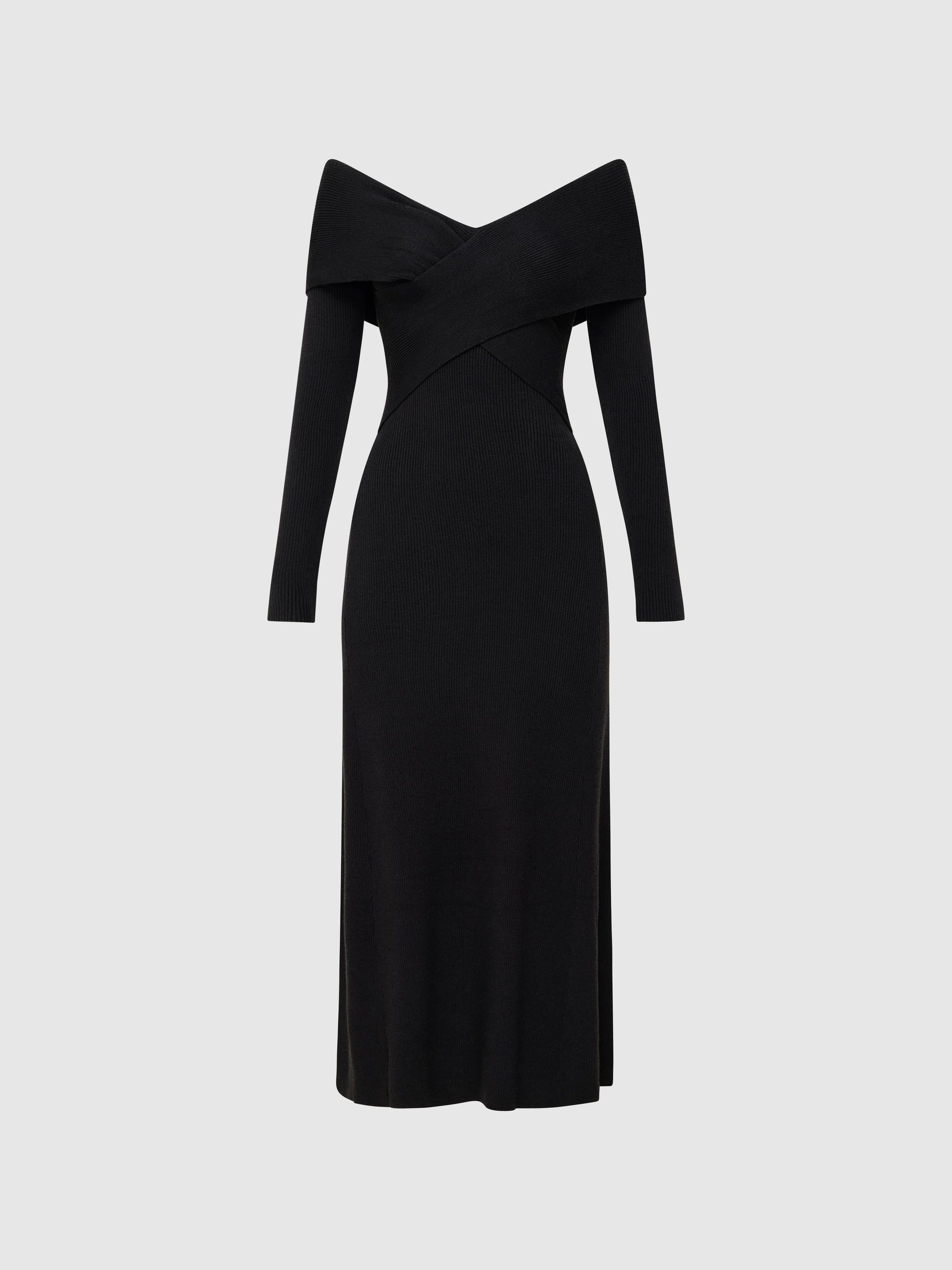 Flattering silhouettes and raven tones make up the effortless Valentina Midi Dress. Showcasing a black ribbed knit fabrication, fit and flare cut, off shoulder neckline with wrap detail, slim long sleeves and midi length skirt. Pair with the Elisa Earrings to complete the look.