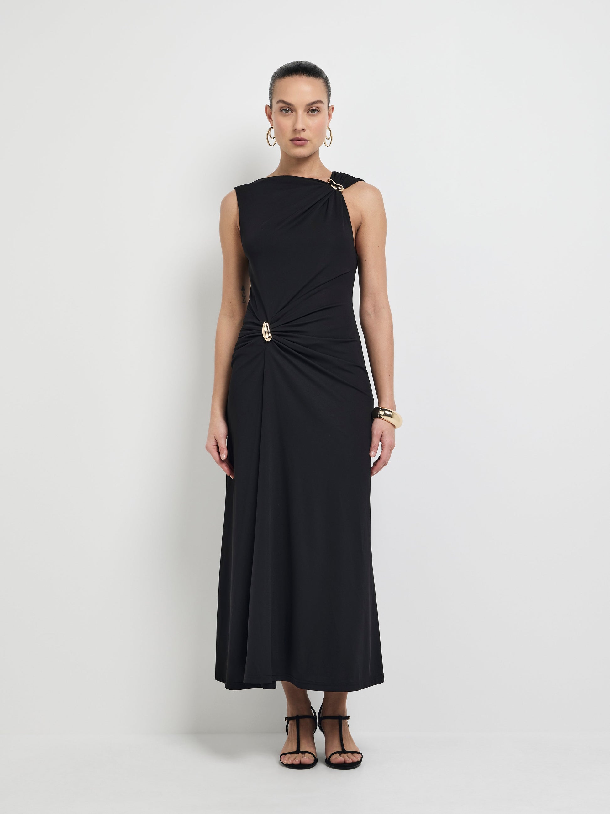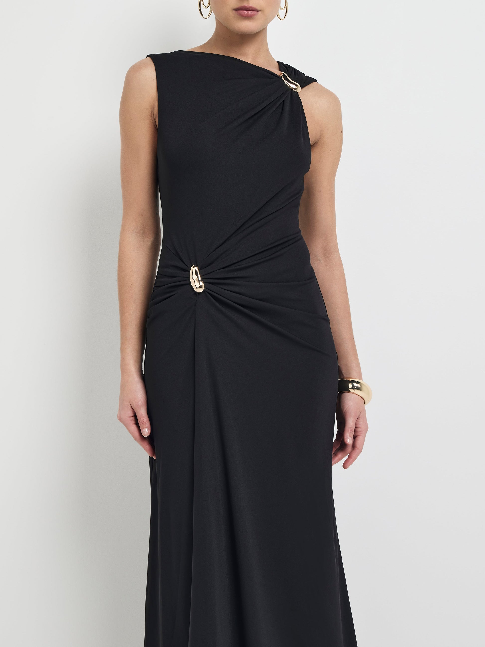 Timeless beauty redefined. Introducing the Xanthe Maxi Dress - showcasing a black stretch fabrication, slim fit styling, asymmetrical high neckline, gathers on bodice and hip, non functional buckle detail on shoulder and hip and midi/maxi skirt length. Pair with our Clara Earrings to complete the look.